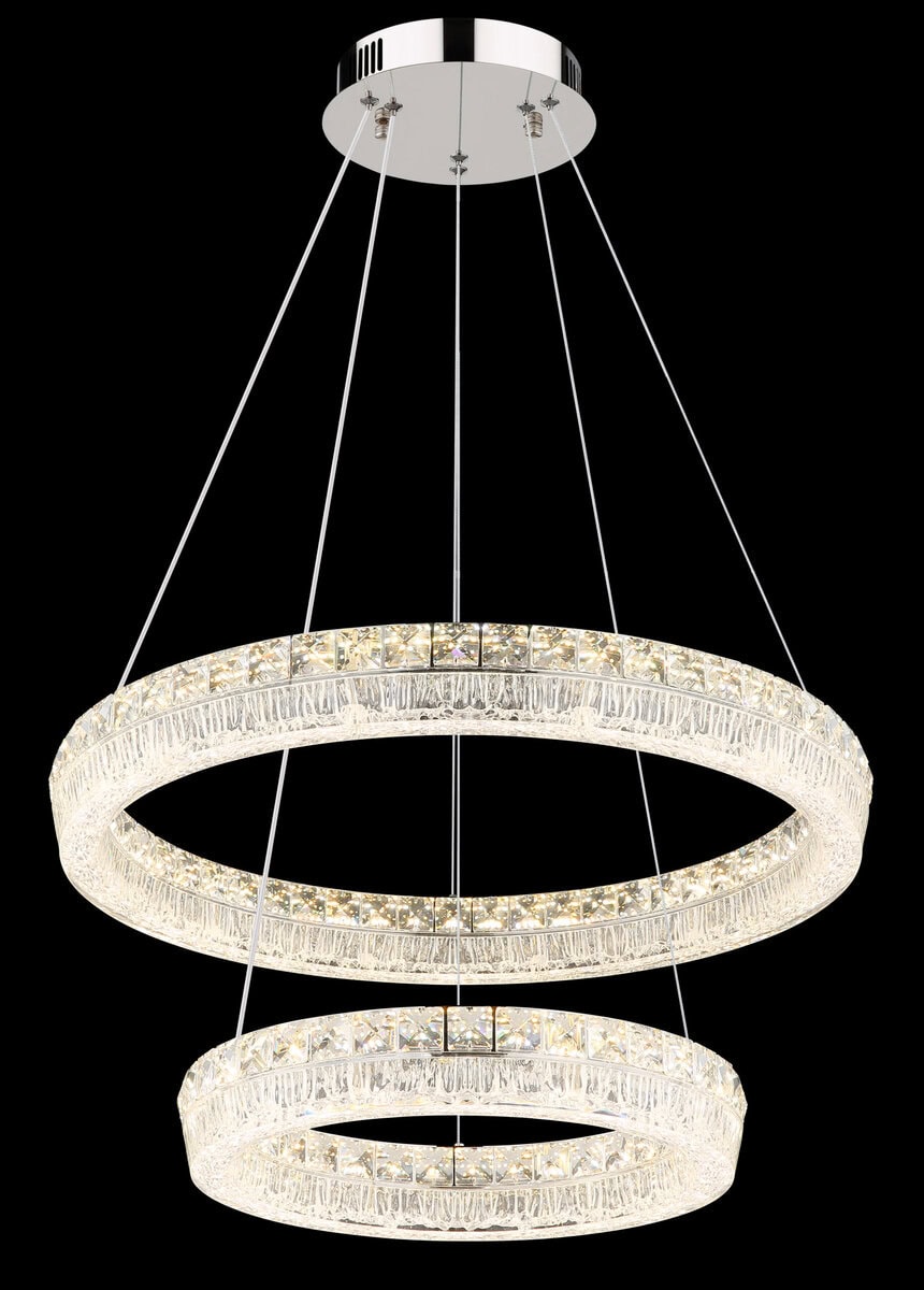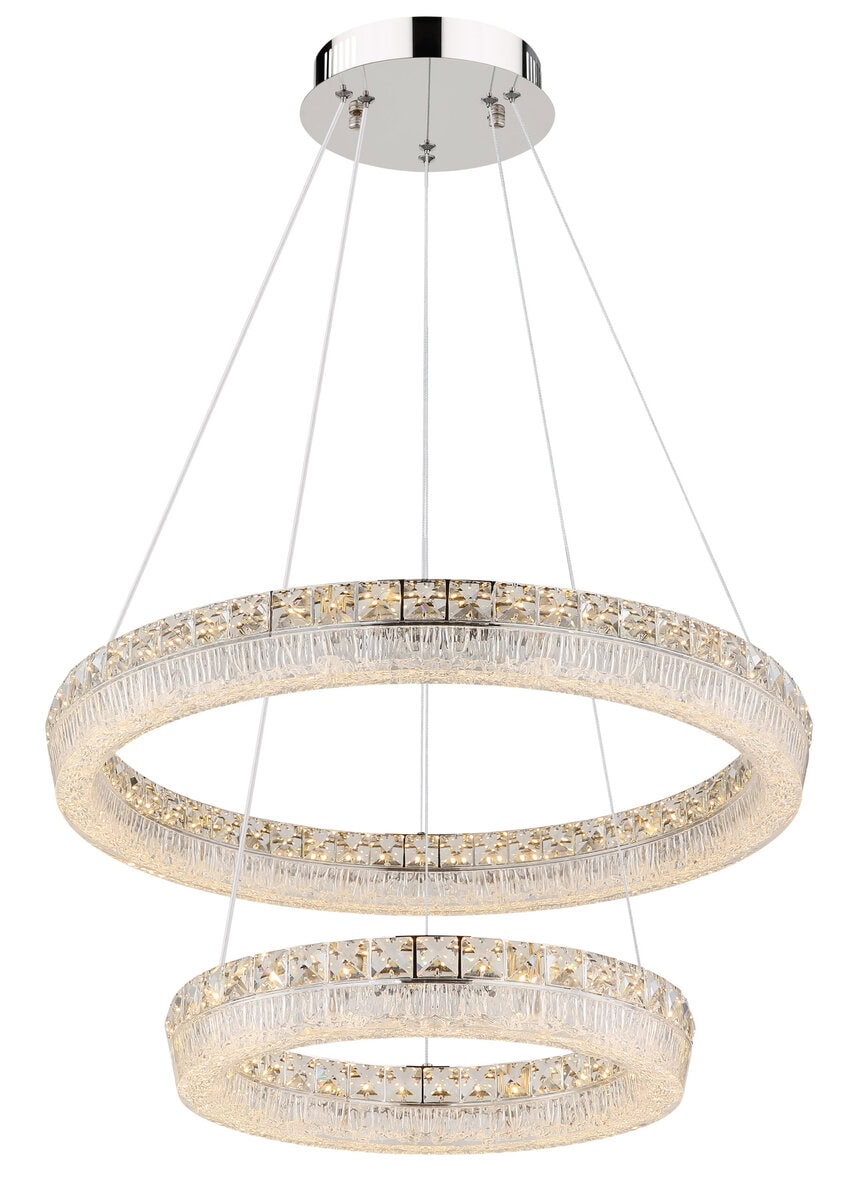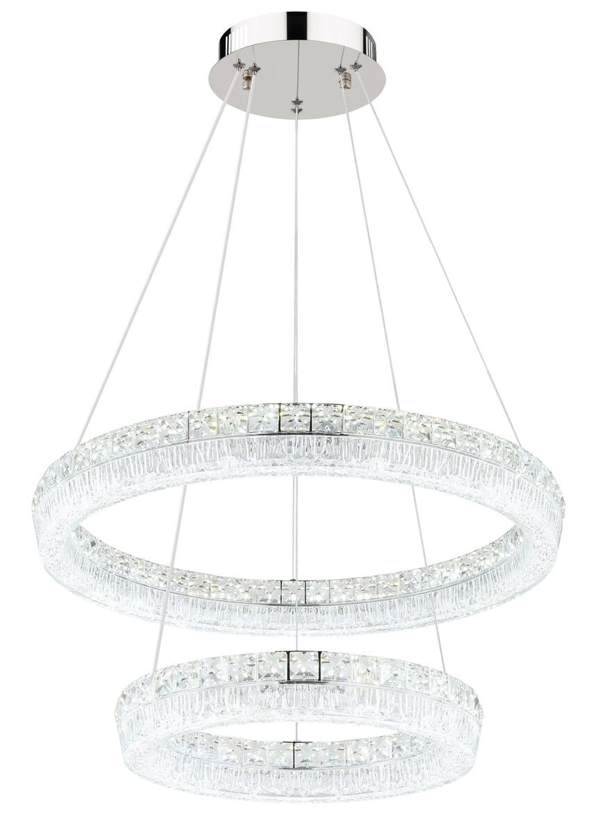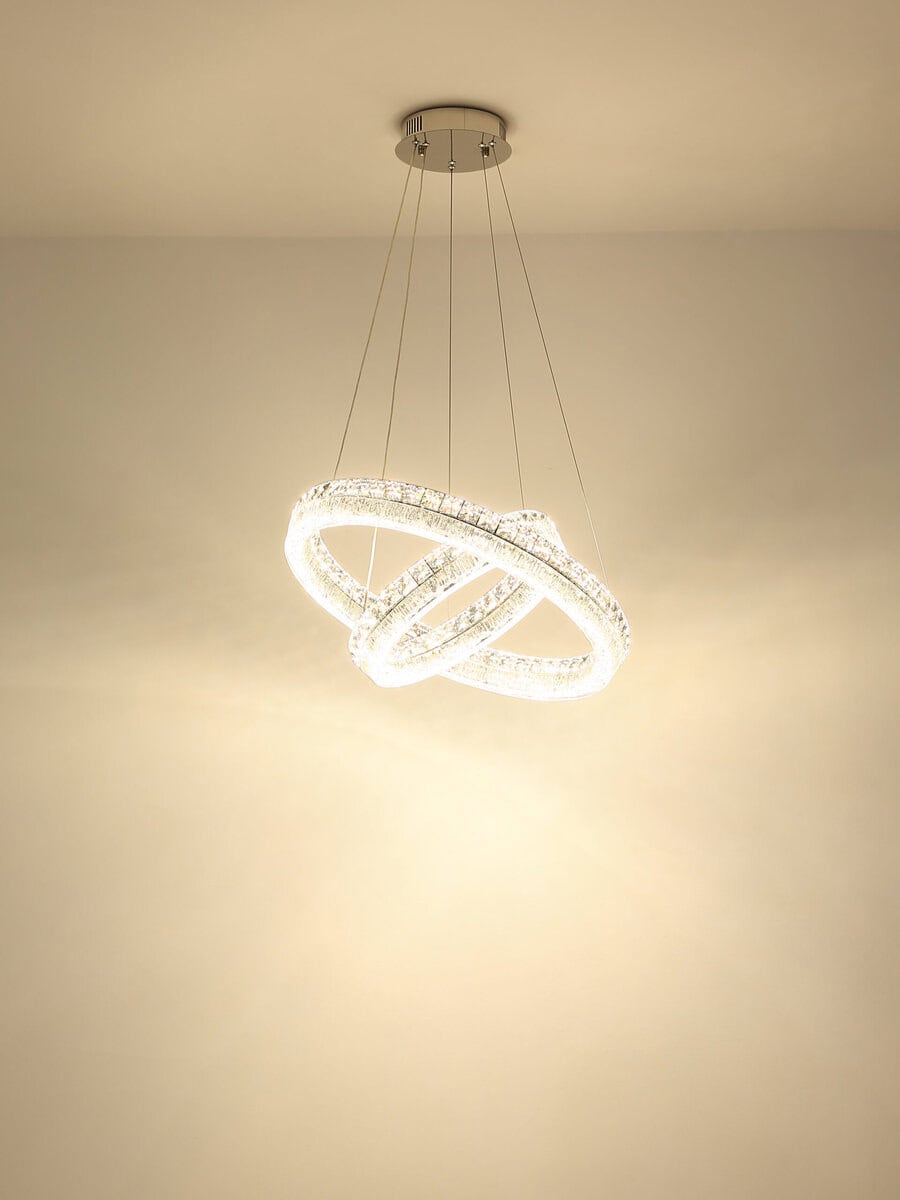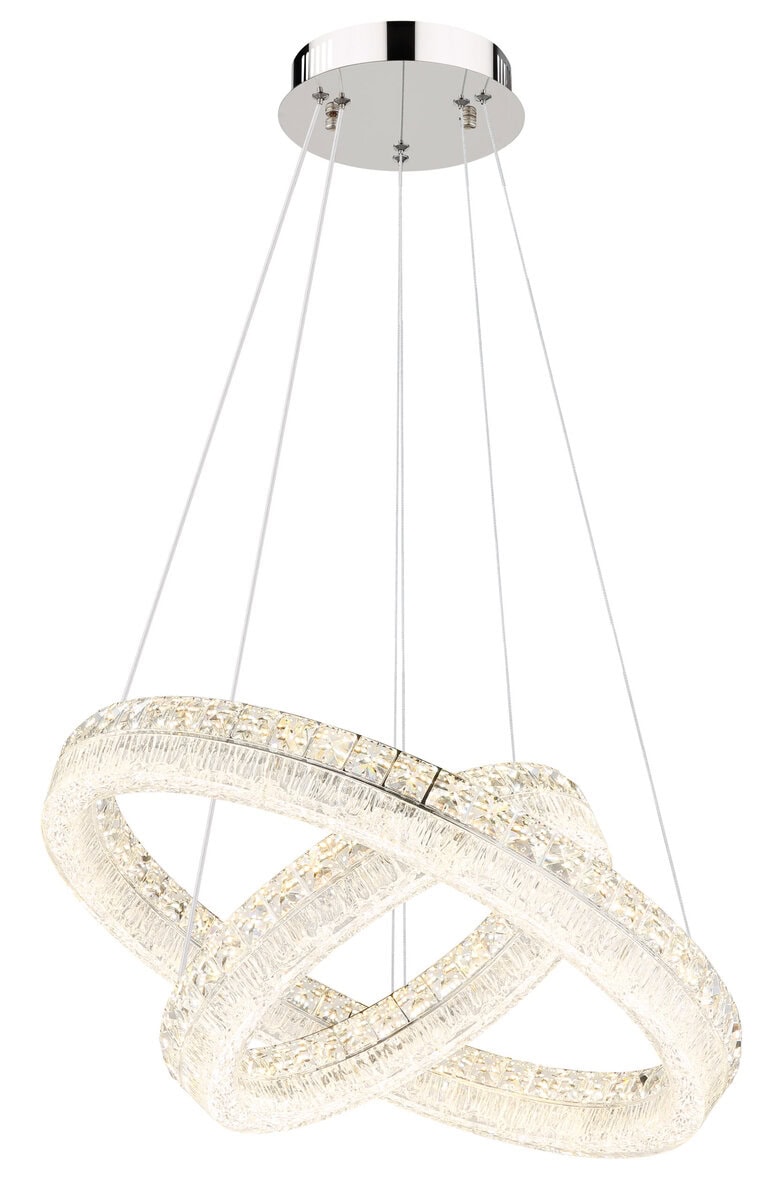 Privjesak LAUREL impresionira svojim modernim, okruglim dizajnom s dva elegantno isprepletena prstena. Kromirani metalni okvir savršeno nadopunjuje prozirnu akrilnu nijansu, koja je naglašena blistavim prozirnim staklenim kristalima koji stvaraju elegantne svjetlosne efekte. Sa prečnikom od 600 mm, ova lampa je prava privlačnost za oči u svakoj prostoriji.