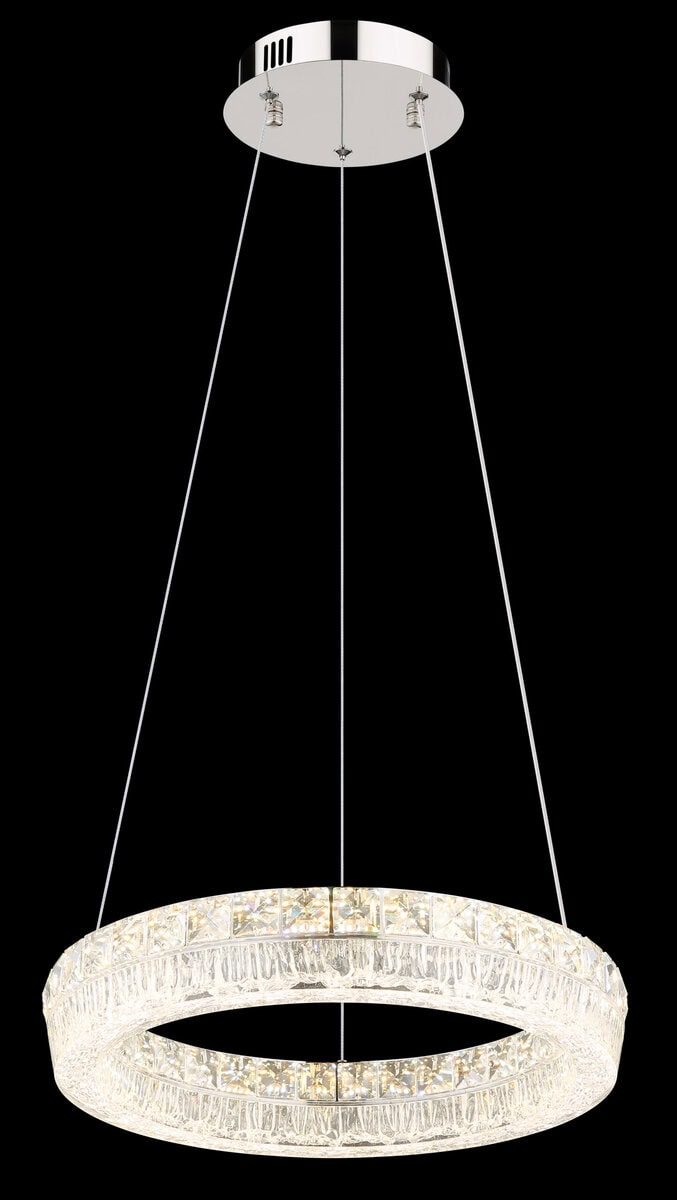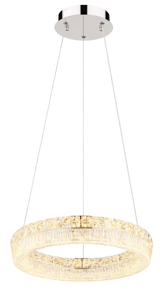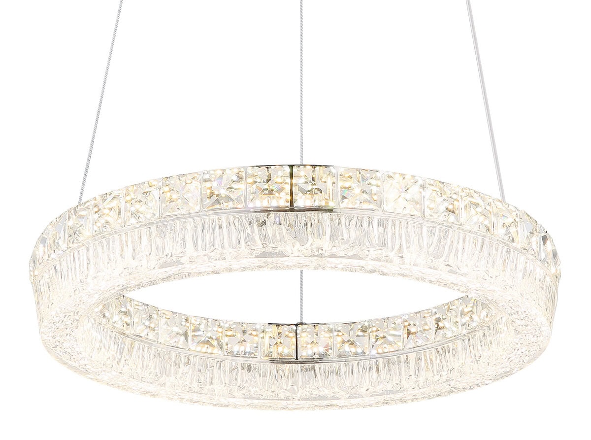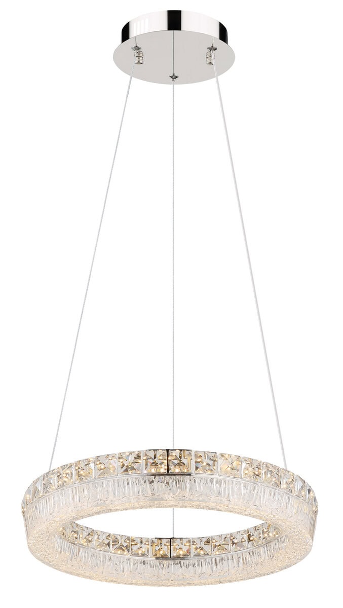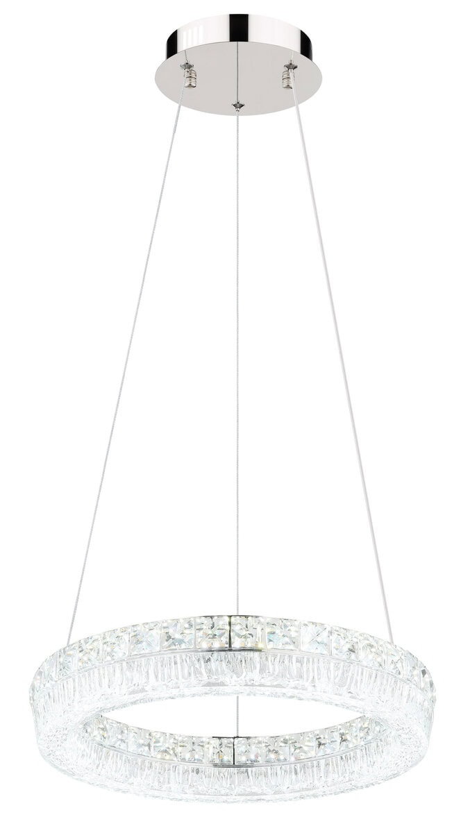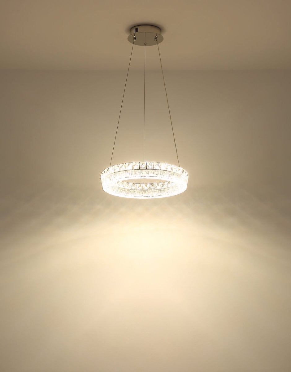 Viseća lampa LAUREL impresionira svojim modernim, okruglim dizajnom i visokokvalitetnim materijalima. Kromirani metalni okvir i prozirna akrilna nijansa stvaraju elegantan izgled, dok ugrađeni stakleni kristali dodaju fascinantne svjetlosne akcente. Sa prečnikom od ø 400 mm i svetlosnom snagom od 2500 lumena, LAUREL je idealan za dnevne i trpezarijske prostore.