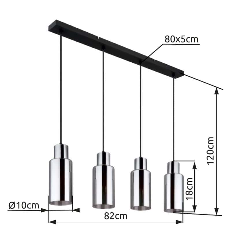 Viseća lampa je izrađena od metala u crnoj mat i stakla u dimnim bojama. Ima crni PVC kabel i podesiv je po visini. Dimenzije su DxŠxV: 820x100x1200mm. Za svetiljku su potrebne 4 sijalice E27 maksimalne snage 25W i napona 230V, koje nisu uključene. Ova visilica je prava privlačnost za oči i učiniće da vaš dom zablista u novom sjaju. Nadamo se da ćete biti zadovoljni ovom visećom lampom.