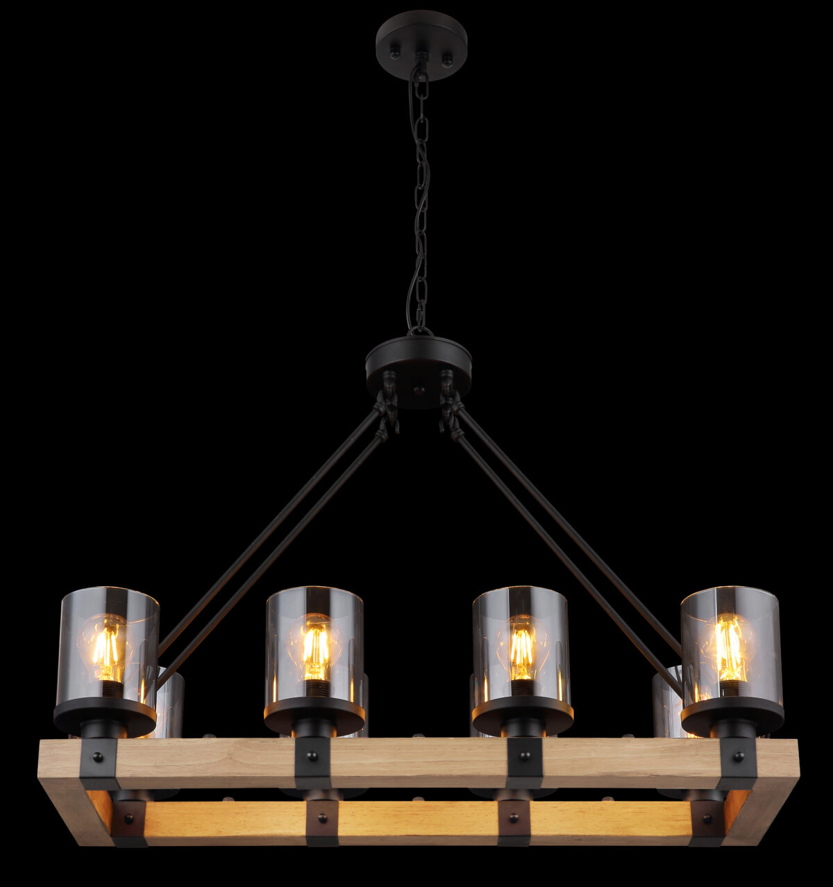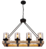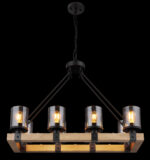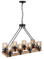 Ova prekrasna visilica inspirira sjajnim, staromodnim dizajnom. Oblikovan lanac se proteže od okruglog plafonskog priključka do četiri crna užad, koja podupiru drveni okvir (75 x 31,5 cm). Na drvenom okviru se nalazi 8 utičnica E27, svaka sa sjenilom u boji dima u obliku cilindra. Zahvaljujući slobodnom izboru izvora svjetlosti, možete sami odrediti boju svjetla ili svjetlinu do maksimalne snage od 60 vati. Postavite nove akcente u svoje prostorije.