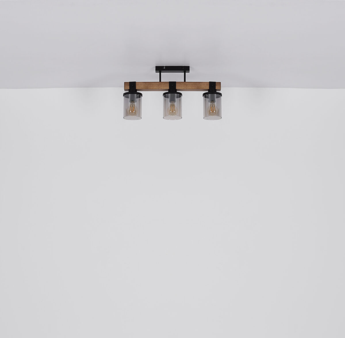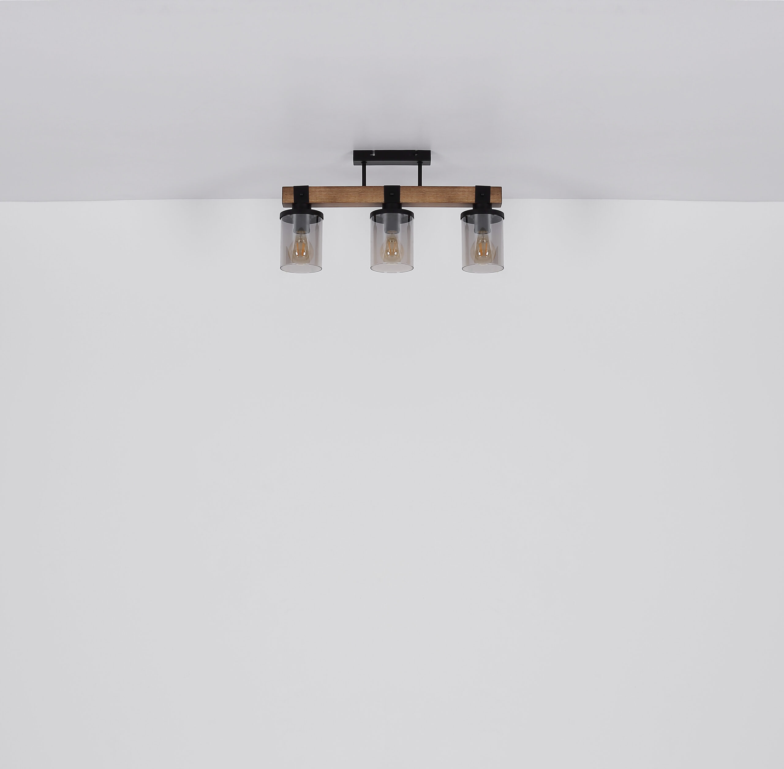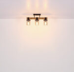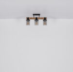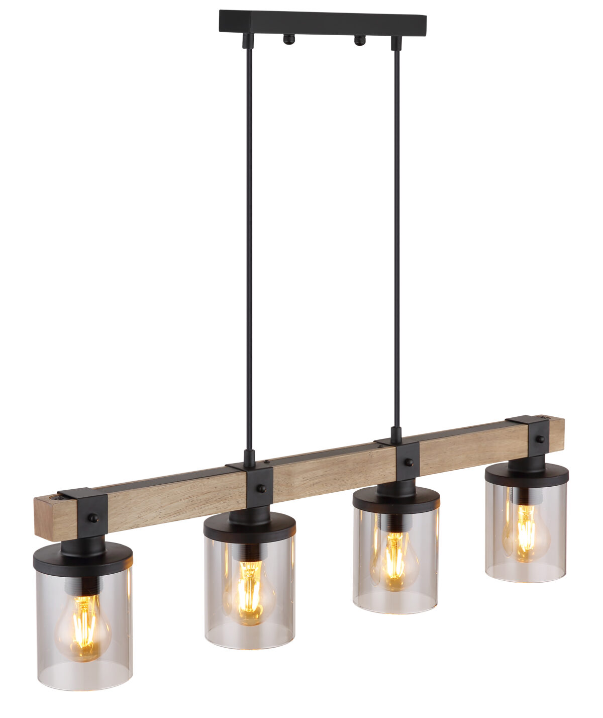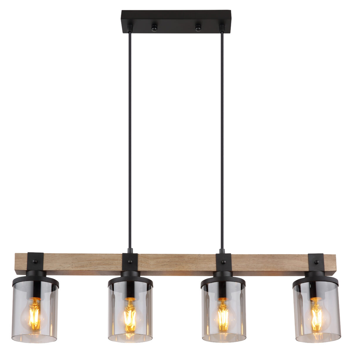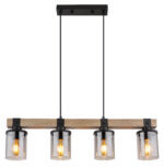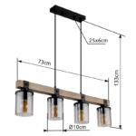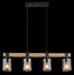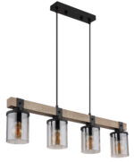 Ova prekrasna viseća lampa inspirira odličnim dizajnom. Dva crna kabla idu od uskog plafonskog priključka do 73 cm dugog drvenog prtljažnika. Na drvenom okviru se nalaze 4 utičnice E27, svaka sa sjenilom u boji dima u obliku cilindra (Ø10cm). Zahvaljujući slobodnom izboru izvora svjetlosti, možete sami odrediti boju svjetla ili svjetlinu do maksimalne snage od 60 vati. Postavite nove akcente u svoje prostorije.