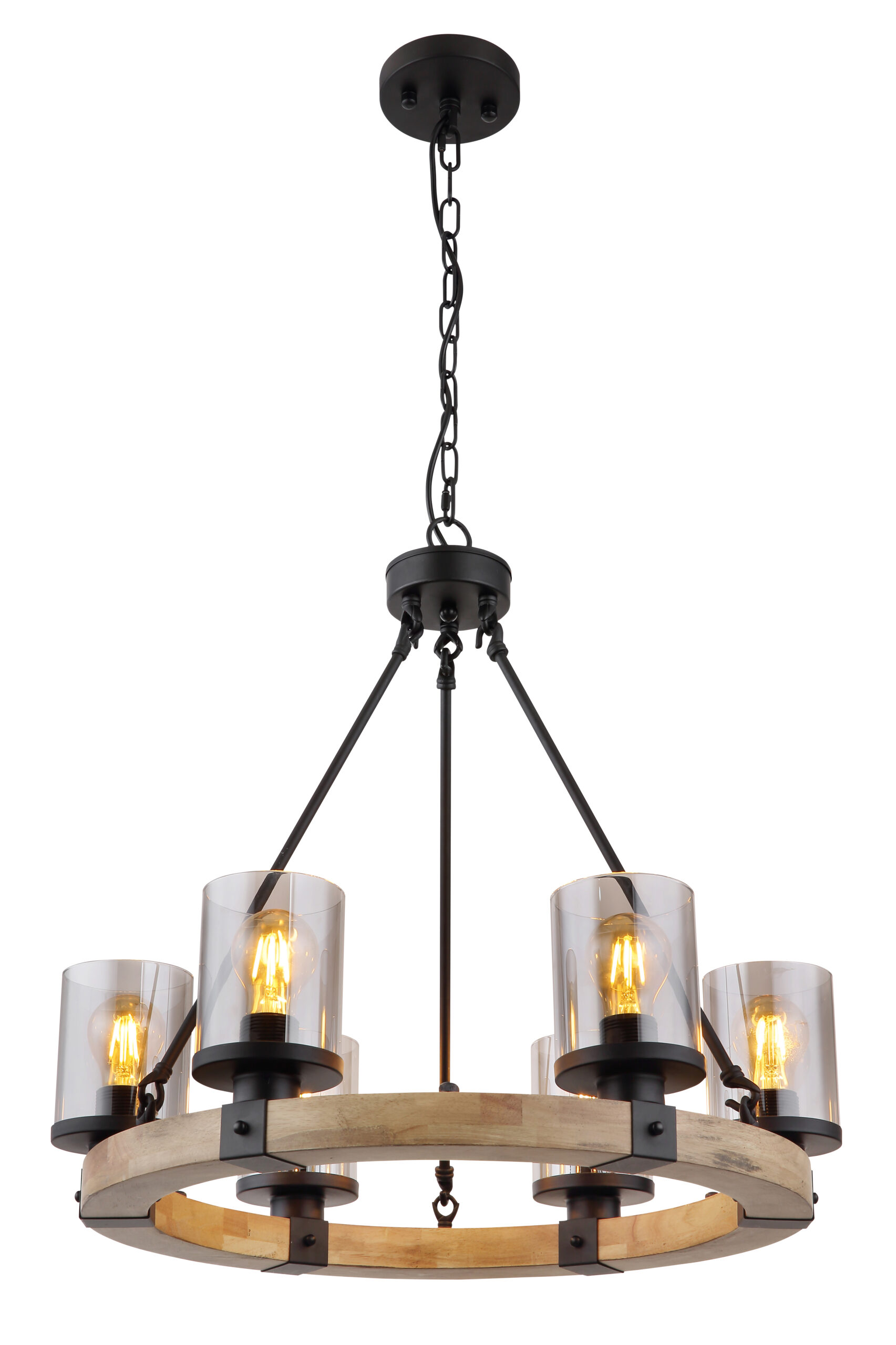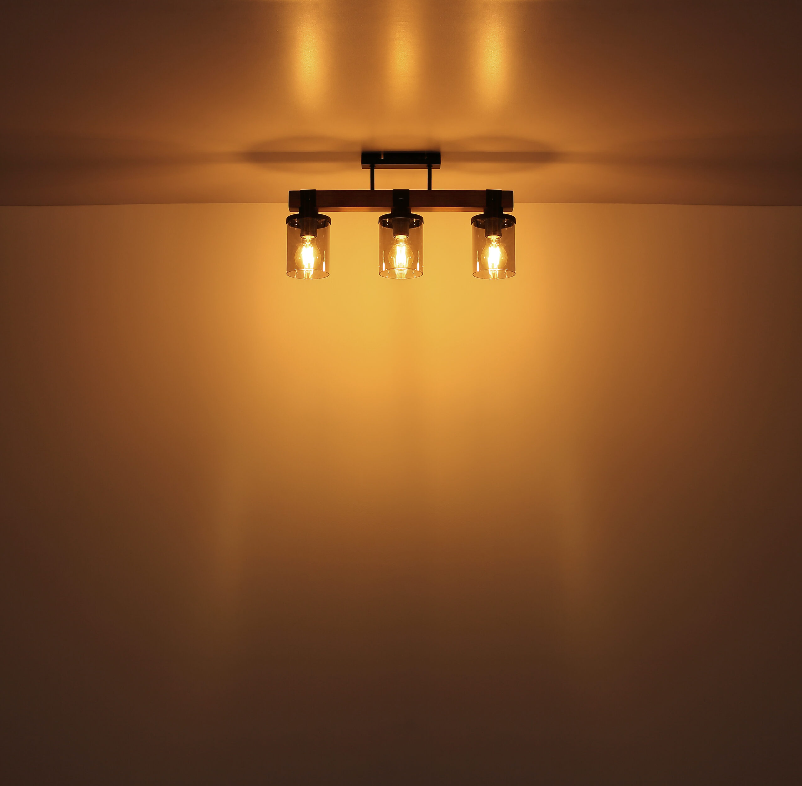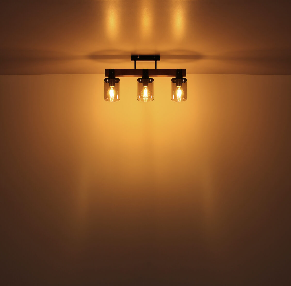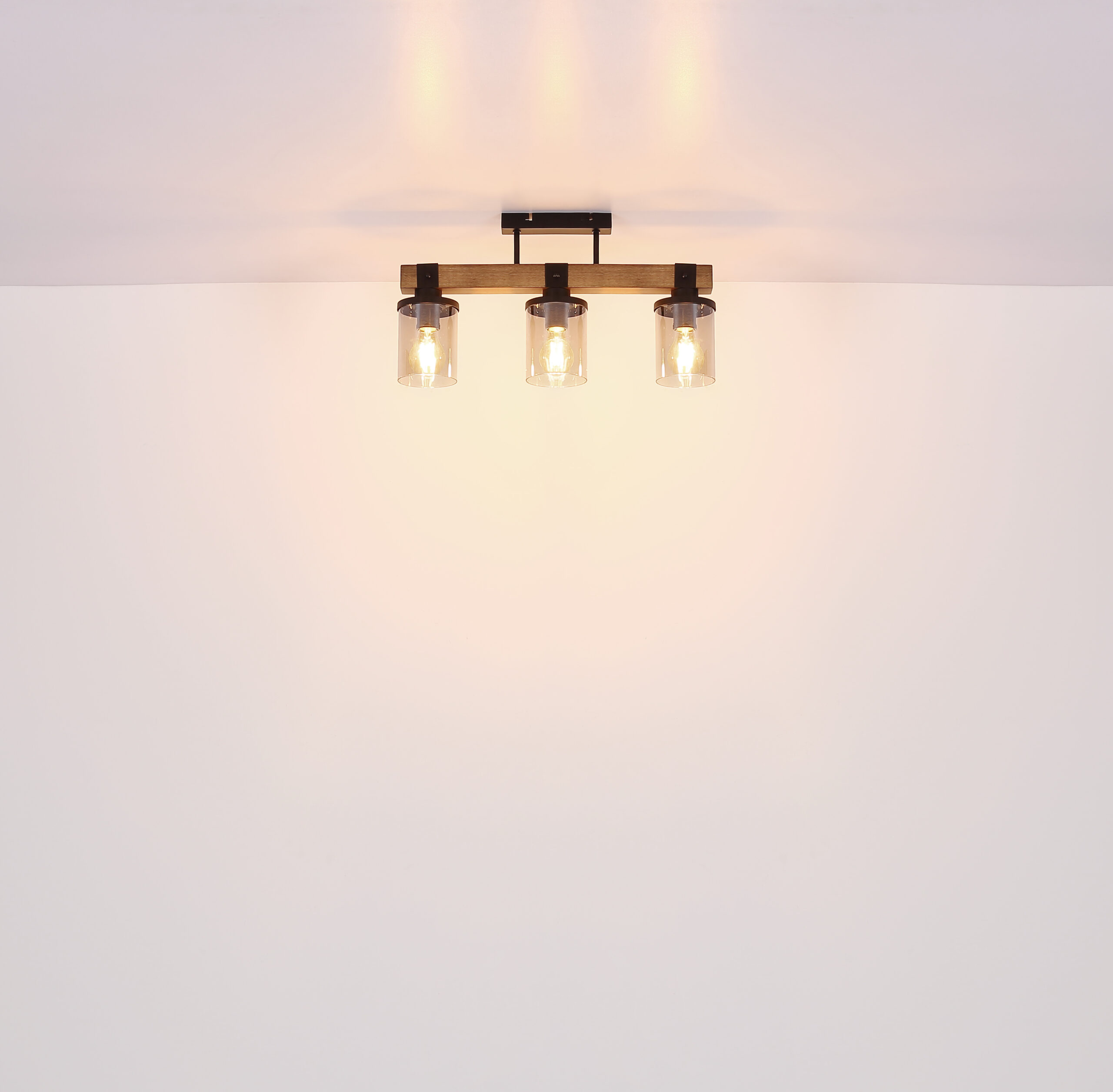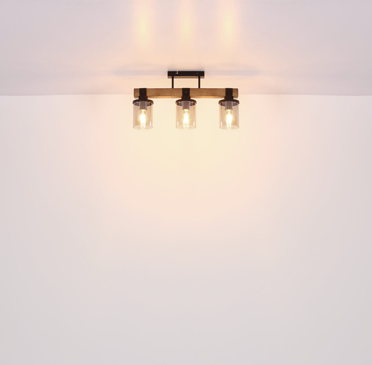 Ova prekrasna viseća lampa inspirira odličnim dizajnom. Dva crna kabla idu od uskog plafonskog priključka do 73 cm dugog drvenog prtljažnika. Na drvenom okviru se nalaze 4 utičnice E27, svaka sa sjenilom u boji dima u obliku cilindra (Ø10cm). Zahvaljujući slobodnom izboru izvora svjetlosti, možete sami odrediti boju svjetla ili svjetlinu do maksimalne snage od 60 vati. Postavite nove akcente u svoje prostorije.