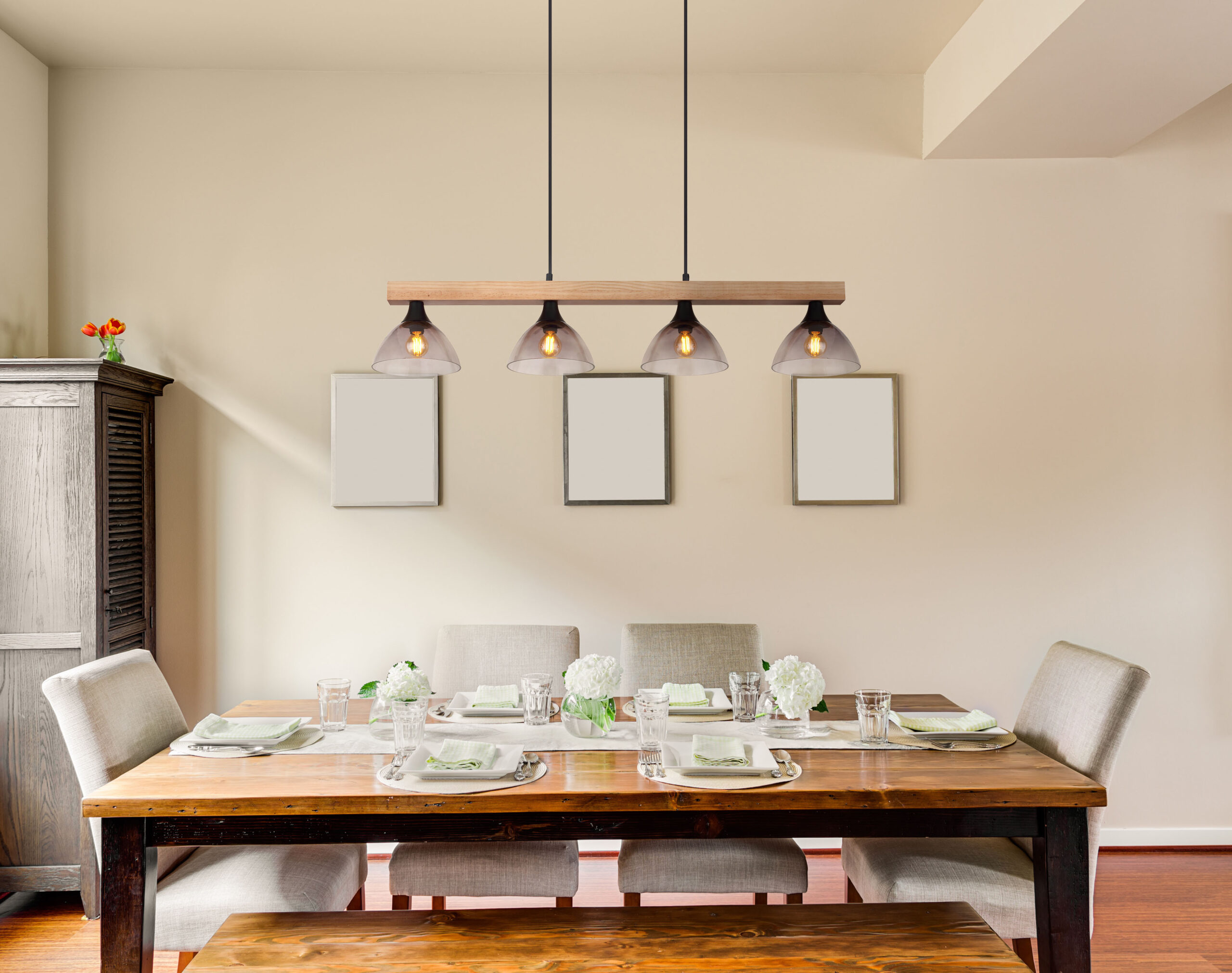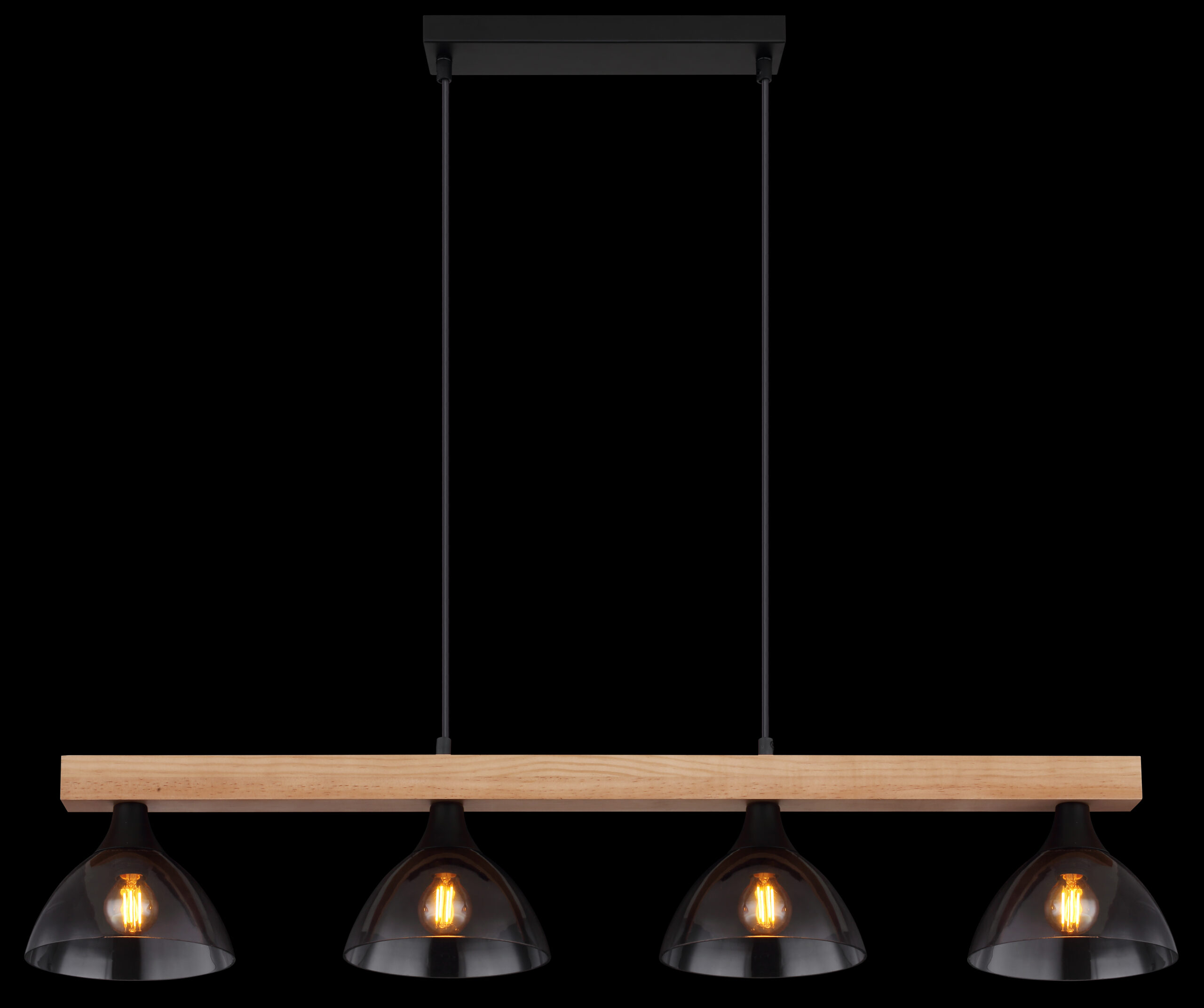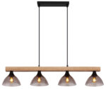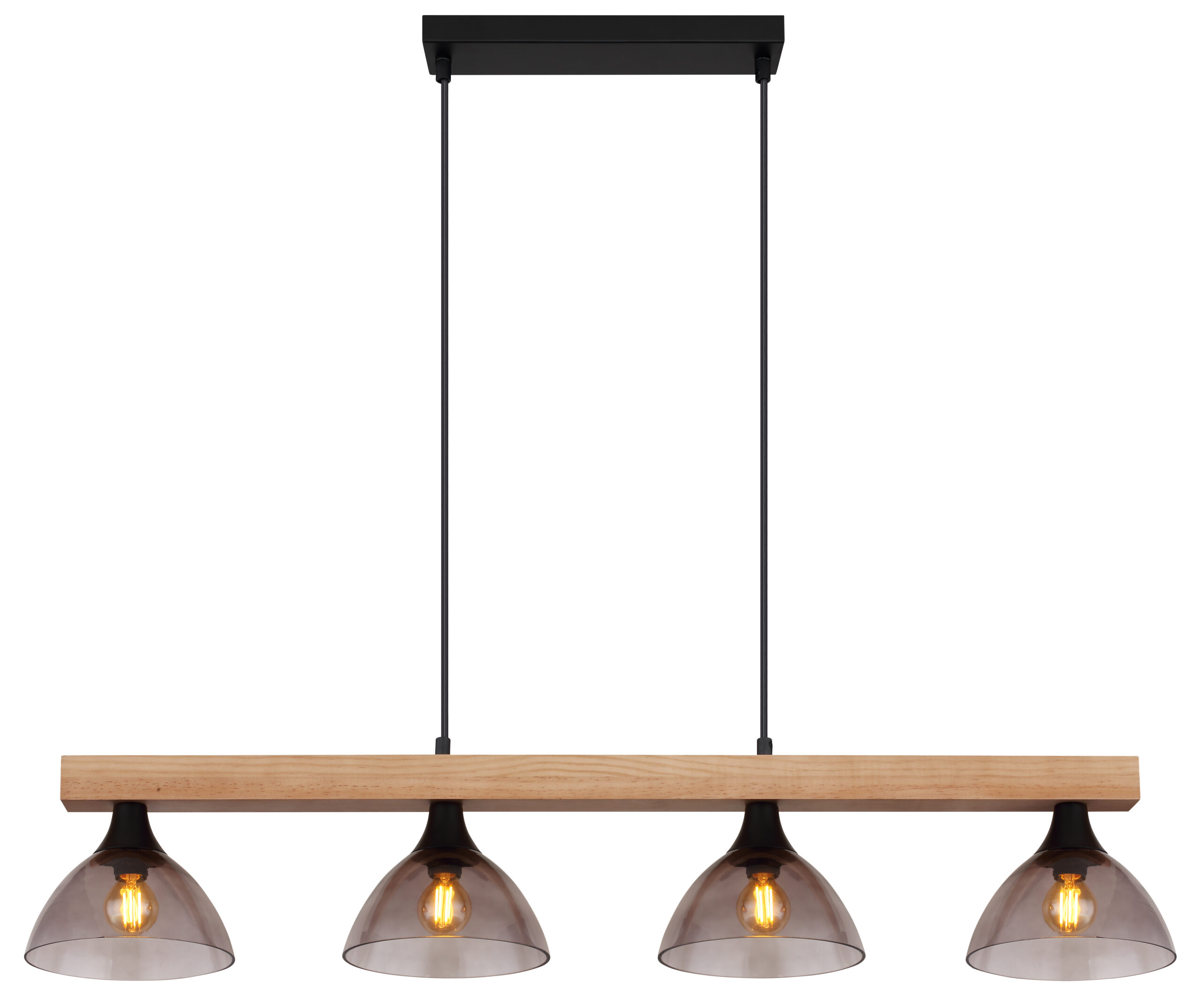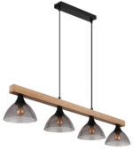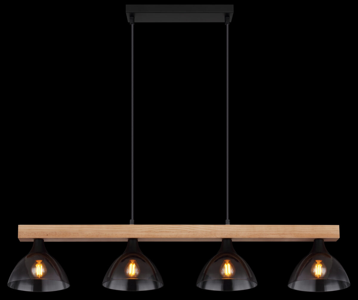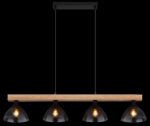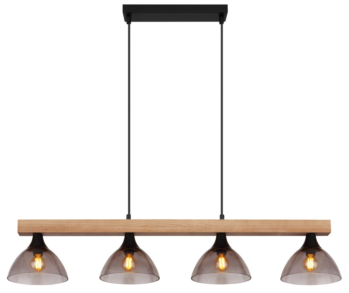 Ova sjajna visilica serije LINDI impresionira svojim elegantnim dizajnom. Dva kabla dužine 1,2 m vire iz pravougaonog crnog plafonskog priključka i formiraju drvenu gredu dugu 96 cm. Opremljen je sa četiri E27 utičnice i svaka sa zadimljenim staklenim sjenilom. E27 utičnice vam omogućavaju da sami odredite boju svjetla i svjetlinu do maksimalne snage od 15 vati. Zbog dugovečnosti i uštede energije preporučujemo LED sijalice.