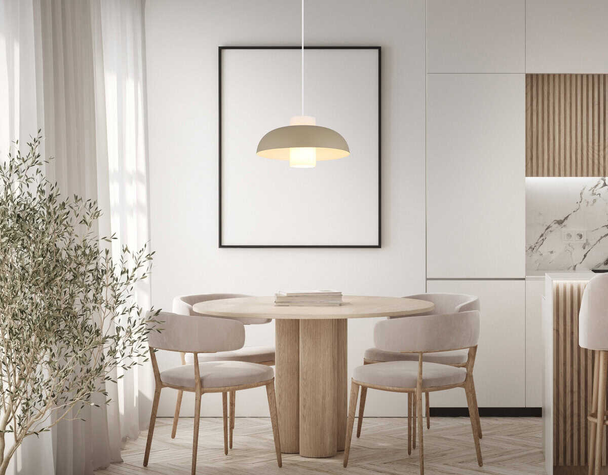 Viseća lampa KOEN unosi topli ambijent u vaše sobe sa svojim ravnim, okruglim sjenilom i cilindrom od opalnog stakla iznutra. Mat metalna nijansa i tijelo boje pijeska savršeno se uklapaju u stil života koji voli prirodu. Ova svetiljka je pogodna za sijalicu E27 (ekskluzivno).