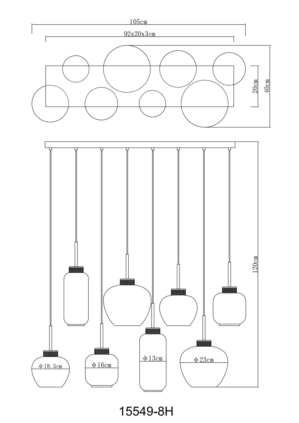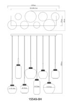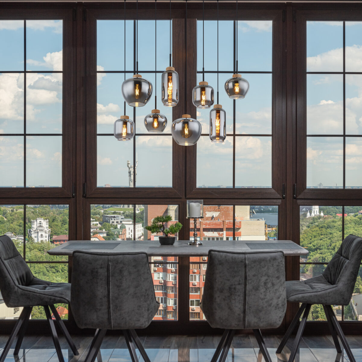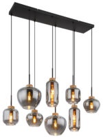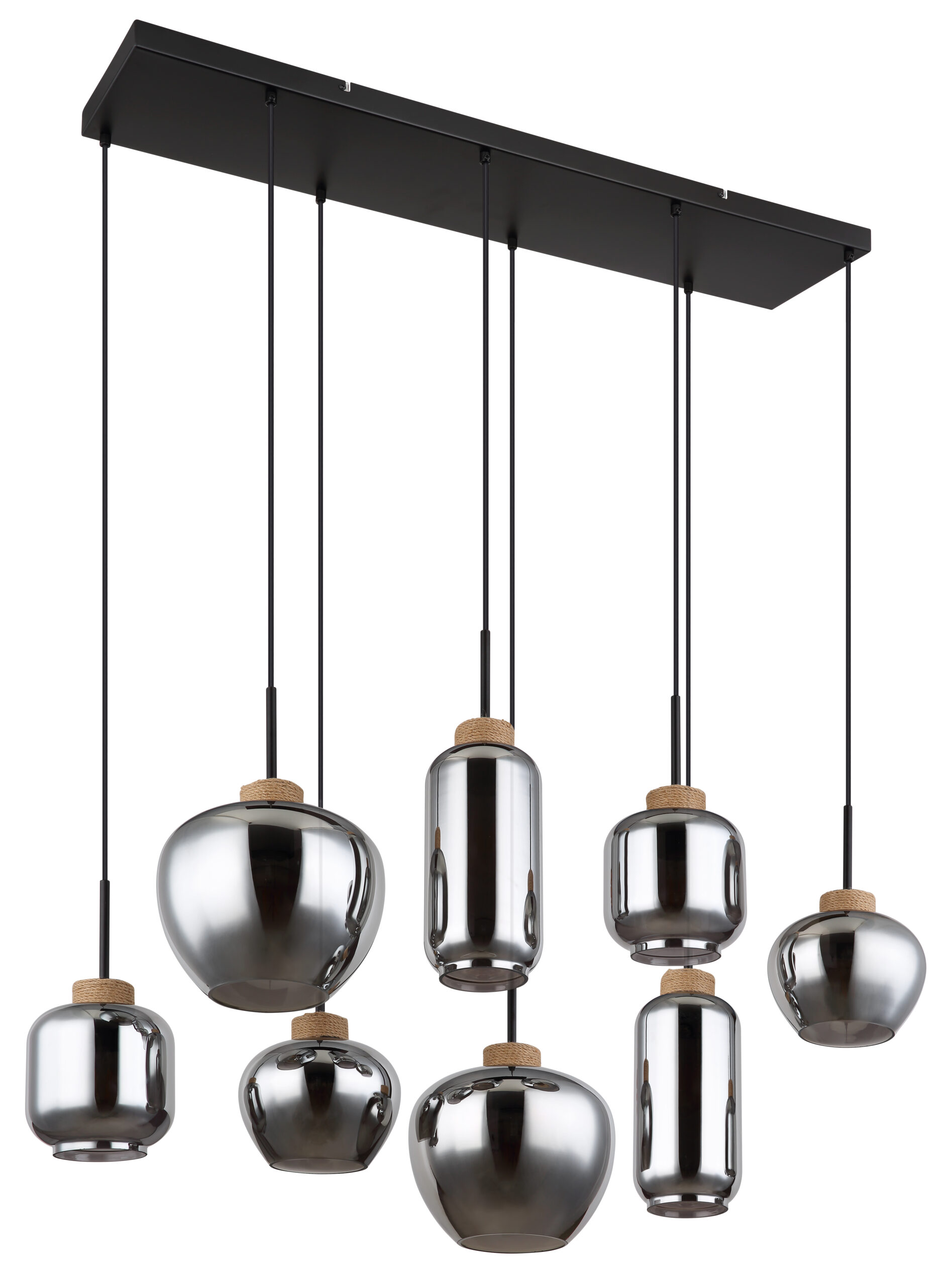 Ova visilica MATT izrađena je od crnog metala sa staklima u boji dima. Osam visećih čaša su individualne po svojoj prezentaciji i veličini. Ova umetnička lampa prečnika 120 cm ima osam grla E27 (sa maksimalno 40 vati), što omogućava slobodan izbor sijalica. Zbog dugotrajnosti i uštede energije preporučujemo LED sijalice. Ova viseća lampa je idealna za vaš dnevni boravak i trpezariju.