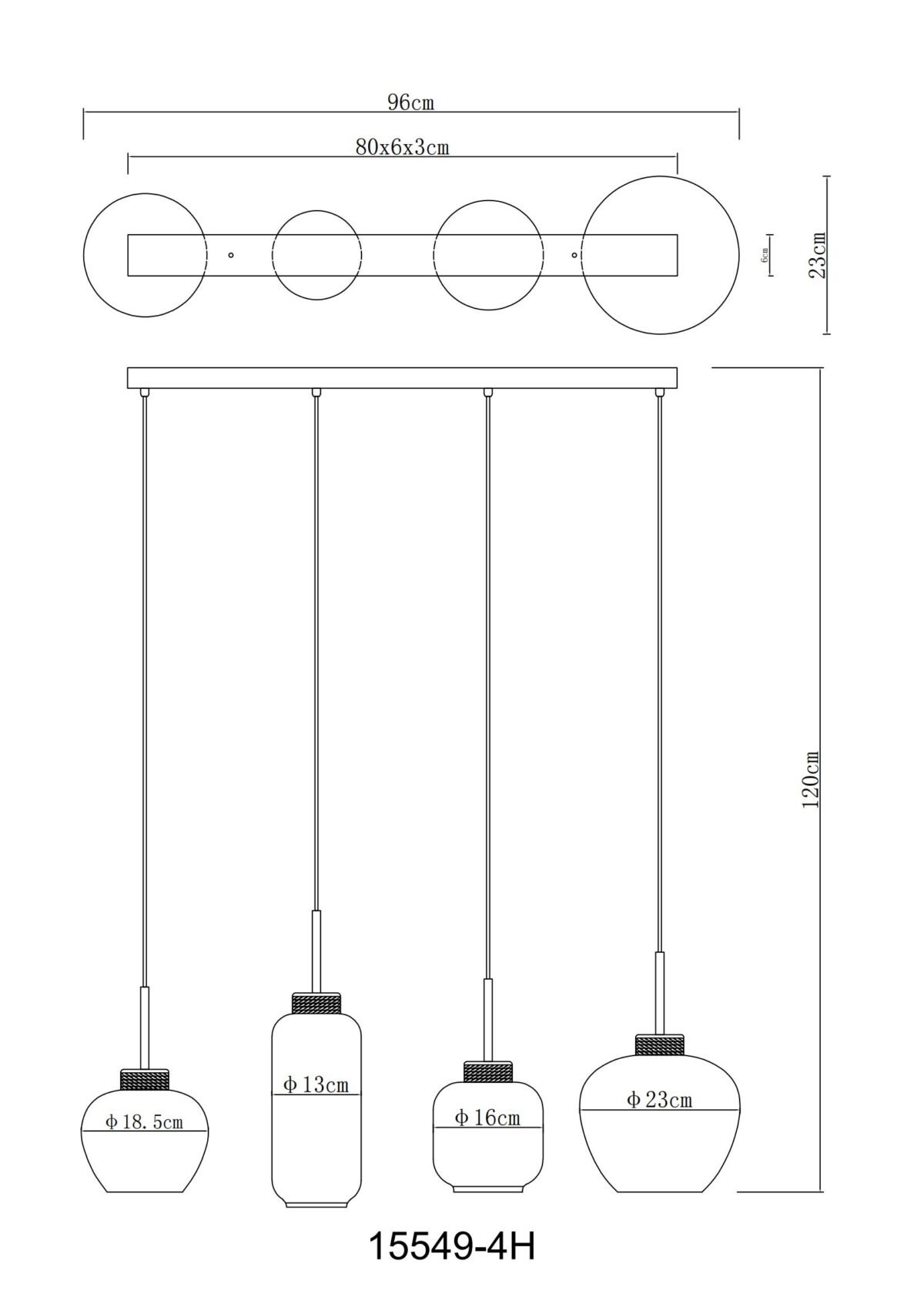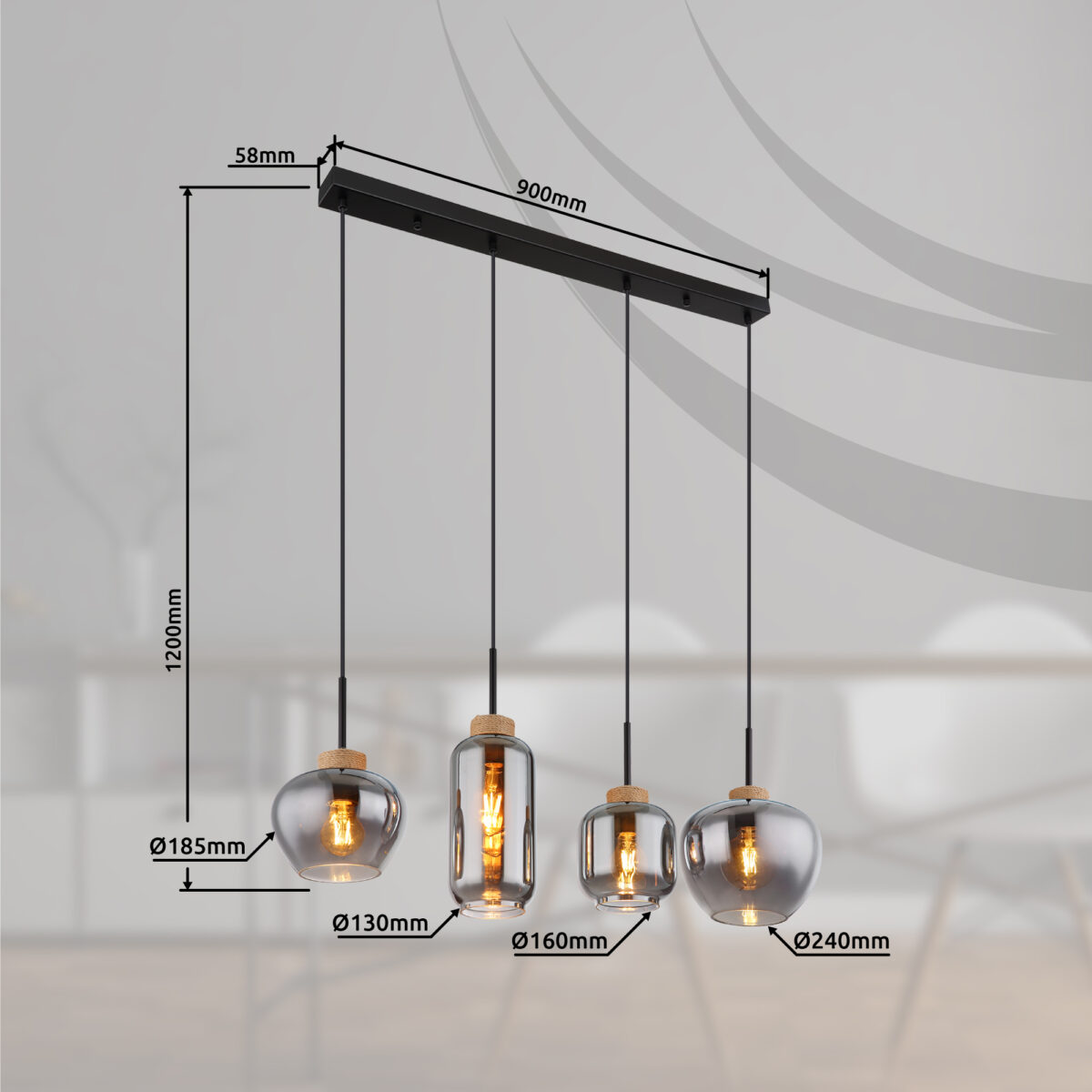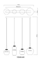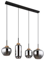 Ova visilica dužine 96 cm MATT izrađena je od crnog metala sa staklima u boji dima. Četiri viseće čaše su individualne po svojoj prezentaciji i veličini. Ova umetnička lampa prečnika 120 cm ima četiri grla E27 (sa maks. 40 vati), koja omogućavaju slobodan izbor sijalica. Zbog njihove izdržljivosti i uštede energije preporučujemo LED izvor svjetlosti. Ova viseća lampa je idealna za vaš dnevni boravak i trpezariju.