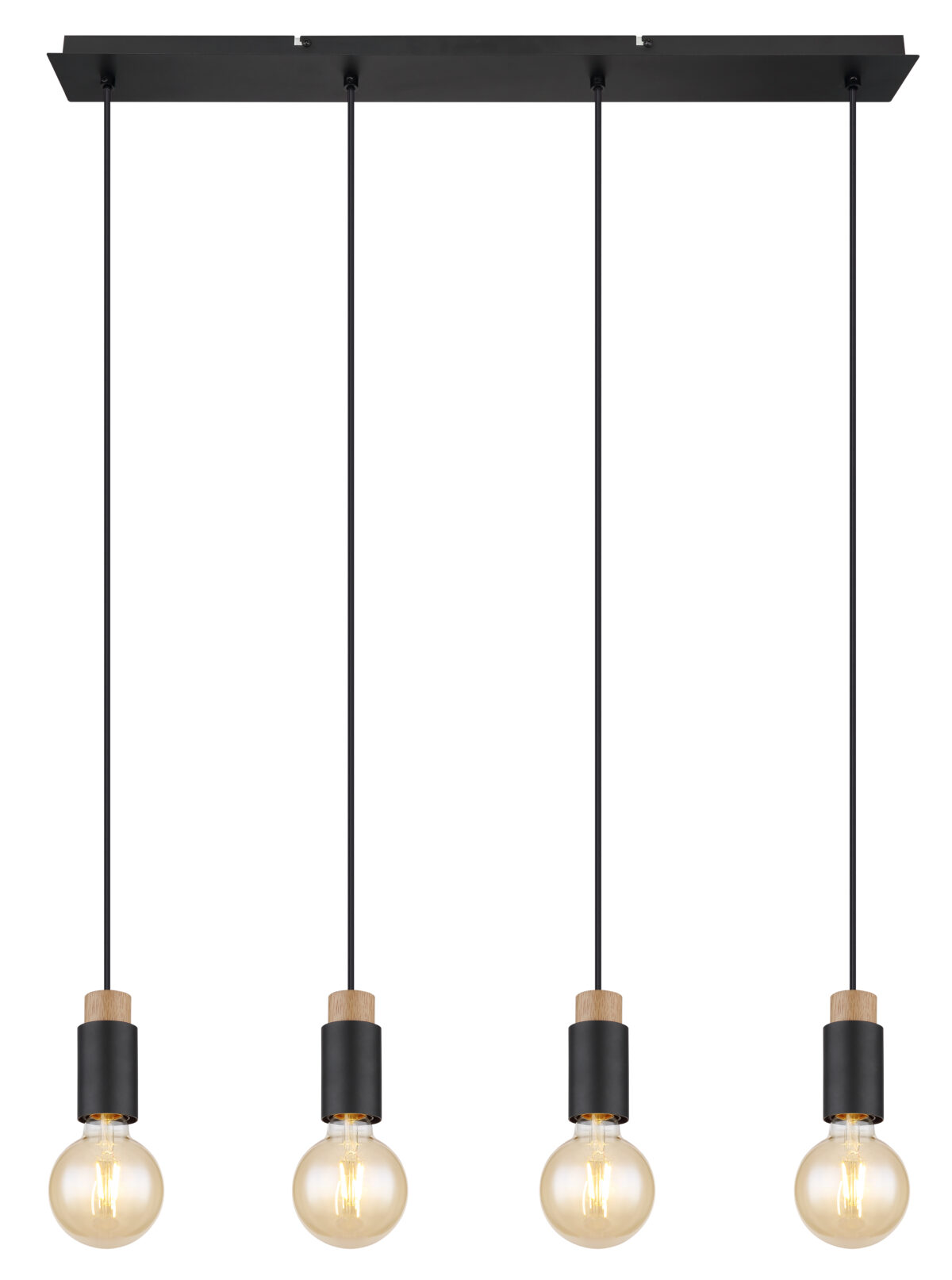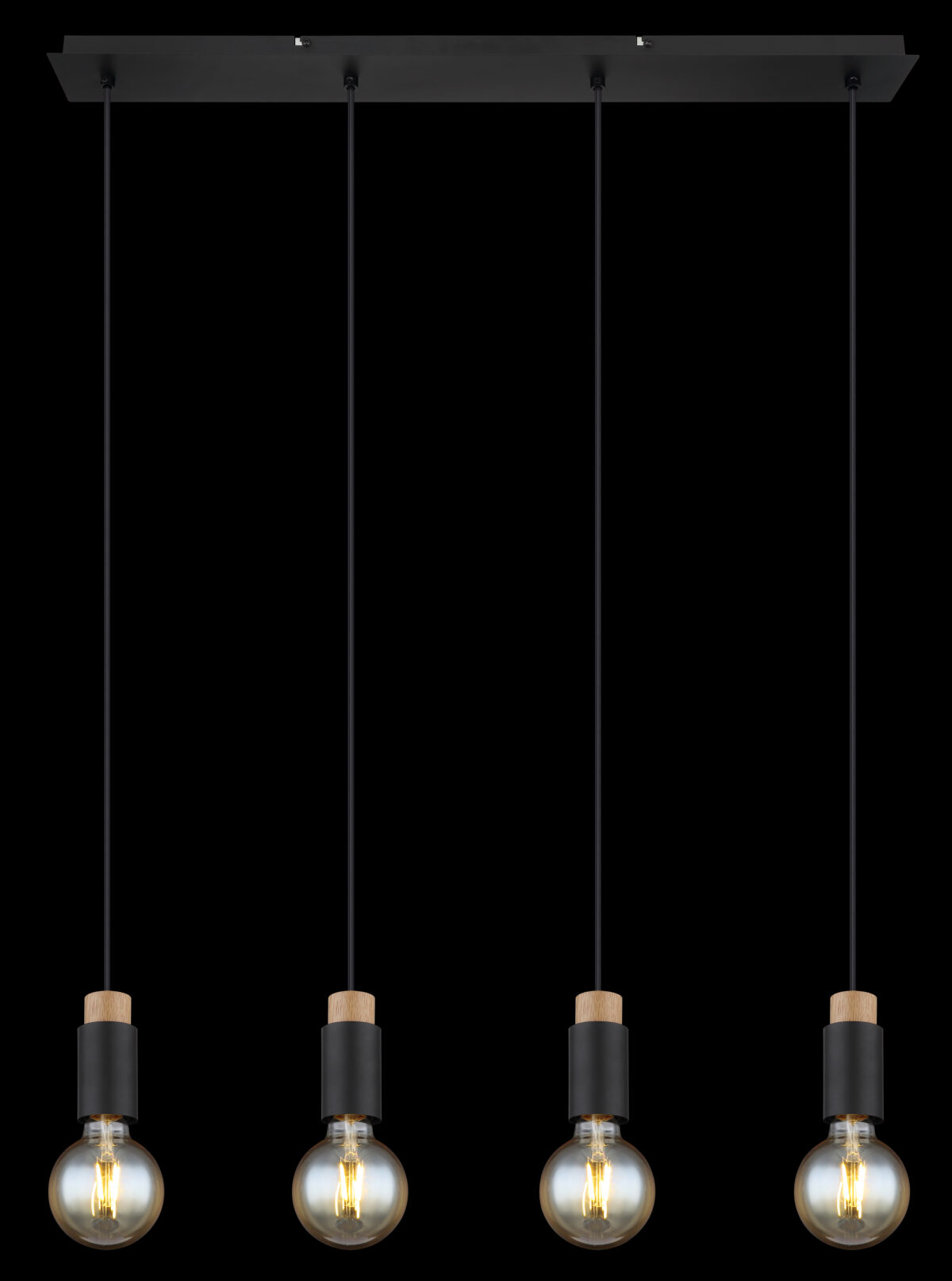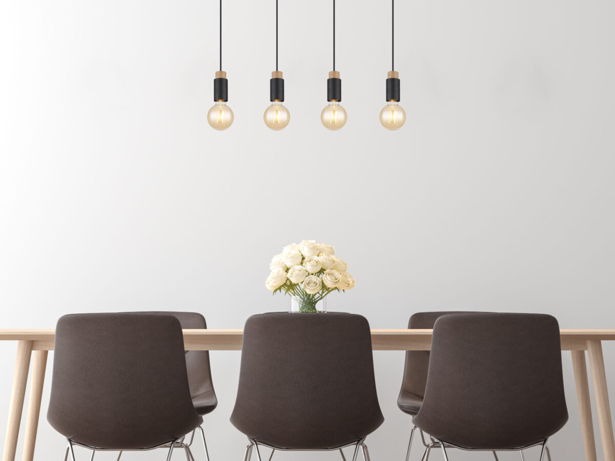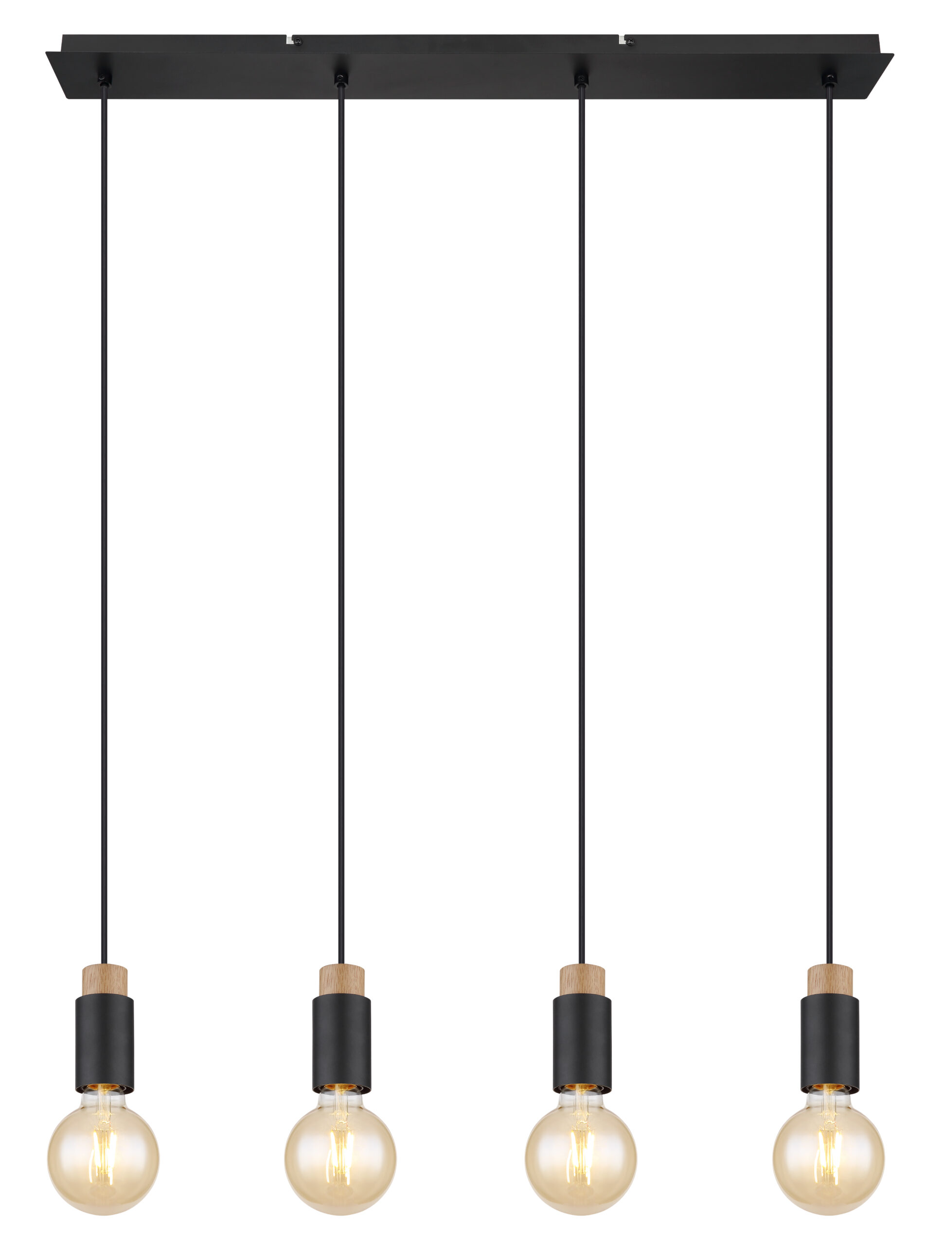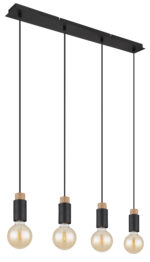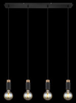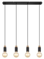 Ova prekrasna visilica inspirira svojim jednostavnim dizajnom. Četiri crna kabla duga 1,2 m vire iz crnog mat pravougaonog plafonskog priključka (8x75cm), od kojih svaki završava na E27 utičnici. Četiri E27 utičnice sa sjajnim ukrasima u drvetu i metalu omogućavaju vam da sami odlučite o boji svjetla i svjetlini do maksimalne snage od 40 vati. Zbog dugotrajnosti i uštede energije preporučujemo LED sijalice.