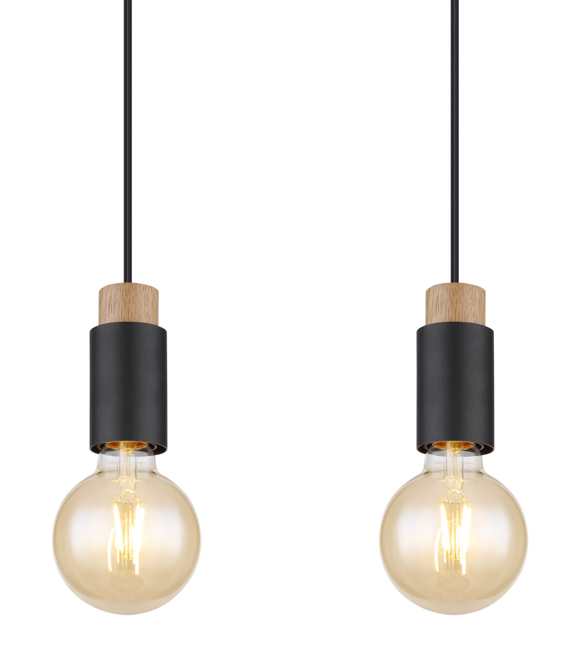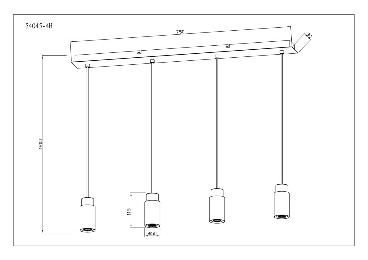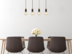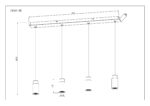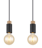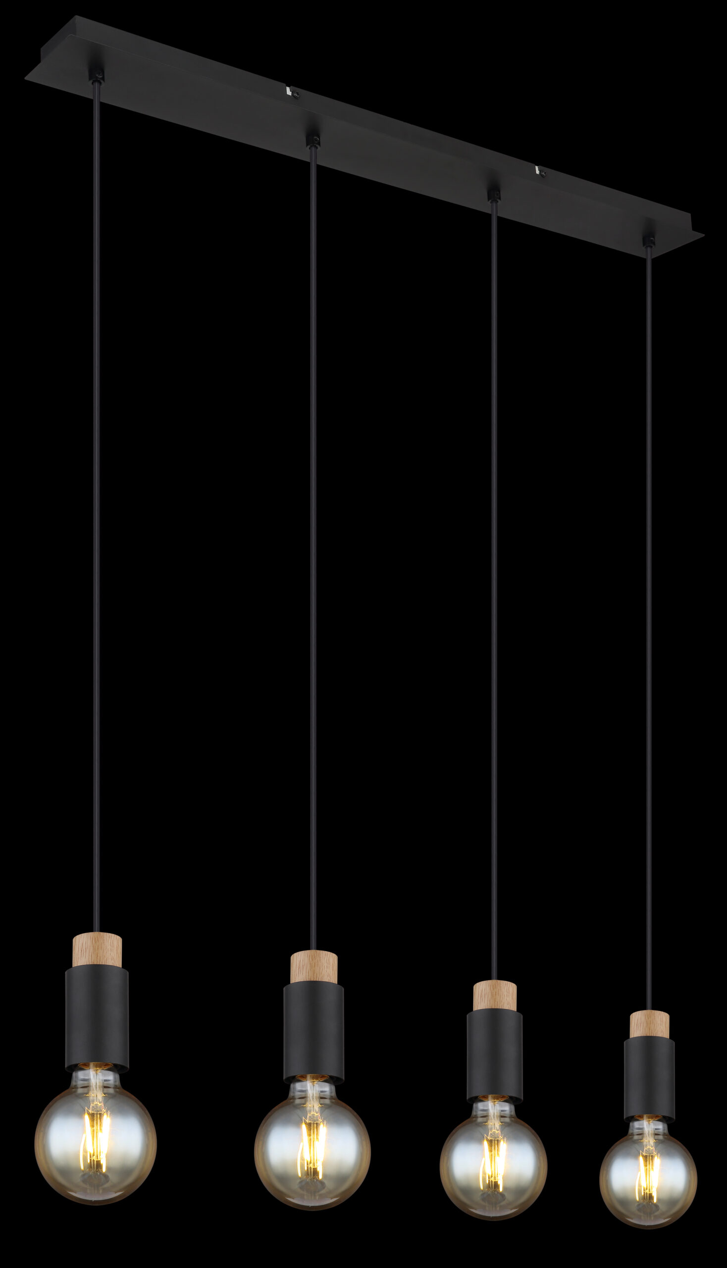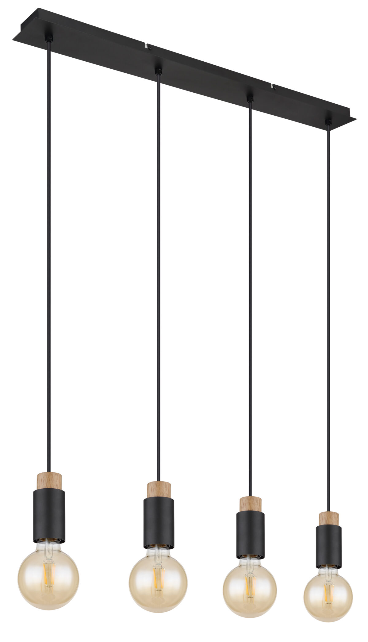 Ova prekrasna visilica inspirira svojim jednostavnim dizajnom. Četiri crna kabla duga 1,2 m vire iz crnog mat pravougaonog plafonskog priključka (8x75cm), od kojih svaki završava na E27 utičnici. Četiri E27 utičnice sa sjajnim ukrasima u drvetu i metalu omogućavaju vam da sami odlučite o boji svjetla i svjetlini do maksimalne snage od 40 vati. Zbog dugotrajnosti i uštede energije preporučujemo LED sijalice.