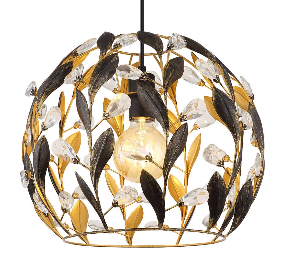 Mika visilica je stilski element koji će svakoj prostoriji dodati dašak elegancije. Svojim okruglim dizajnom i kišobranom s ljubavlju, odmah privlači svačiju pažnju. Tijelo od mat crno lakiranog metala pruža moderan, bezvremenski izgled, dok je nijansa od zlatne boje, patiniranog metala i elegantne crne oplemenjena filigranskim listovima i svjetlucavim kristalima. Ova kombinacija stvara magičnu igru svjetlosti koja okupa vaše sobe toplim, privlačnim svjetlom. Viseća lampa nudi prostor za E27 sijalicu (osim E27), tako da možete dizajnirati svjetlo prema vašim željama. Bilo u blagovaonici, dnevnoj sobi ili hodniku – Mika visilica je savršen izbor za sve one koji cijene tradiciju i stilski dizajn. Stavite konvencionalne svjetiljke u novo svjetlo s ovom izvrsnom visećom lampom!