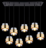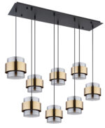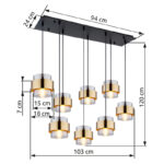 Ova viseća lampa uvjerava svojim estetskim dizajnom od crnog metala i zadimljenog stakla. Sastoji se od pravougaone metalne ploče (94×24 cm) na kojoj visi osam crnih kablova. Opremljeni su cilindričnim, dimljenim staklenim sjenilima sa mesinganim prstenom (ø 18 cm), koji mogu biti opremljeni E27 lampama po vašem izboru. Ovo vam daje priliku da individualno odredite boju svjetla i svjetlinu. Osim toga, visina viseće lampe može se podesiti do 120 cm tokom ugradnje. Sa ostalim modelima iste serije možete stvoriti stilski ambijent u svom interijeru i upotpuniti cjelokupnu sliku.