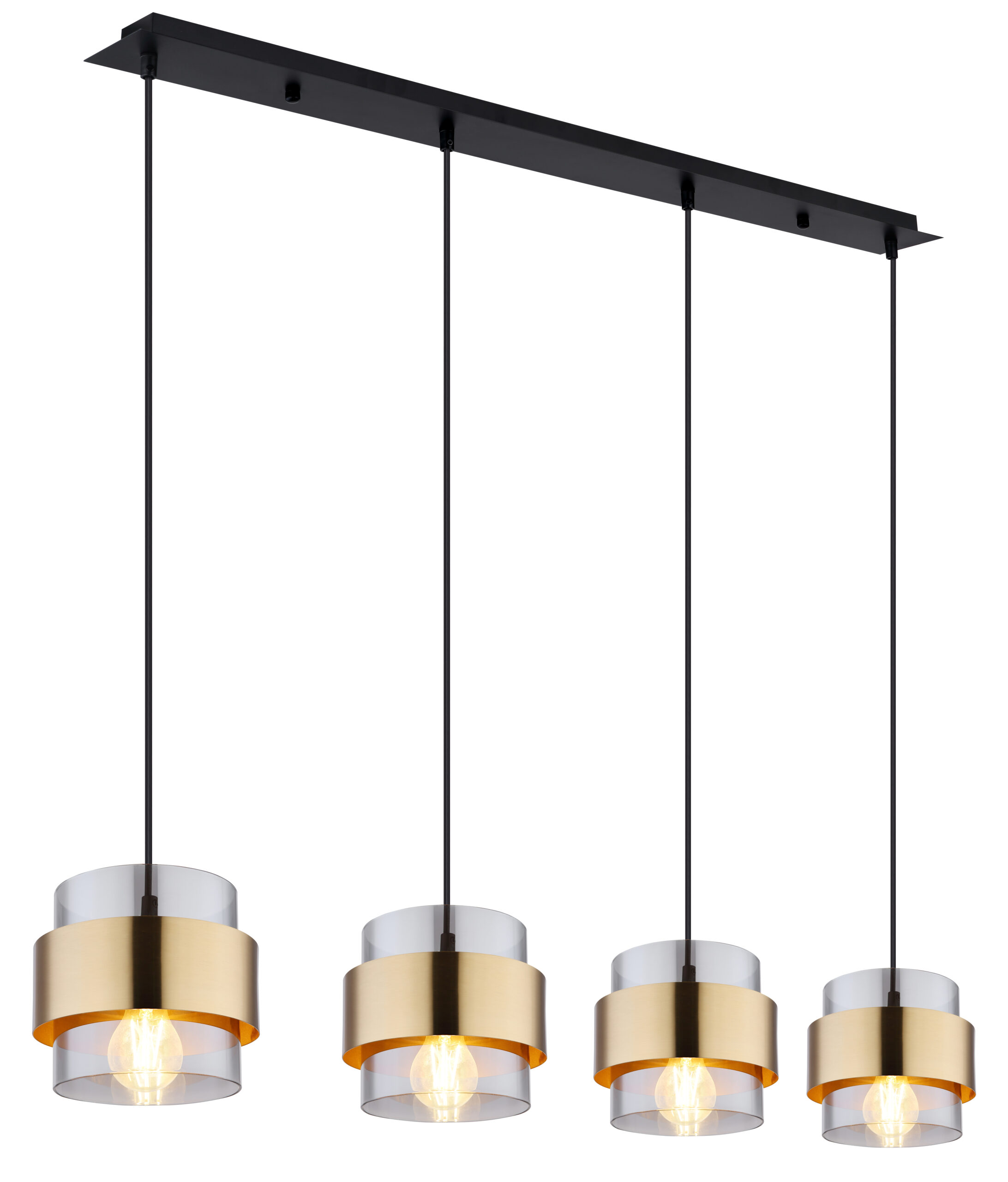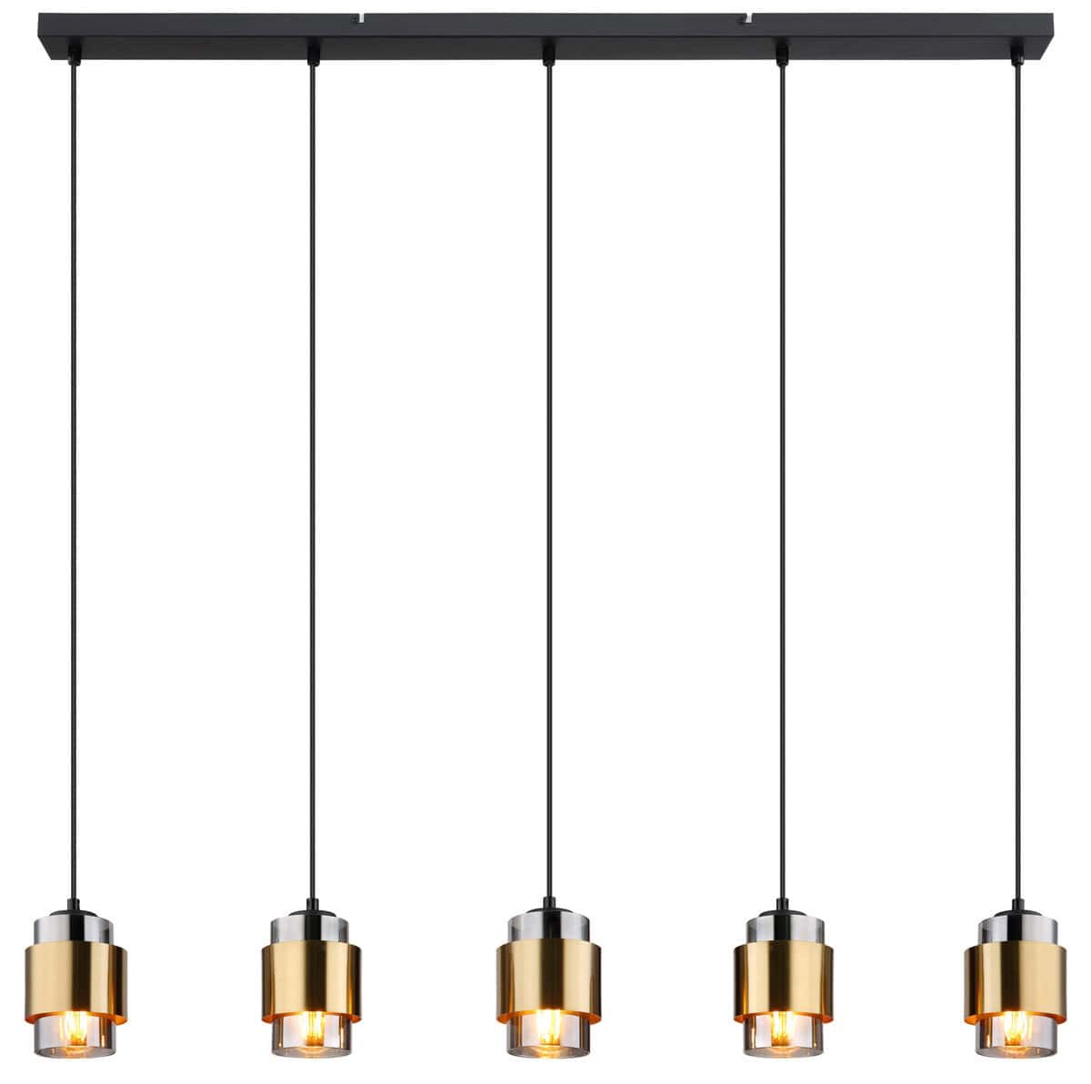 Viseća lampa serije MILLEY od crnog metala sa dimljenim staklom i mesinganim prstenom je moderan izbor za svaki dnevni boravak ili trpezariju. S veličinom DxŠxV: 1050x100x1500mm, postaje privlačna za oči u svakoj prostoriji. Za lampu je potrebno 5x sijalica E27 40W 230V i isporučuje se bez njih.