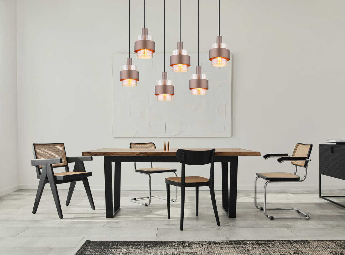 Otkrijte MILLEY visilicu, elegantno rješenje za vašu sobu. Pravokutni oblik ove lampe je na vrhu šest vješalica koje se skladno uklapaju u oblik sjenila. Čaše su ukrašene prstenovima u bronzanoj boji, što daje poseban štih dekoraciji. Pravokutni oblik lampe pruža čist i moderan dodir u kojem se može uživati u svakoj prostoriji. Viseća lampa MILLEY je visilica koja se ističe svojim elegantnim dizajnom i fleksibilnim mogućnostima ugradnje. Tijelo je izrađeno od metala u mat crnoj završnoj obradi, dok je sjenilo izrađeno od stakla u toploj jantarnoj boji i prozirnog, gradijentnog pokrivača. Metalni prsten oko sjenila izrađen je u bronzanoj postavci