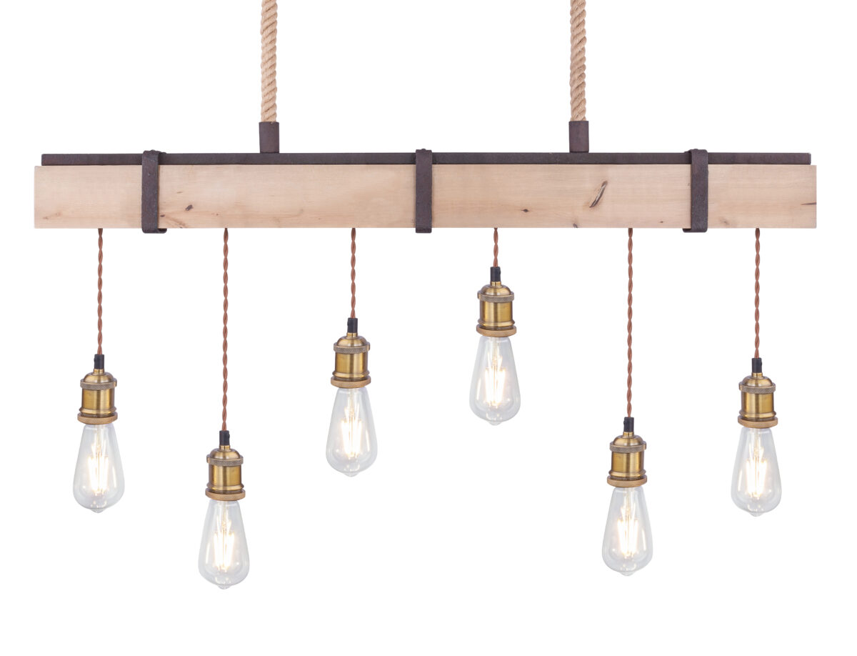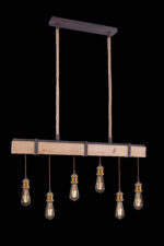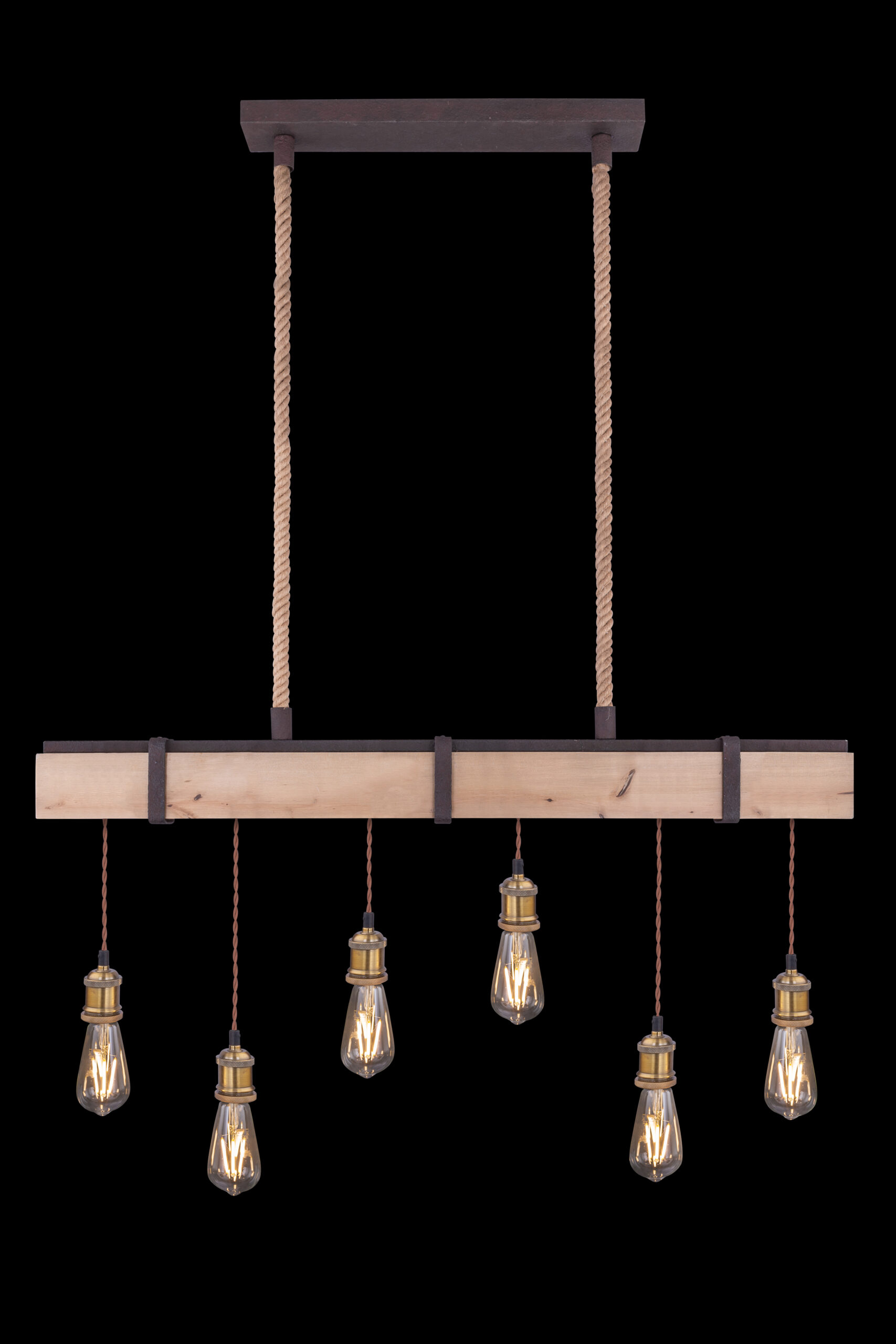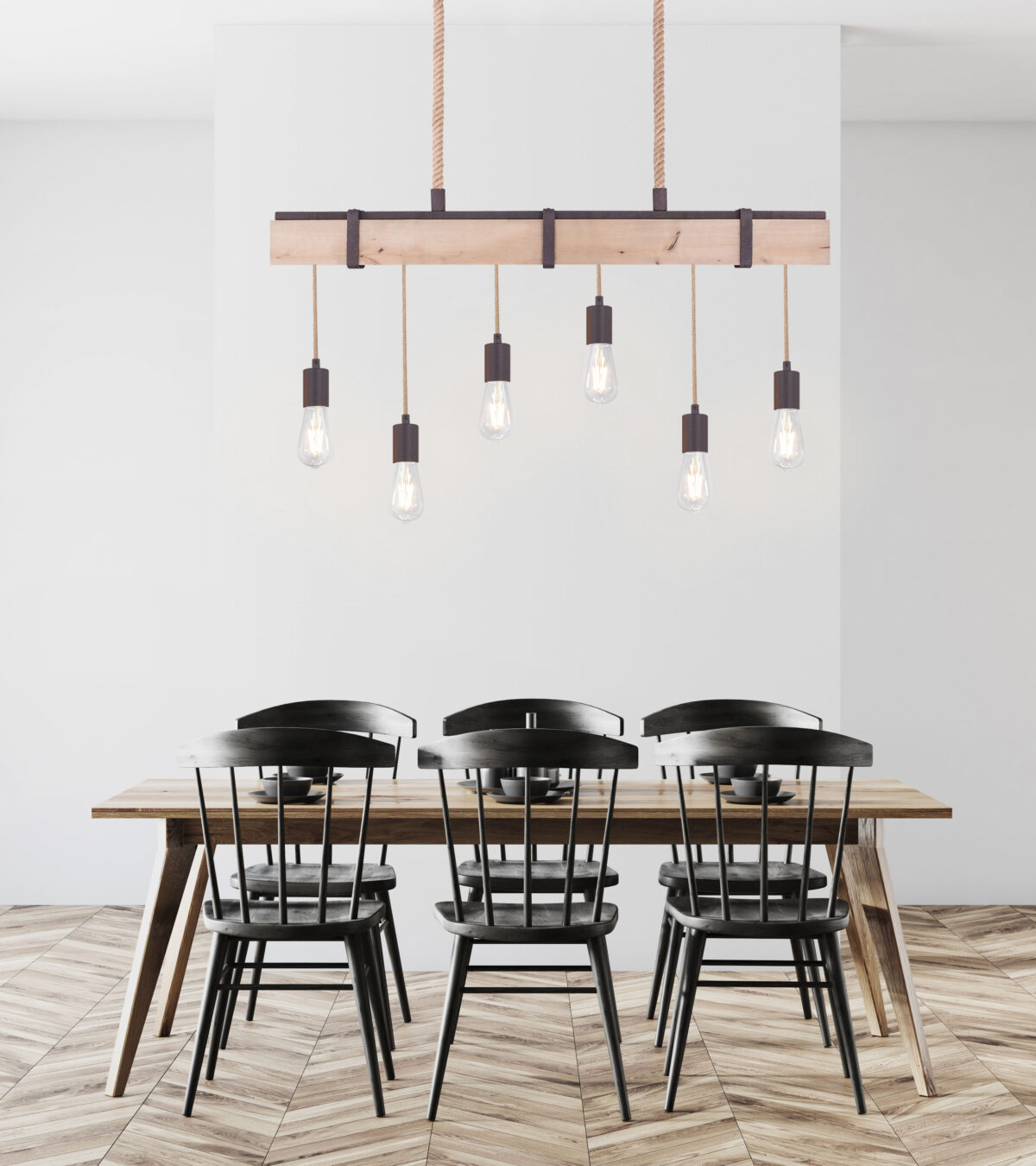 Viseća lampa muchA je poseban naglasak. S jedne strane metalom boje hrđe, u kombinaciji sa prirodnim drvetom, s druge strane slobodno visećim lampama bez abažura. 6 lampi vise na gredi i vire do 100 cm u prostoriju. Grlo E27 omogućava slobodan izbor sijalice do 60 vati. Zbog uštede energije i dugovečnosti preporučujemo LED lampe.