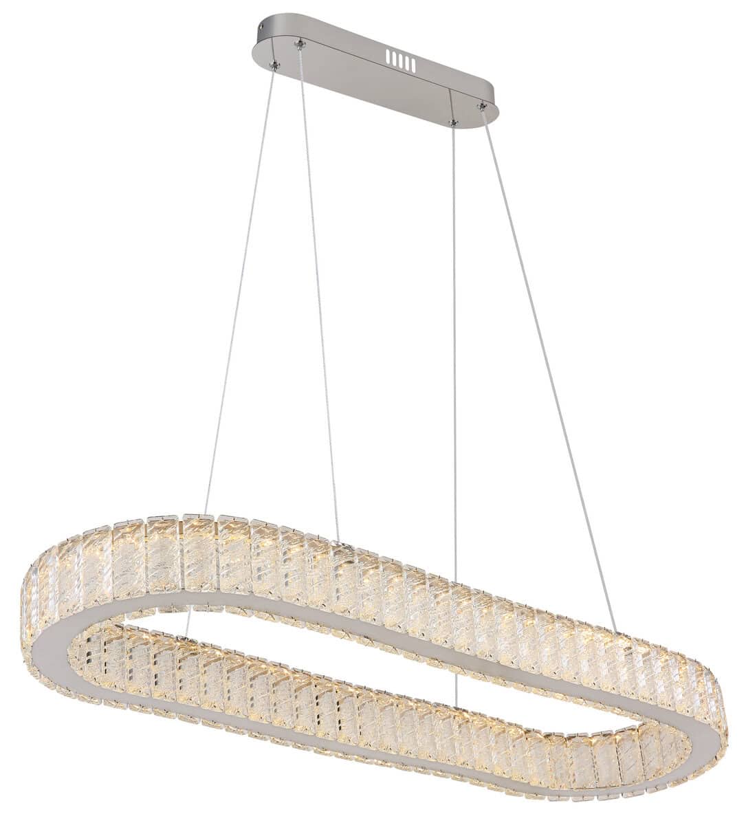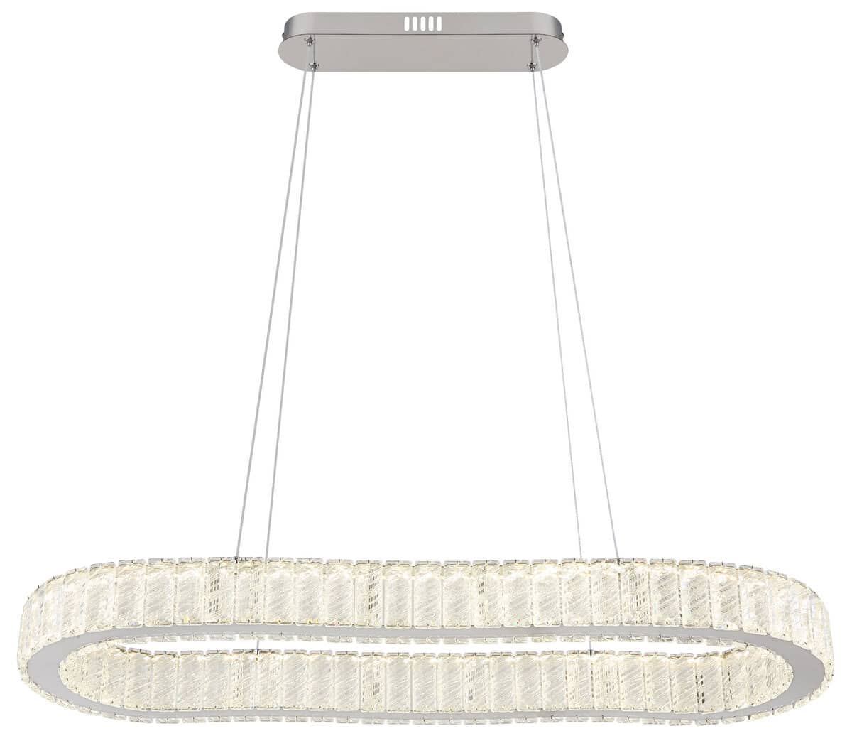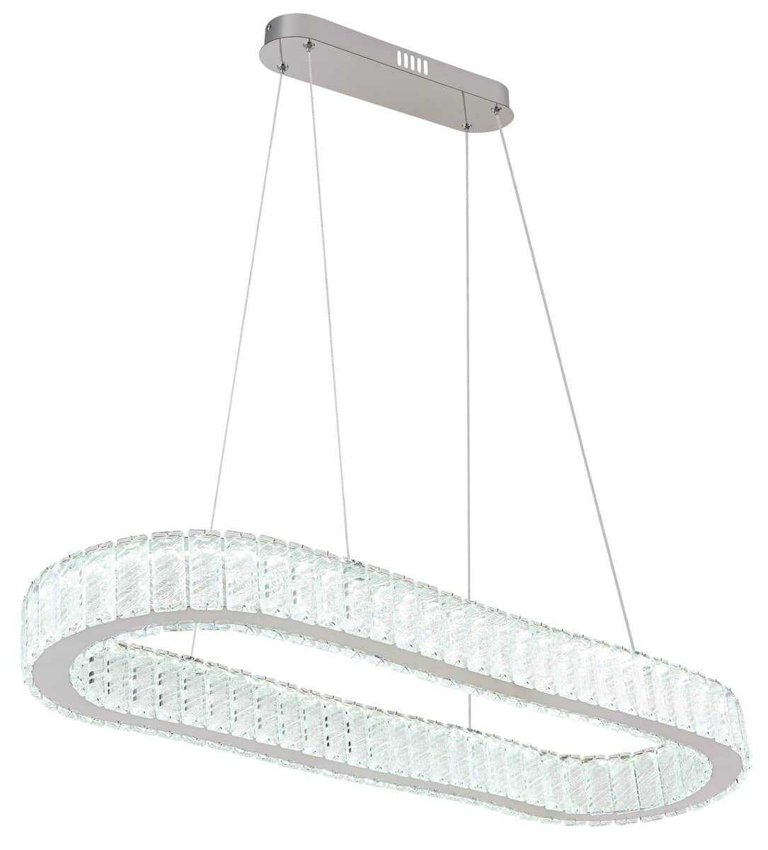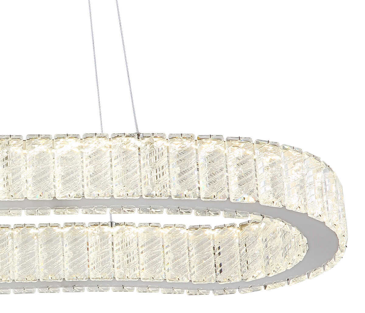 Naša visilica izrađena je od hromiranog metala i prozirnih K5 kristala koji lijepo reflektiraju svjetlost. Hromirani prsten daje dašak sofisticiranosti lampi. Kabl je izrađen od PVC-a i providan. Svetiljka ima mogućnost zatamnjivanja i može se kontrolisati preko više nivoa preko zidnog prekidača. Boje se mogu fiksirati, a lampa ima memorijsku funkciju. Obezbeđena je i noćna lampa. Visina lampe se može skratiti i daljinski upravljač je uključen. Trebat će vam 2 AAA baterije za daljinski upravljač. Viseća lampa je dimenzija DxŠxV: 890x310x1200mm i sastoji se od dva prstena prečnika 50 cm, odnosno 30 cm. Svetiljku napaja LED dioda snage 58W i napona 230V. Izvor svjetlosti ima svjetlinu od 648-6787lm izvora i izlaznu svjetlinu od 497-3566lm. Temperatura boje može se podesiti između 2700K i 6000K. Naša visilica je prava privlačnost za oči i bit će vrhunac u svakoj prostoriji. Svojom jedinstvenom kombinacijom modernog dizajna i visokokvalitetnih materijala, zajamčeno će privući oči u vašem domu.