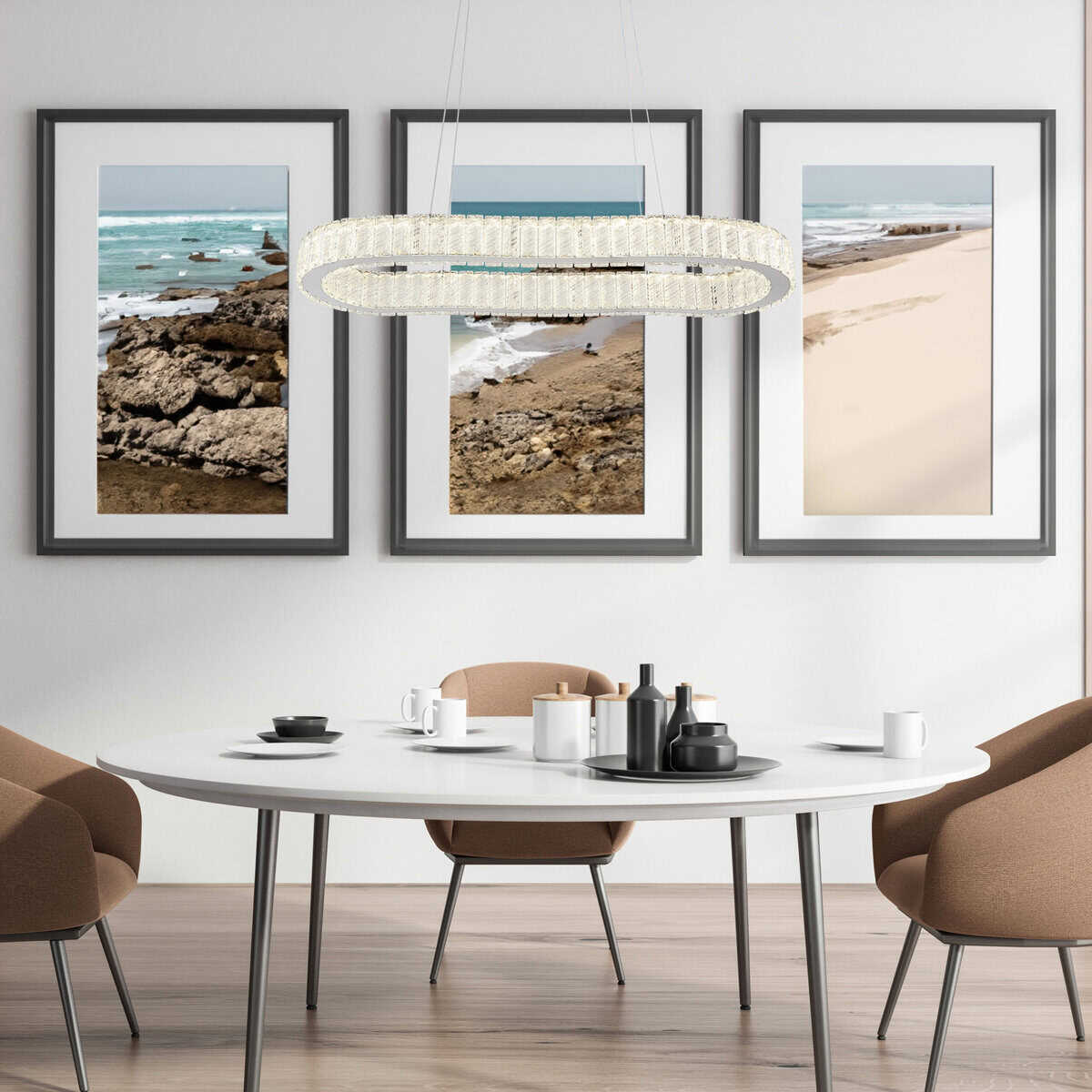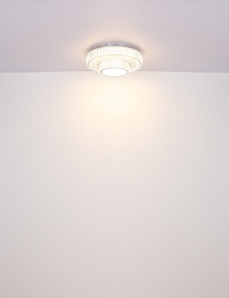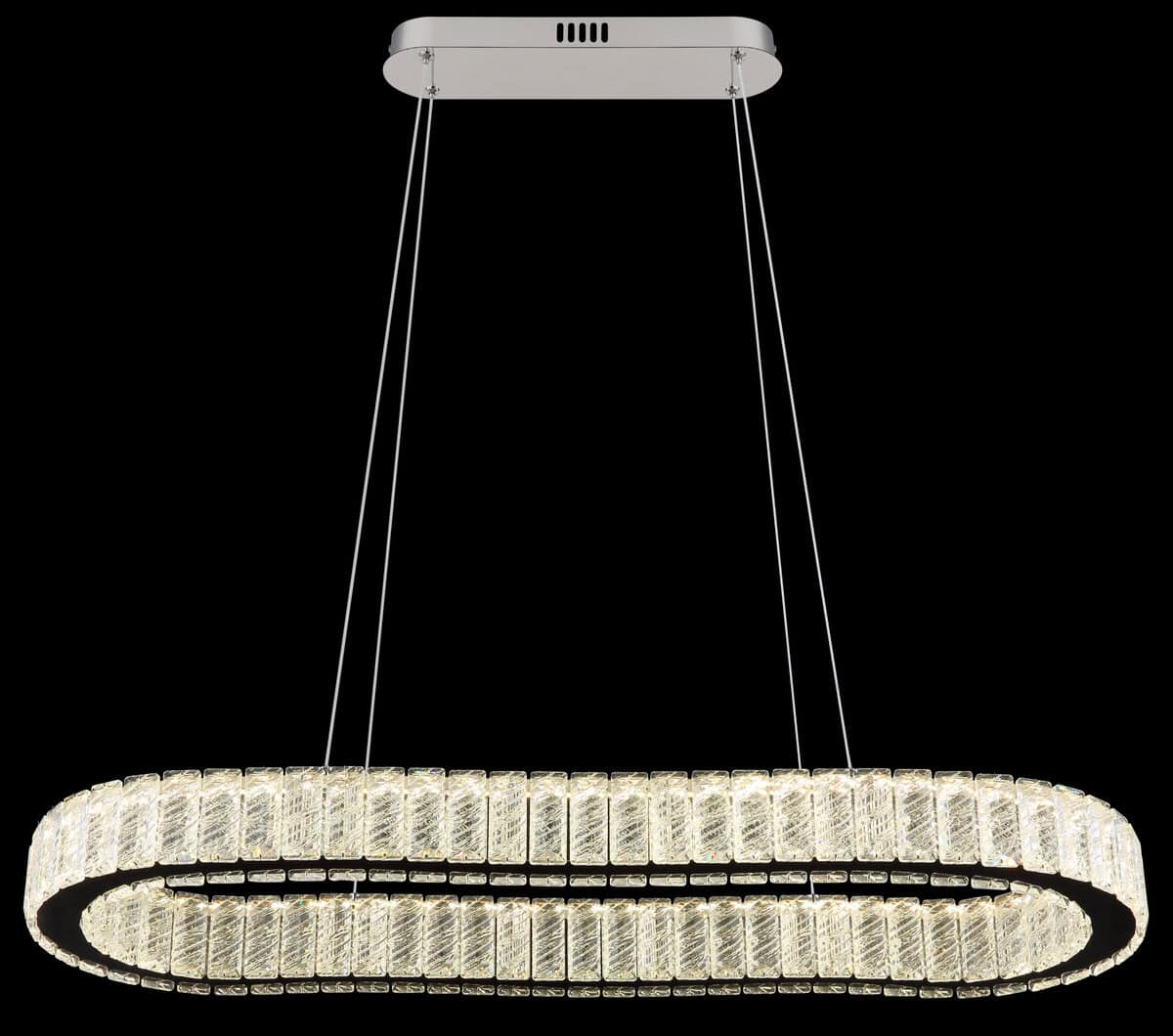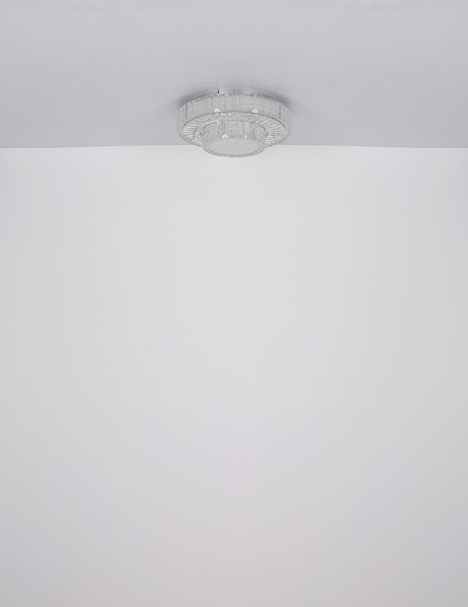 Naša visilica izrađena je od hromiranog metala i prozirnih K5 kristala koji lijepo reflektiraju svjetlost. Hromirani prsten daje dašak sofisticiranosti lampi. Kabl je izrađen od PVC-a i providan. Svetiljka ima mogućnost zatamnjivanja i može se kontrolisati preko više nivoa preko zidnog prekidača. Boje se mogu fiksirati, a lampa ima memorijsku funkciju. Obezbeđena je i noćna lampa. Visina lampe se može skratiti i daljinski upravljač je uključen. Trebat će vam 2 AAA baterije za daljinski upravljač. Viseća lampa je dimenzija DxŠxV: 890x310x1200mm i sastoji se od dva prstena prečnika 50 cm, odnosno 30 cm. Svetiljku napaja LED dioda snage 58W i napona 230V. Izvor svjetlosti ima svjetlinu od 648-6787lm izvora i izlaznu svjetlinu od 497-3566lm. Temperatura boje može se podesiti između 2700K i 6000K. Naša visilica je prava privlačnost za oči i bit će vrhunac u svakoj prostoriji. Svojom jedinstvenom kombinacijom modernog dizajna i visokokvalitetnih materijala, zajamčeno će privući oči u vašem domu.