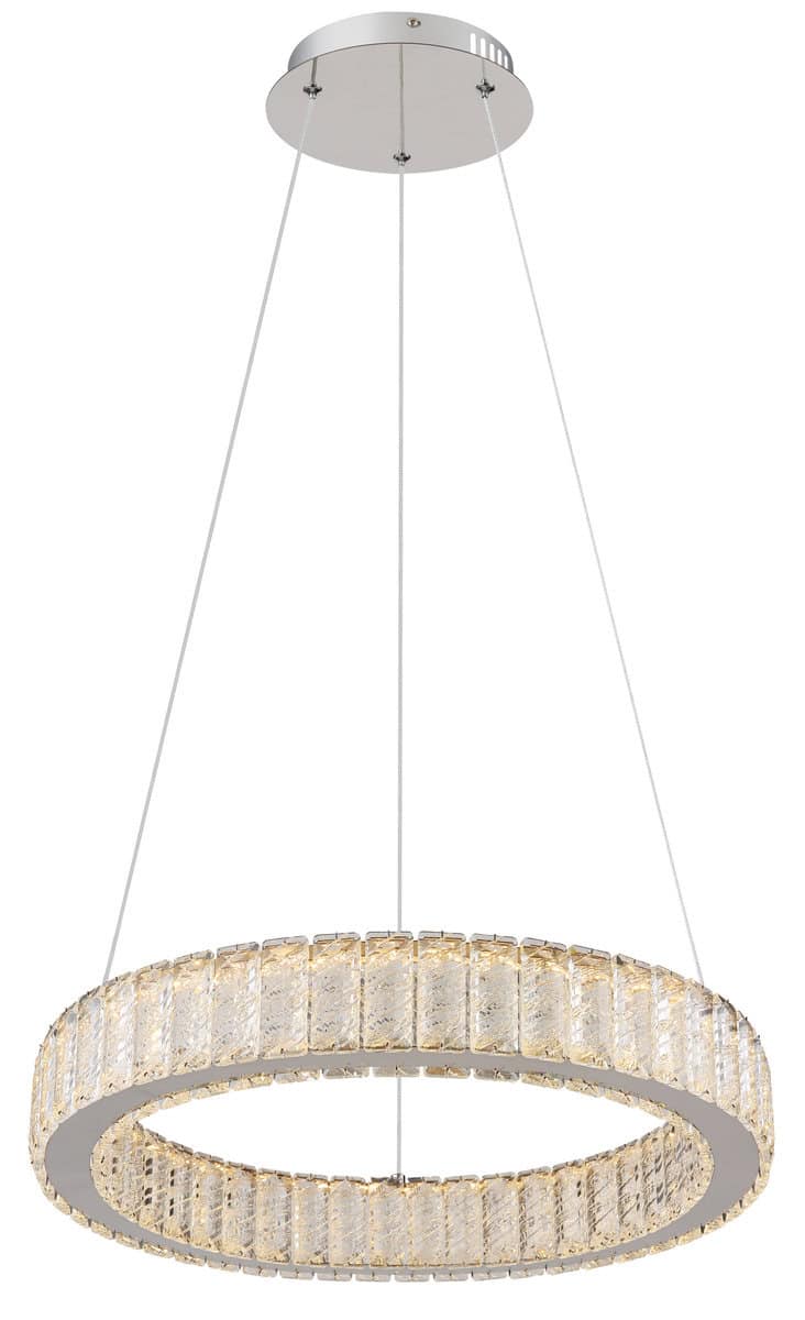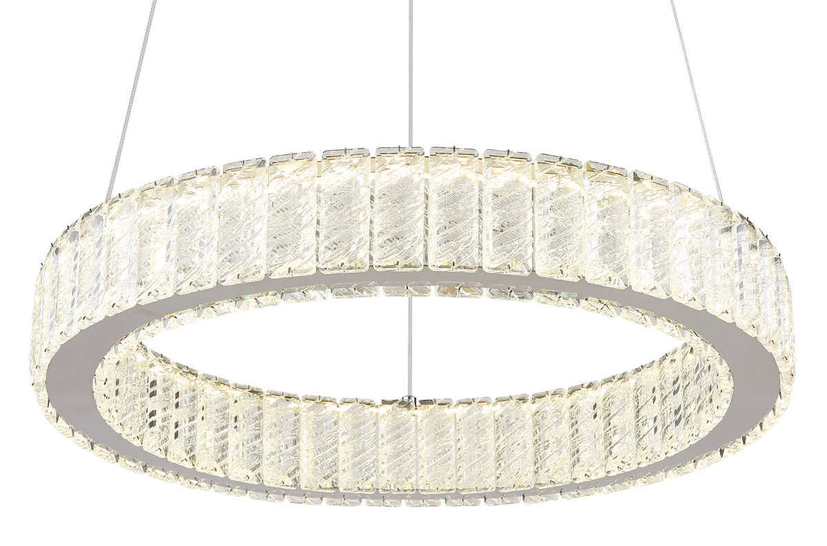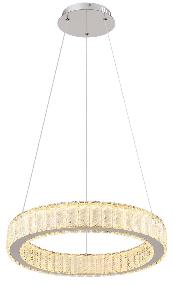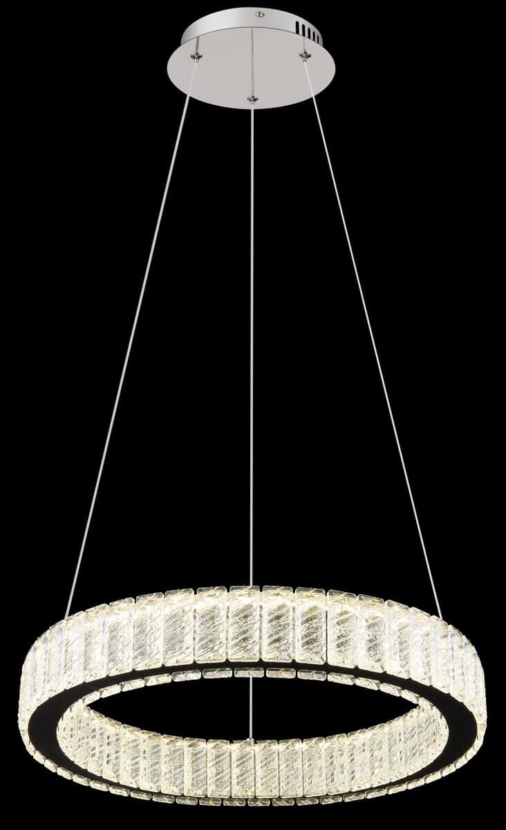 Naša visilica izrađena je od hromiranog metala i prozirnih K5 kristala koji lijepo reflektiraju svjetlost. Hromirani prsten daje dašak sofisticiranosti lampi. Kabl je izrađen od PVC-a i providan. Svetiljka ima mogućnost zatamnjivanja i može se kontrolisati preko više nivoa preko zidnog prekidača. Boje se mogu fiksirati, a lampa ima memorijsku funkciju. Obezbeđena je i noćna lampa. Visina lampe se može skratiti i daljinski upravljač je uključen. Trebat će vam 2 AAA baterije za daljinski upravljač. Viseća lampa je veličine ø: 500 mm i H: 1200 mm i sastoji se od prstena prečnika 50 cm. Svetiljku napaja LED dioda snage 50W i napona 230V. Izvor svjetlosti ima svjetlinu od 678-5635lm izvor i izlaznu svjetlinu od 521-2995lm. Temperatura boje može se podesiti između 2700K i 6000K. Naša visilica je prava privlačnost za oči i bit će vrhunac u svakoj prostoriji. Svojom jedinstvenom kombinacijom modernog dizajna i visokokvalitetnih materijala, zajamčeno će privući oči u vašem domu.
