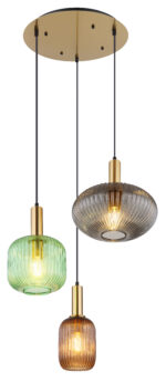 Ova viseća lampa iz serije Normy (ø 55 cm) je prekrasan dodatak vašem interijeru. Sastoji se od metalne ploče boje mesinga na koju su pomoću crnih kablova pričvršćene tri staklene sjenila različitih oblika i boja. Možete ih opremiti sa E27 sijalicama po vašem izboru, što vam daje mogućnost da individualno odredite boju svjetla i svjetlinu. Osim toga, visina viseće lampe može se podesiti do 130 cm tokom ugradnje. Uz više članaka iz iste serije možete upotpuniti cjelokupnu sliku u svoja četiri zida.