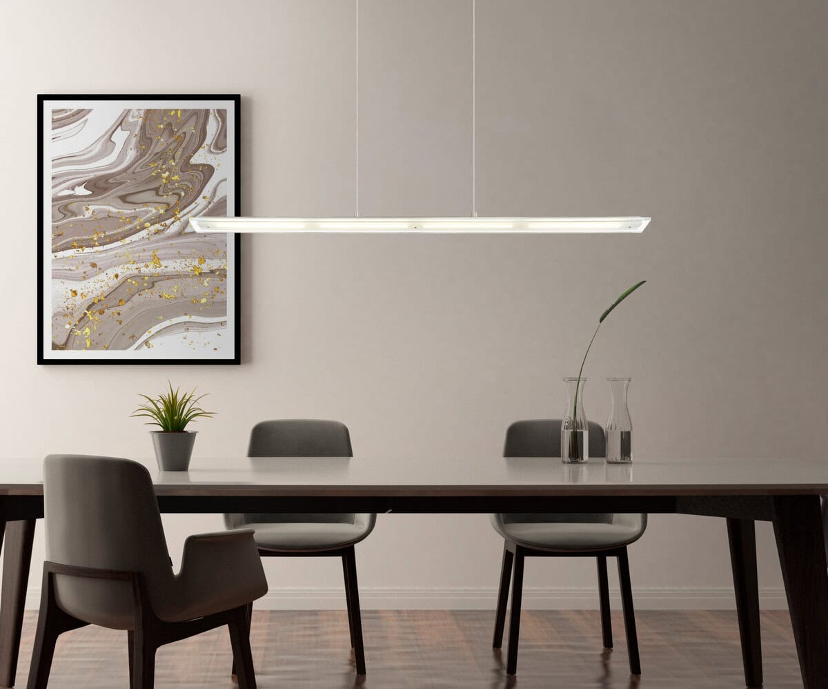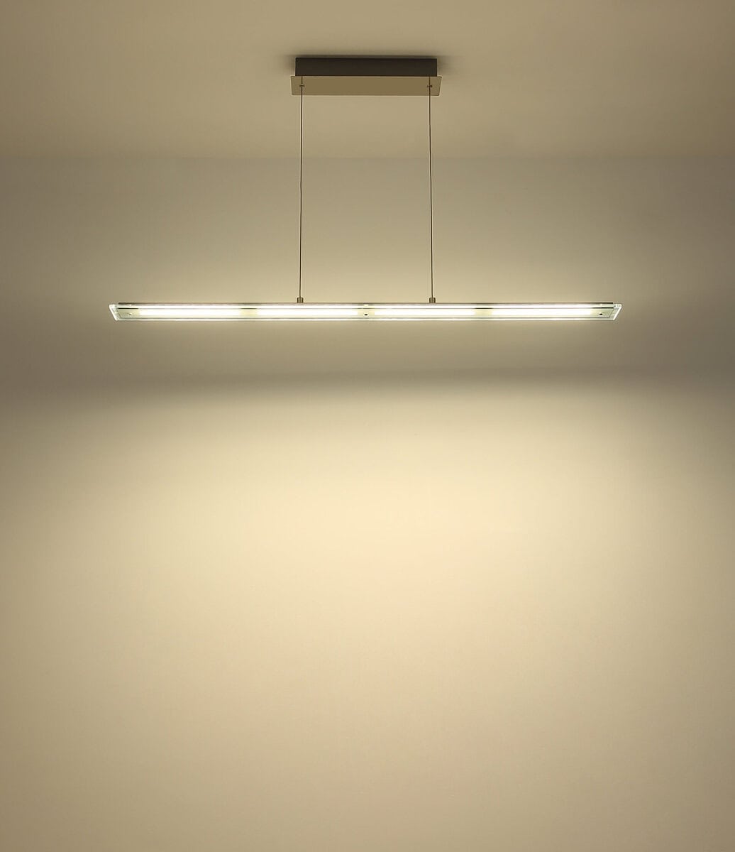Viseća lampa NOVAK kombinuje moderan, linearan dizajn sa inovativnom funkcionalnošću, dodajući stilske akcente iznad trpezarijskih stolova, radnih ili dnevnih prostora. Pravougaona greda od mat metala nikla odiše visokokvalitetnom elegancijom, dok sjenilo od prozirnog i mat stakla ravnomjerno raspoređuje svjetlost, stvarajući ugodnu atmosferu bez odsjaja. Svetlo je podesivo po visini, što omogućava optimalno prilagođavanje različitim visinama plafona i veličinama stola. Sa dimenzijama D: 1150 mm, Š: 90 mm, NOVAK viseća lampa daje upečatljiv izgled bez da preopterećuje prostoriju. Integrisana LED daje 1420 lumena sa podesivom temperaturom boje od 3000 K do 6500 K, koja se može zatamniti preko beskonačnog dimera na dodir. Boje se mogu fiksirati, a memorijska funkcija pohranjuje željenu postavku osvjetljenja. Zahvaljujući vrhunskim materijalima, modernom dizajnu i inteligentnoj tehnologiji rasvjete, NOVAK visilica je savršena za one koji traže skladnu kombinaciju stila i funkcionalnosti.