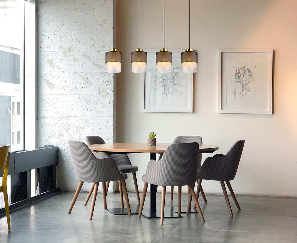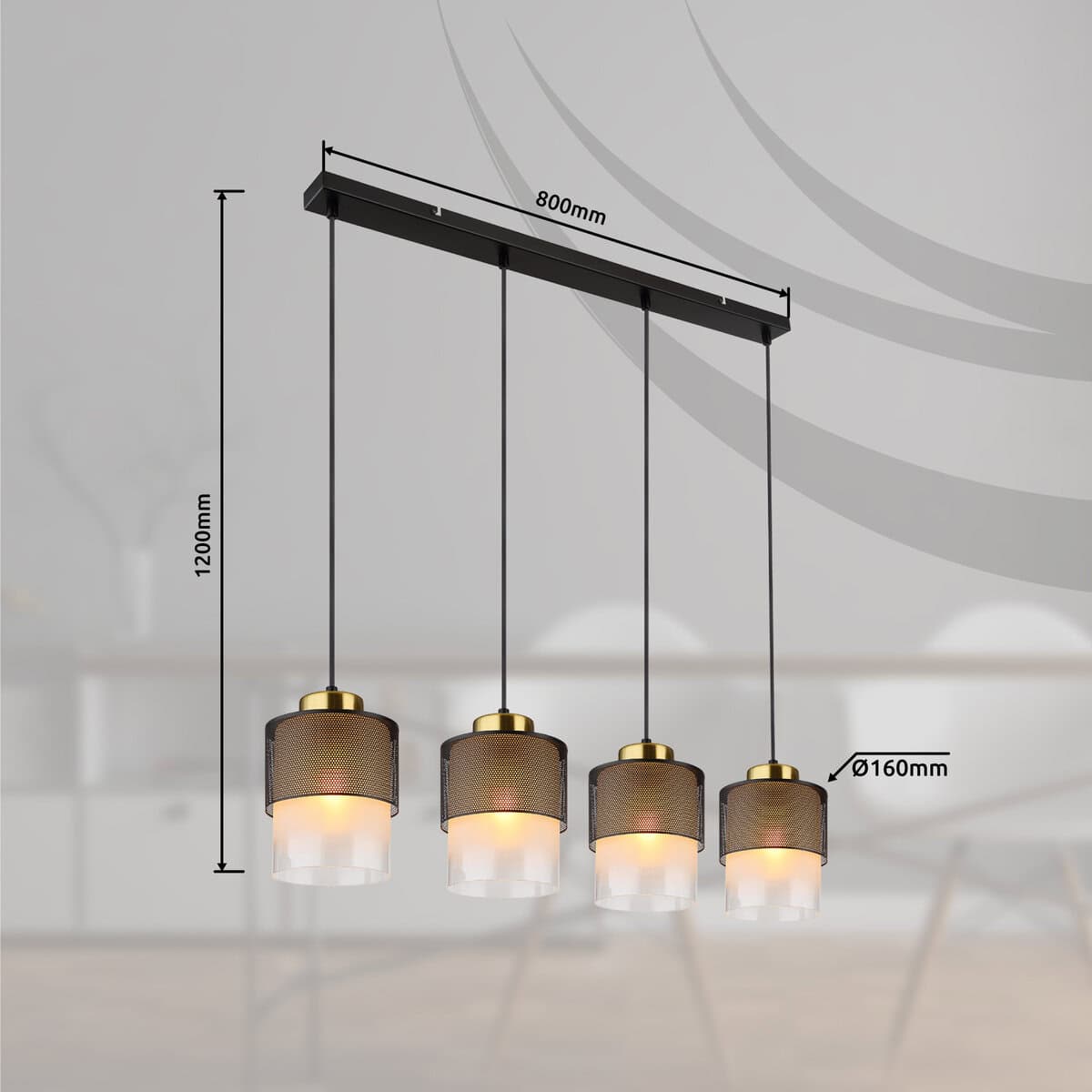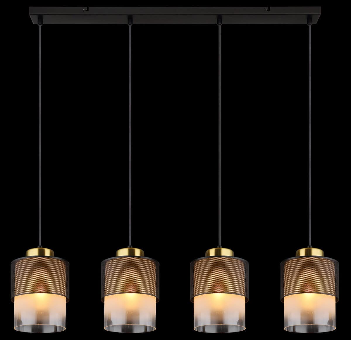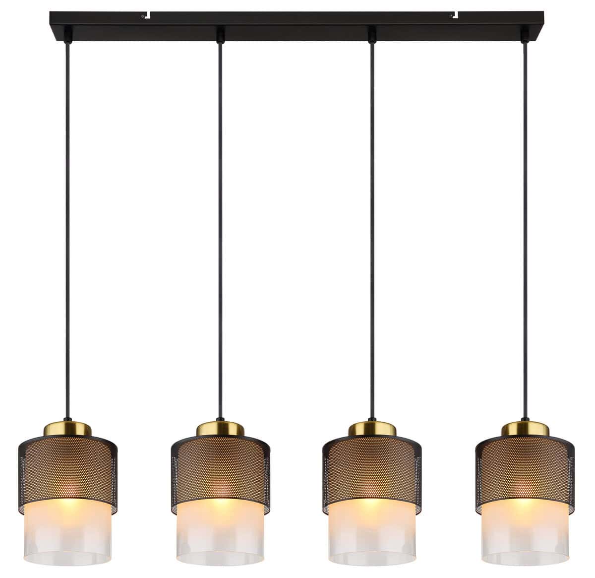 S ravnom šinom i 4 staklena cilindra sa perforiranim metalom oko sebe, ovo svjetlosno rješenje je prava privlačnost na vašem plafonu. Izduženi visilica od crnog mat metala ima četiri E27 podnožja, koja pružaju dovoljnu svjetlinu. Elegantni stakleni abažur u satenskom prozirnom dizajnu daje lampi moderan dodir i ugodnu difuziju svjetlosti. Metalni gradijent boje mesinga naglašava moderan dizajn viseće lampe. Sa dužinom od 910 mm i širinom od 160 mm, visilica nudi dovoljno svjetla i posebno je moćna sa snagom od 60 W. Viseća lampa je savršena za dnevne ili blagovaone ili druge prostorije velike površine. Dopustite da budete inspirisani ovom modernom i elegantnom visećom lampom i postavite pravi vrhunac u svoj dom.