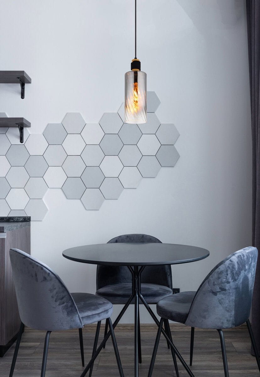 Okrugla viseća lampa kombinuje moderan dizajn sa prirodnim elementima i postavlja elegantne akcente u vašu sobu. Tijelo od mat crnog metala i drveni dekor koji pokriva kabel stvaraju elegantan i topao izgled. Cilindrična staklena sjenila sa žljebovima i gradijentom boje dima osiguravaju ravnomjernu distribuciju svjetlosti i ugodnu atmosferu. Sa prečnikom od 120 mm, lampa je idealna za manje prostore kao što su kuhinjski otoci, hodnici ili kao akcentno osvetljenje iznad trpezarijskog stola. Opremljen je sa E27 grlom (sijalica nije uključena), tako da možete odabrati svjetlinu i boju svjetla prema vašim željama. Viseća lampa kombinuje moderan metal sa prirodnošću drveta i stakla i donosi harmonično svetlo u vaš dom. Elegantan, funkcionalan dizajn koji svakoj prostoriji dodaje elegantne akcente.