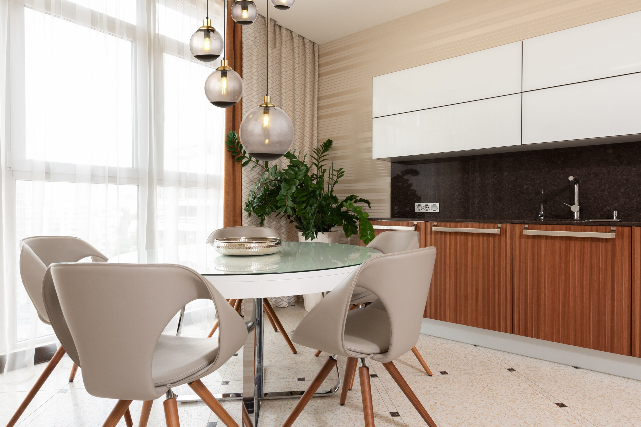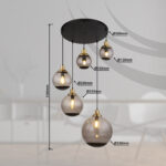 Ova elegantna viseća lampa inspiriše prelepim dizajnom. Iz okruglog plafonskog nosača (Ø 50 cm) u crnoj boji, u po jednu E27 utičnicu viri pet kablova različitih dužina do 1,5 m, koji su opremljeni staklenim paravanima u boji dima u raznim oblicima i ukrasima u crnoj, mesinganoj boji. E27 utičnice vam omogućavaju da sami odredite boju svjetla i svjetlinu do maksimalne snage od 40 vati. Zbog dugovečnosti i uštede energije preporučujemo LED sijalice.