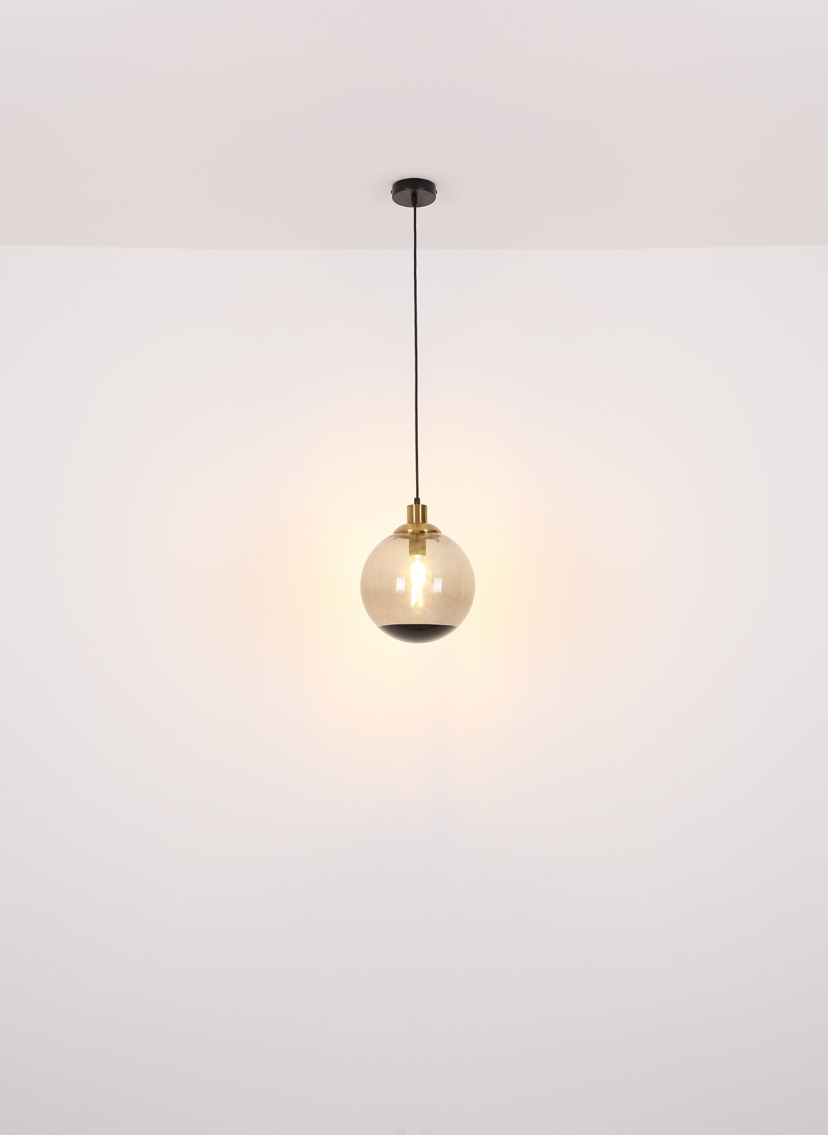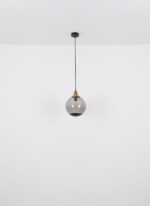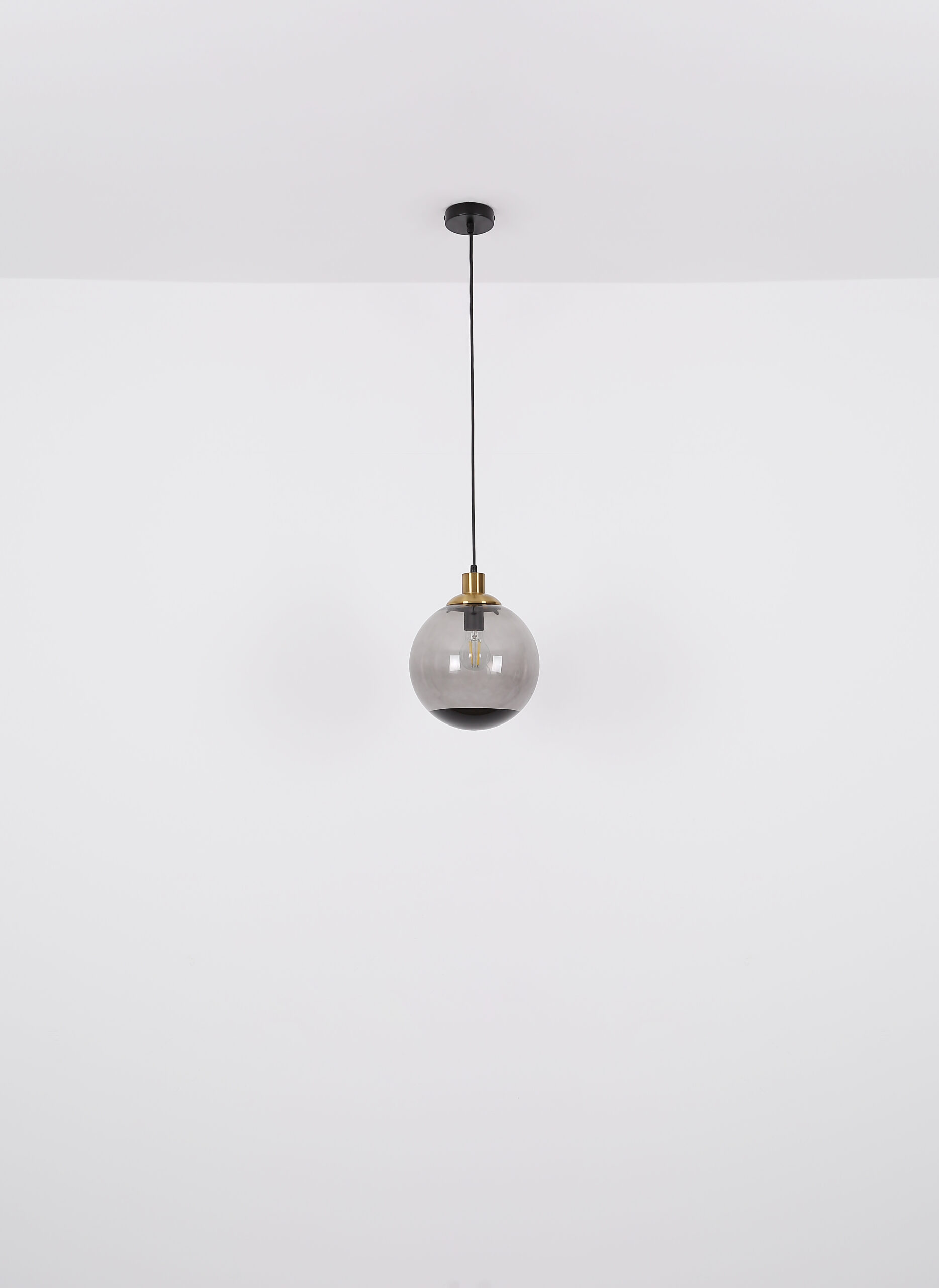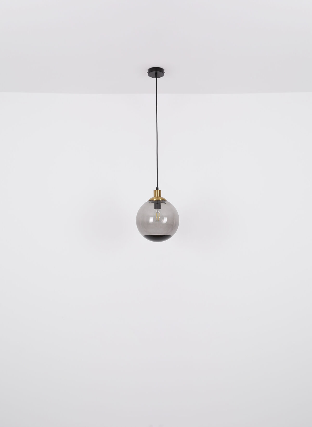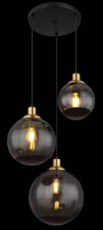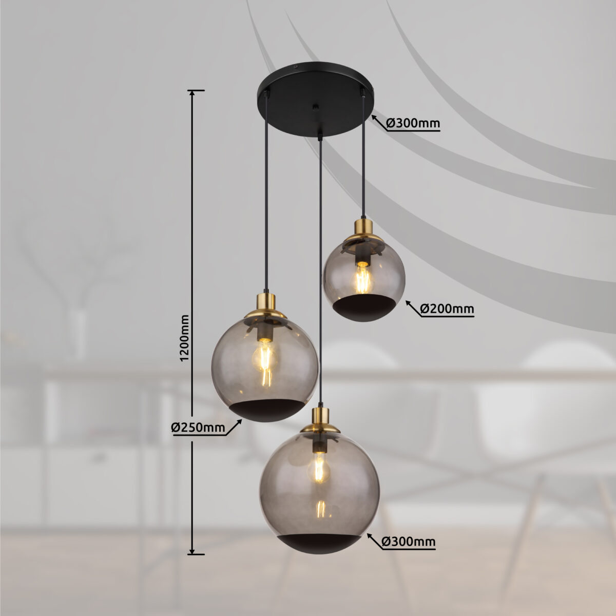 Ova elegantna viseća lampa inspiriše prelepim dizajnom. Iz okruglog plafonskog nosača (Ø 30 cm) u crnoj boji, u po jednu E27 utičnicu vire tri kabla različitih dužina do 1,2 m, koji su opremljeni staklenim sjenilima u boji dima u raznim oblicima i ukrasima u crnoj i mesinganoj boji. E27 utičnice vam omogućavaju da sami odredite boju svjetla i svjetlinu do maksimalne snage od 40 vati. Zbog dugovečnosti i uštede energije preporučujemo LED sijalice.