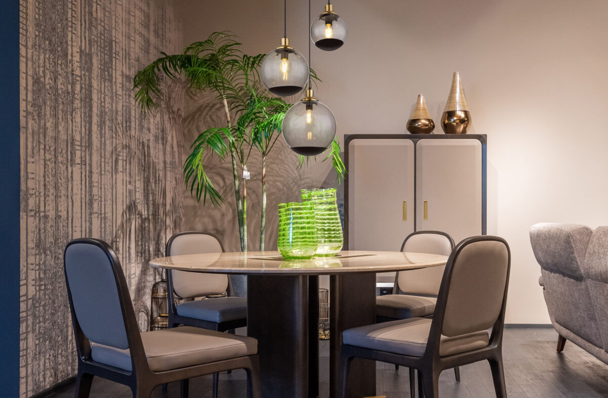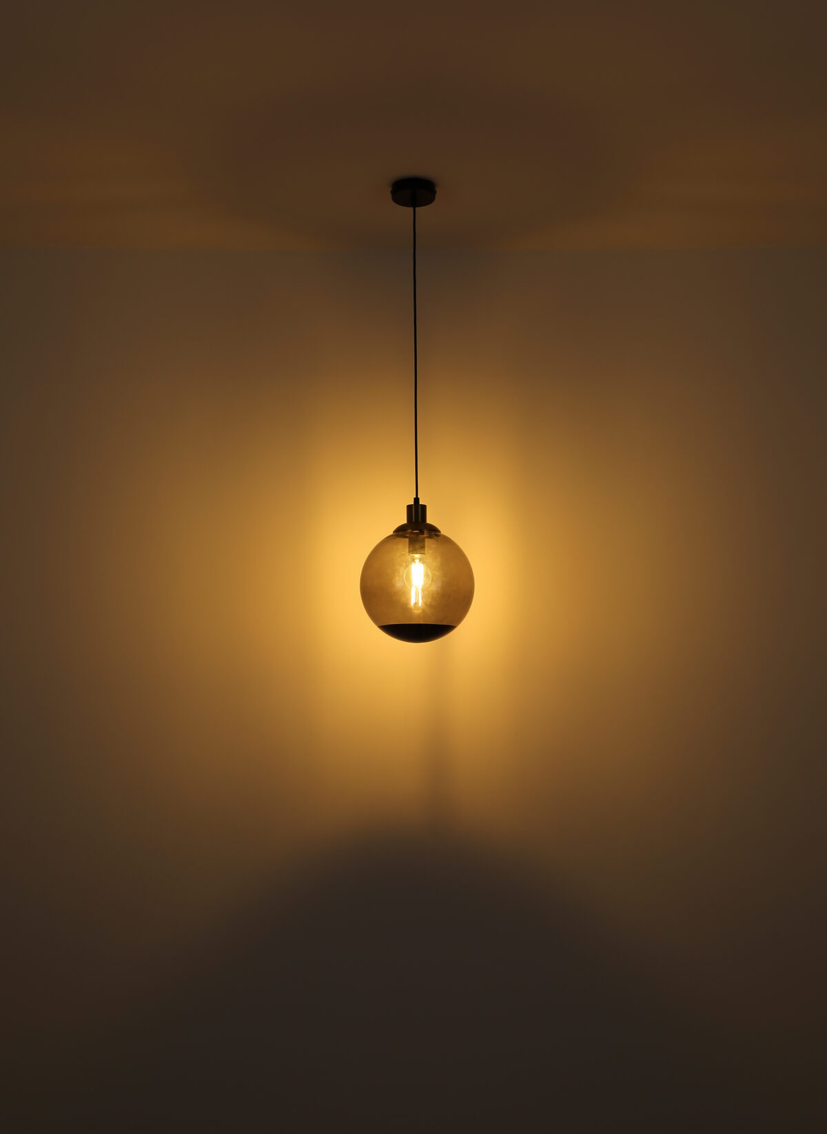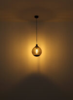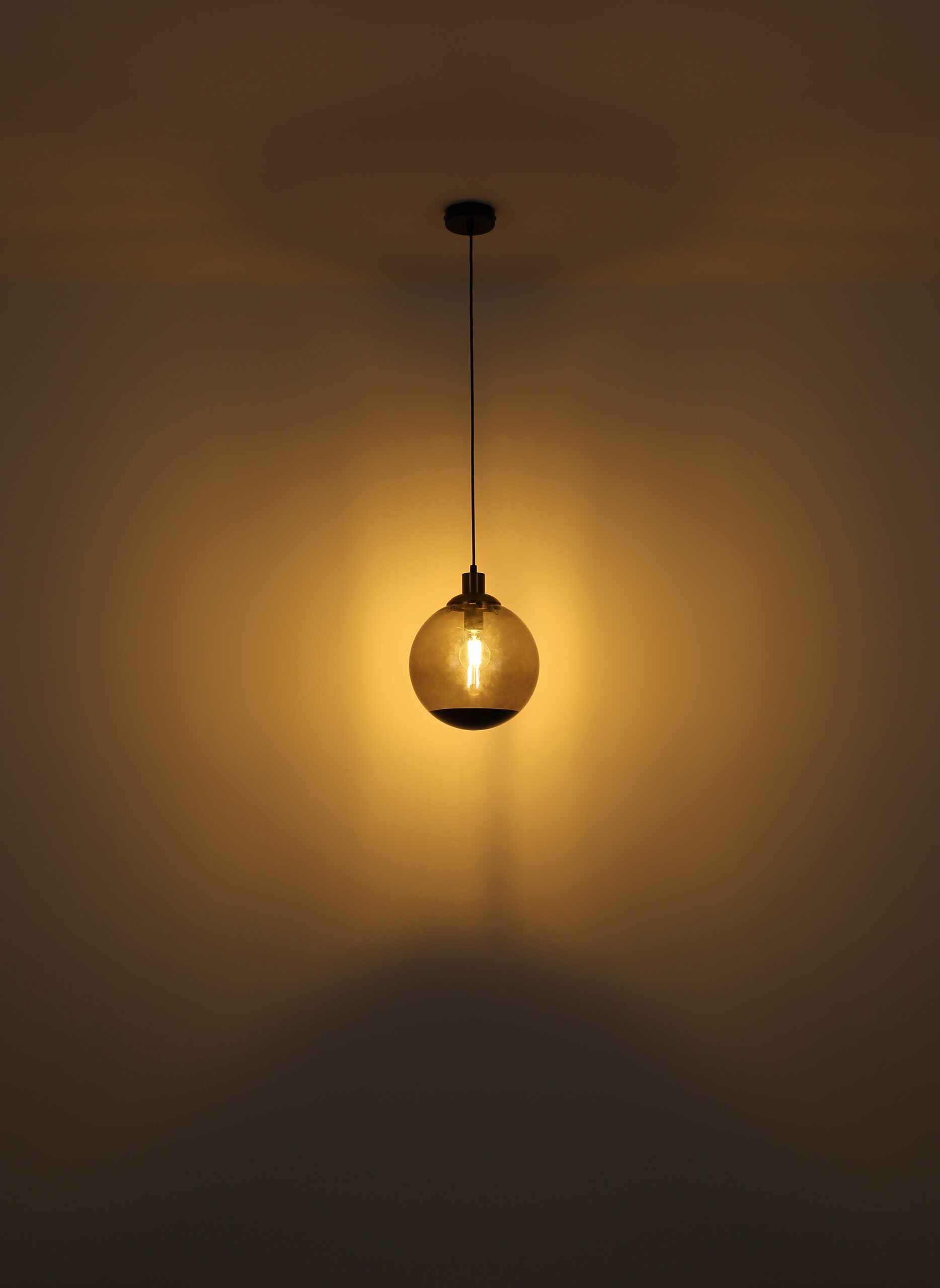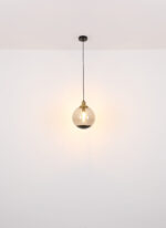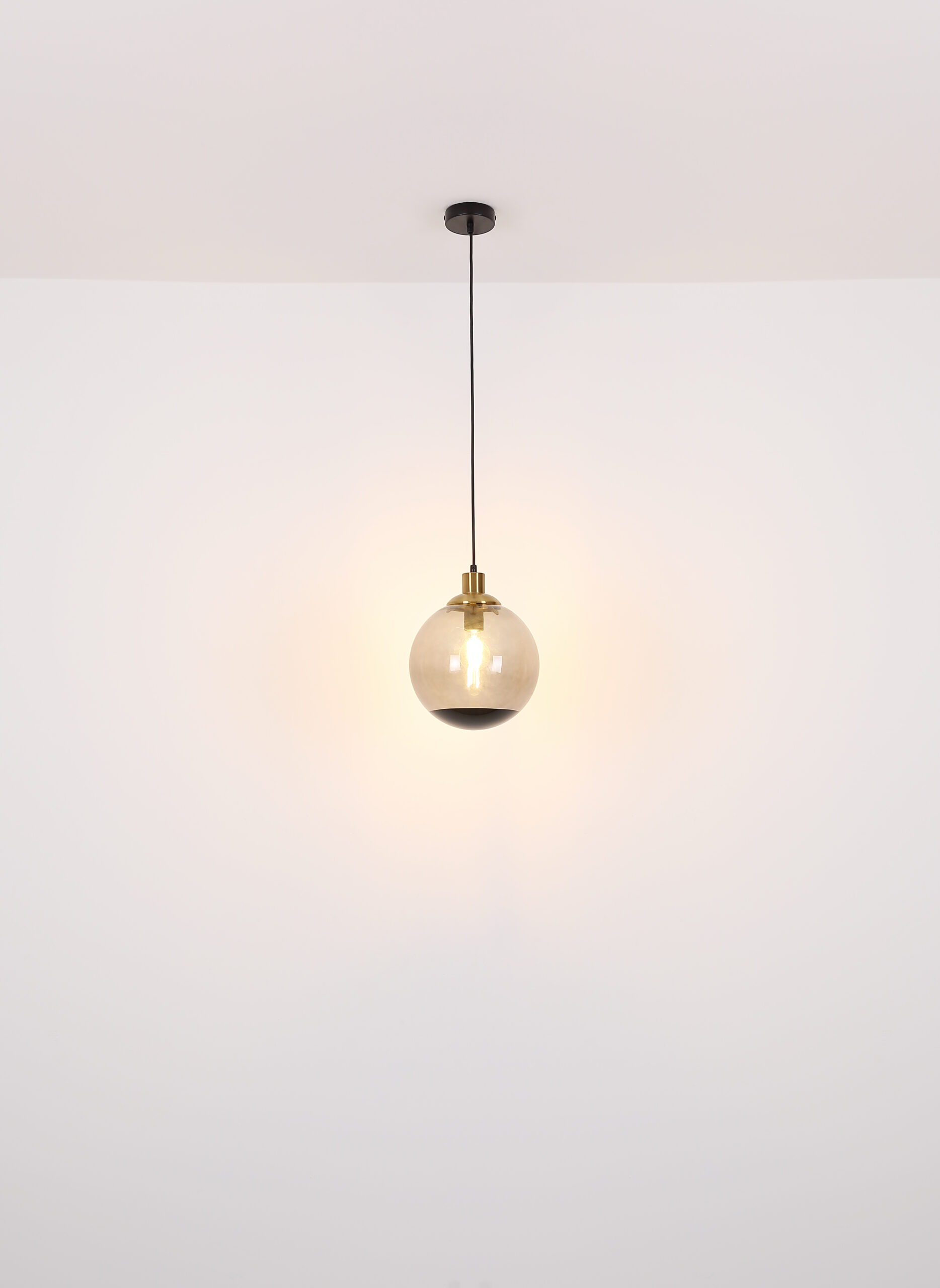 Ova elegantna viseća lampa inspiriše prelepim dizajnom. Iz okruglog plafonskog nosača (Ø 30 cm) u crnoj boji, u po jednu E27 utičnicu vire tri kabla različitih dužina do 1,2 m, koji su opremljeni staklenim sjenilima u boji dima u raznim oblicima i ukrasima u crnoj i mesinganoj boji. E27 utičnice vam omogućavaju da sami odredite boju svjetla i svjetlinu do maksimalne snage od 40 vati. Zbog dugovečnosti i uštede energije preporučujemo LED sijalice.
