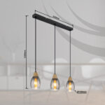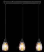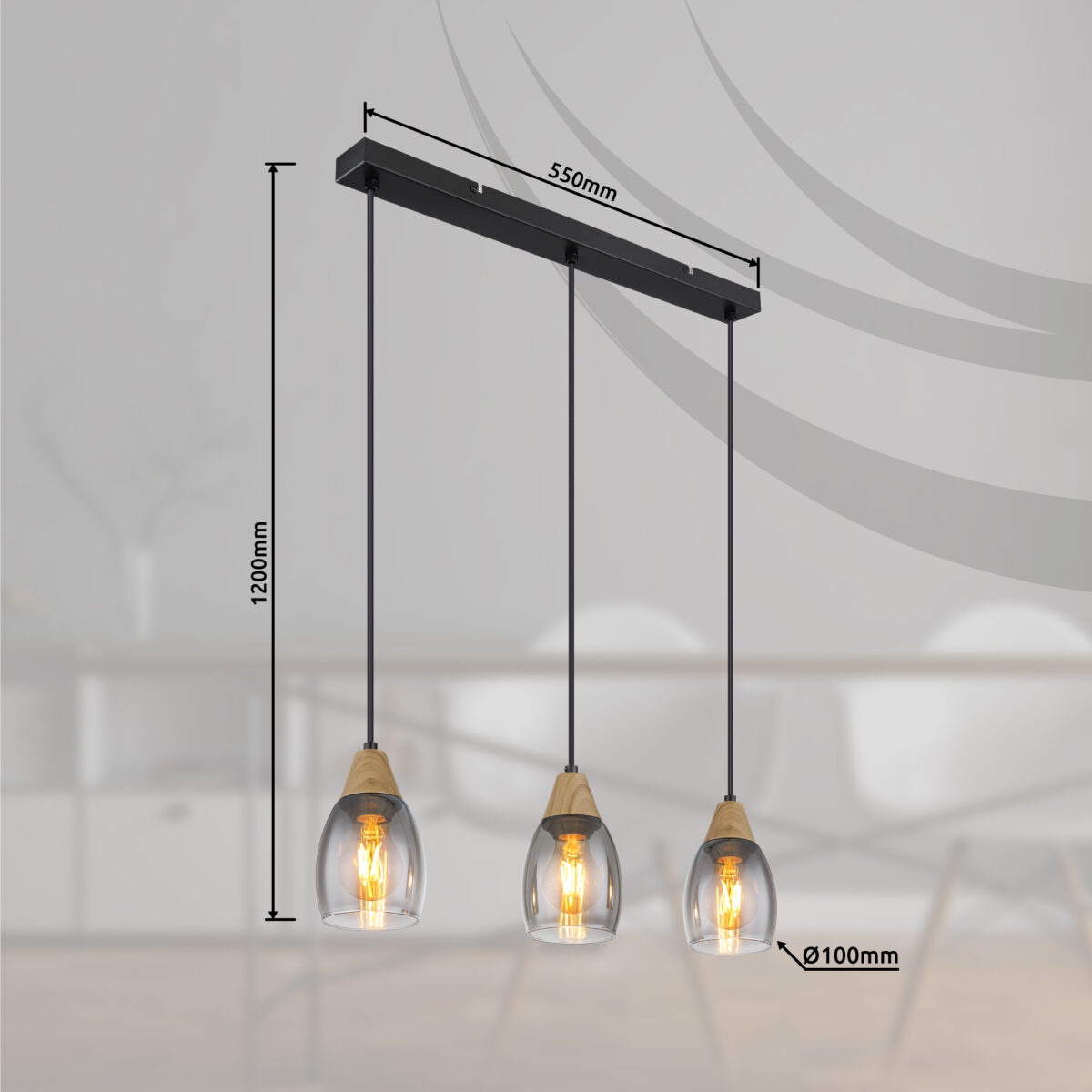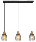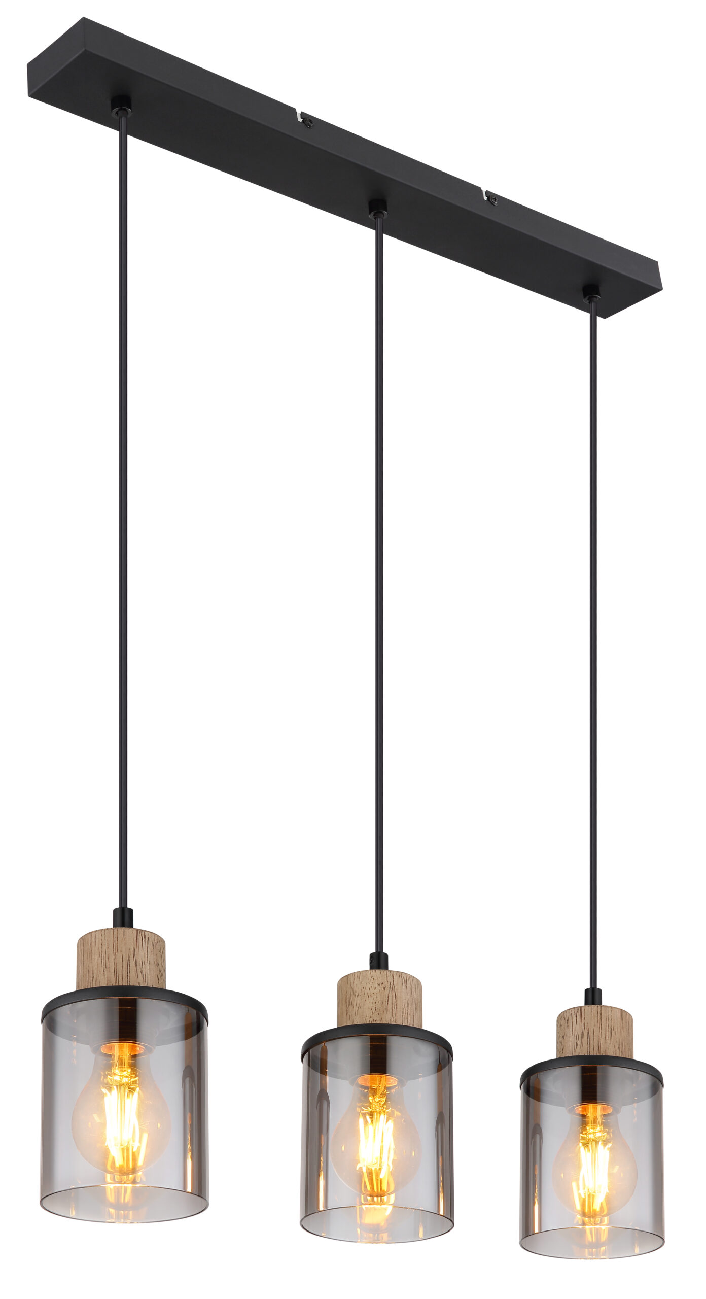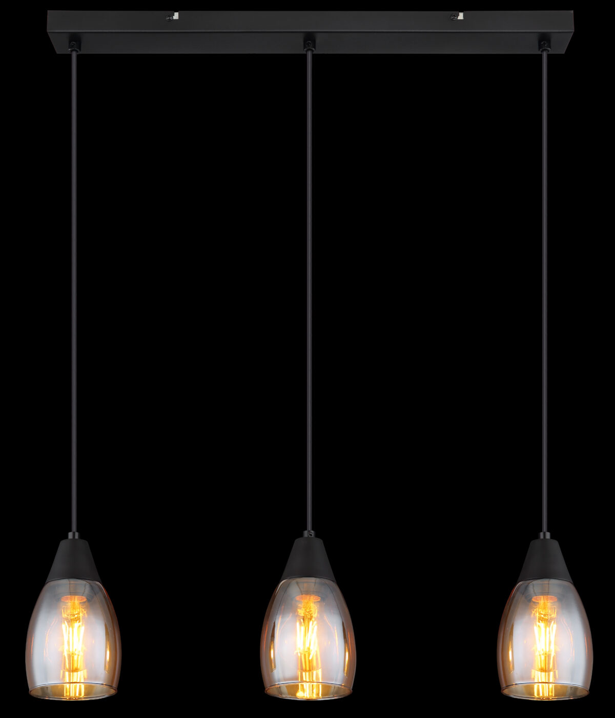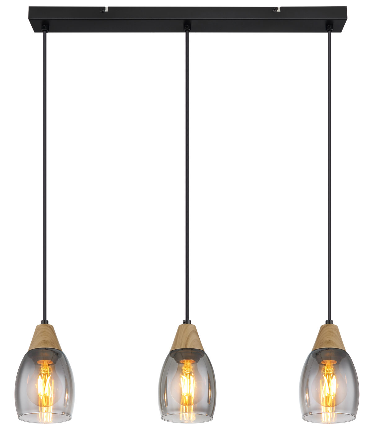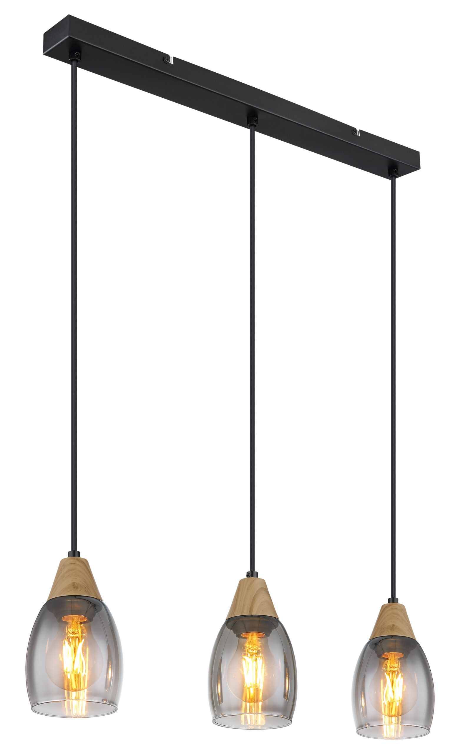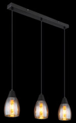 Ova oblikovana viseća lampa iz Reid serije impresionira svojim prekrasnim dizajnom. Tri crna kabla dužine 1,2 m prolaze duž uskog plafona (55 cm) od crnog mat metala, svaki do E27 LED utičnice, koja je opremljena staklenim sjenilima u obliku dima sa ukrasima u izgledu drveta. E27 LED utičnice vam daju mogućnost da sami odredite boju svjetla i svjetlinu do maksimalne snage od 15 vati. Zbog izdržljivosti i uštede energije preporučujemo LED sijalice.