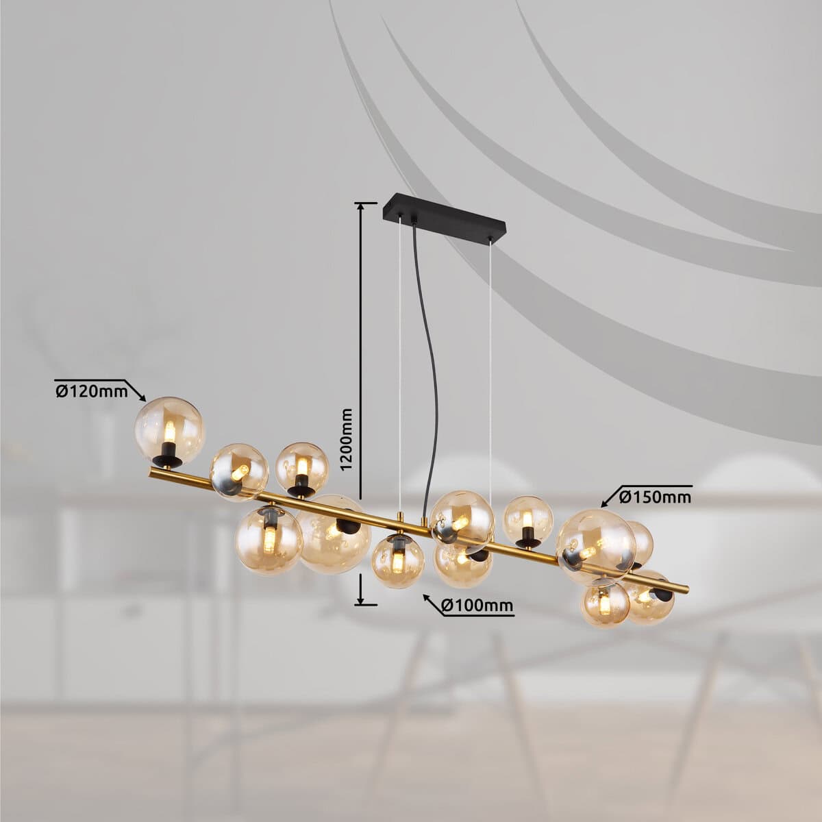 Uronite u fascinantan svijet RIHA viseće lampe, koja inspirira svojim jedinstvenim dizajnom i bezvremenskom elegancijom. Kombinacija mat crnog metala, mat mesinganih akcenta i toplog sjaja jantarnog stakla dat će vašoj sobi luksuznu atmosferu. Prozirni PVC kabl vam omogućava da podesite visinu po želji, stvarajući tako savršen ambijent. Različiti promjeri stakla (6×10 cm, 5×12 cm, 2×15 cm) stvaraju fascinantnu igru svjetla i sjene. RIHA dolazi u kompletu sa 13 G9 LED sijalica (3.5W, 230V, 350lm izvor, 290lm izlaz, 3000K) i nudi vam energetski efikasno osvetljenje sa toplom belom svetlošću. S dimenzijama od 1200 x 345 x 1200 mm, RIHA se harmonično uklapa u svaku prostoriju i postaje žarište vašeg doma. Unesite moderno svjetlo i bezvremensku eleganciju u svoj dom uz RIHA!