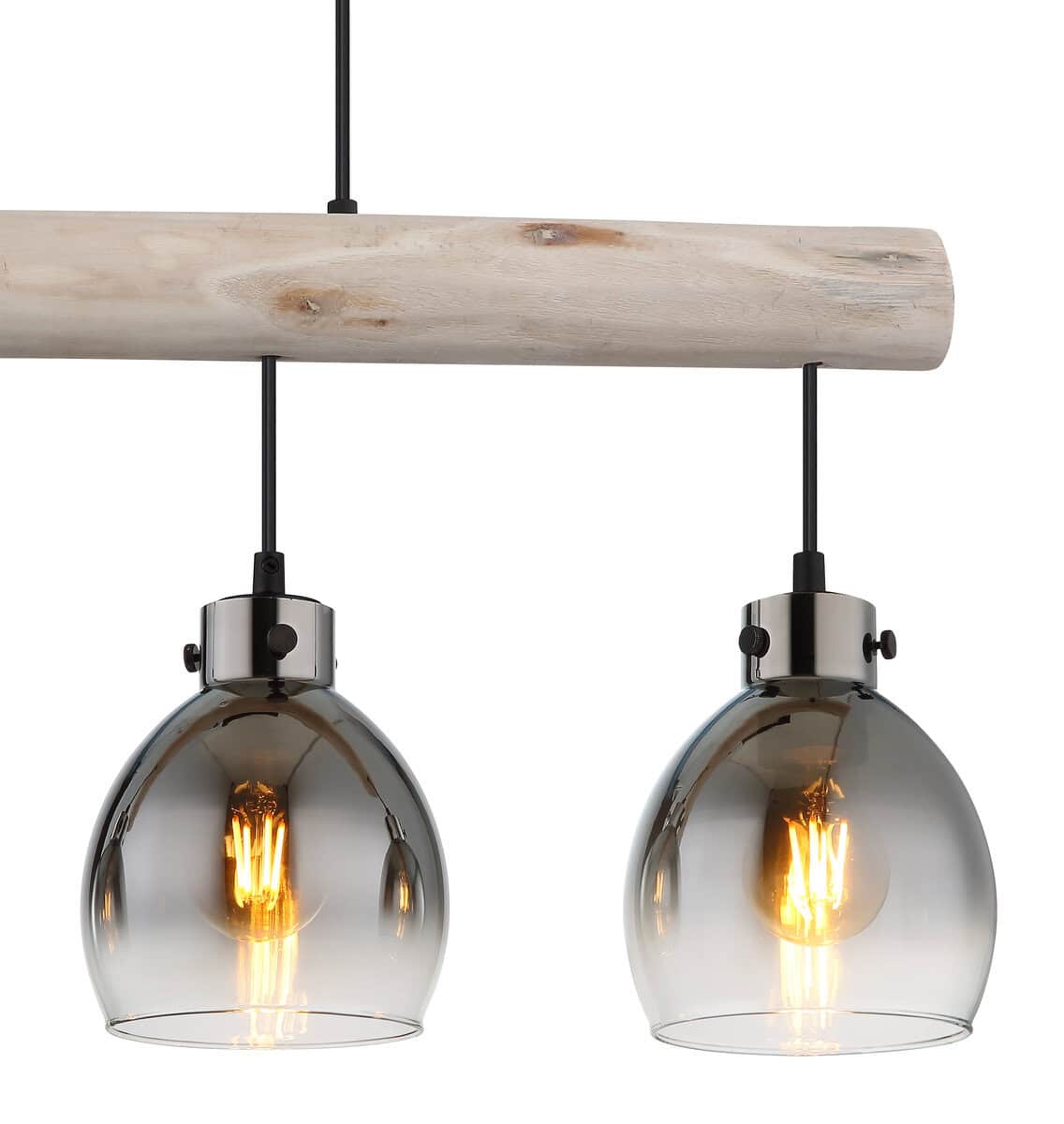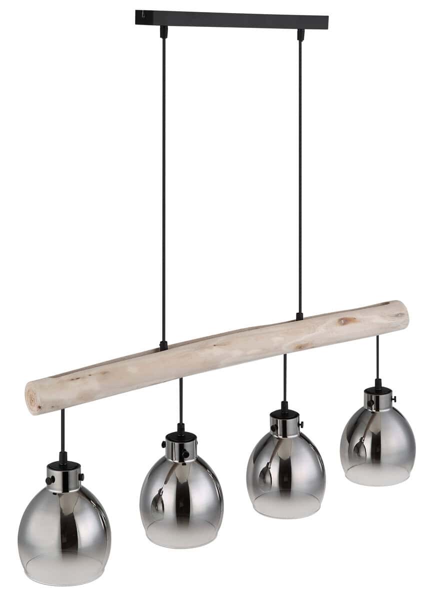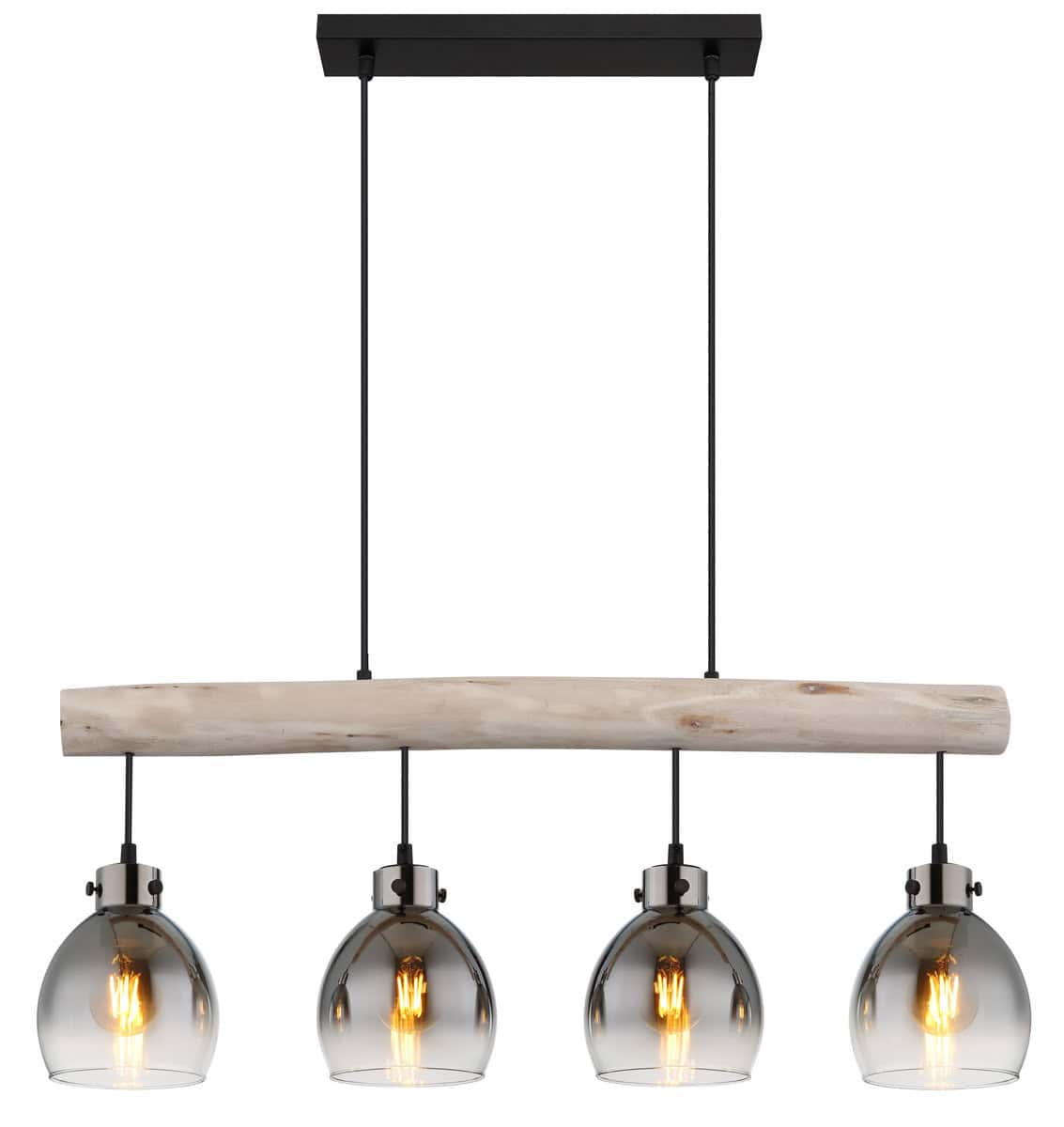 Viseća lampa RYAN je moderan dodatak koji se ističe svojom vintage estetikom i jednostavnim dizajnom. Tijelo je izrađeno od crno mat lakiranog metala, dok su drvene grede prirodne. Četiri okrugla, bulbusna sočiva su postavljena na ove grede i formiraju elegantno vidno polje. Izduženi oblik lampe omogućava fleksibilno postavljanje u vašem domu. Sjenilo je napravljeno od dimljenog stakla, što daje topao utisak. Viseća lampa RYAN savršen je primjer bezvremenskog dizajna koji svakoj prostoriji dodaje poseban šarm. Bilo u modernom ili tradicionalnom okruženju, RYAN visilica će opremiti vaše sobe karakterom i stilom.