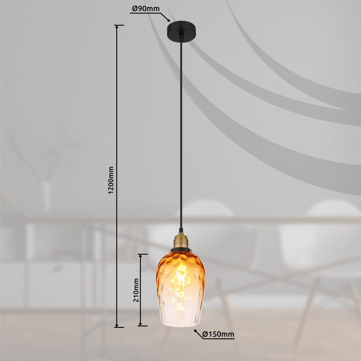 Doživite fascinantnu kombinaciju elegancije i stila sa ovom visećom lampom. Ova izuzetna lampa impresionira svojim elegantnim dizajnom od mat crnog metala i prozirnog, gradijent jantarnog stakla. Mat metal u boji mesinga daje lampi plemenit dodir. Sa prečnikom od 150 mm i visinom od 1200 mm, postavlja impresivne akcente u svaku prostoriju. Crni PVC kabel se neprimjetno uklapa u cjelokupnu sliku. E27 utičnica vam omogućava da sami odredite boju svjetla i svjetlinu do maksimalne snage od 60 vati. Stvorite atmosferu dobrodošlice.