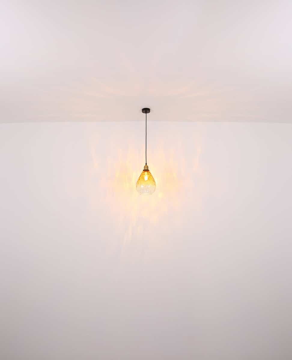 Uronite svoje sobe u toplo i privlačno svjetlo uz ovu viseću lampu. Ova elegantna lampa ima mat crno metalno kućište i prozirno ćilibarno staklo koje stvara fascinantno svjetlosno raspoloženje. Mat naglasak metala u boji mesinga daje lampi bezvremensku eleganciju. Sa prečnikom od 210 mm i visinom od 1200 mm, ova viseća lampa je stilski vrhunac u svakoj prostoriji. Crni PVC kabel se neprimjetno uklapa u dizajn. E27 utičnica vam omogućava da sami odredite boju svjetla i svjetlinu do maksimalne snage od 60 vati. Stvorite ugodnu atmosferu.