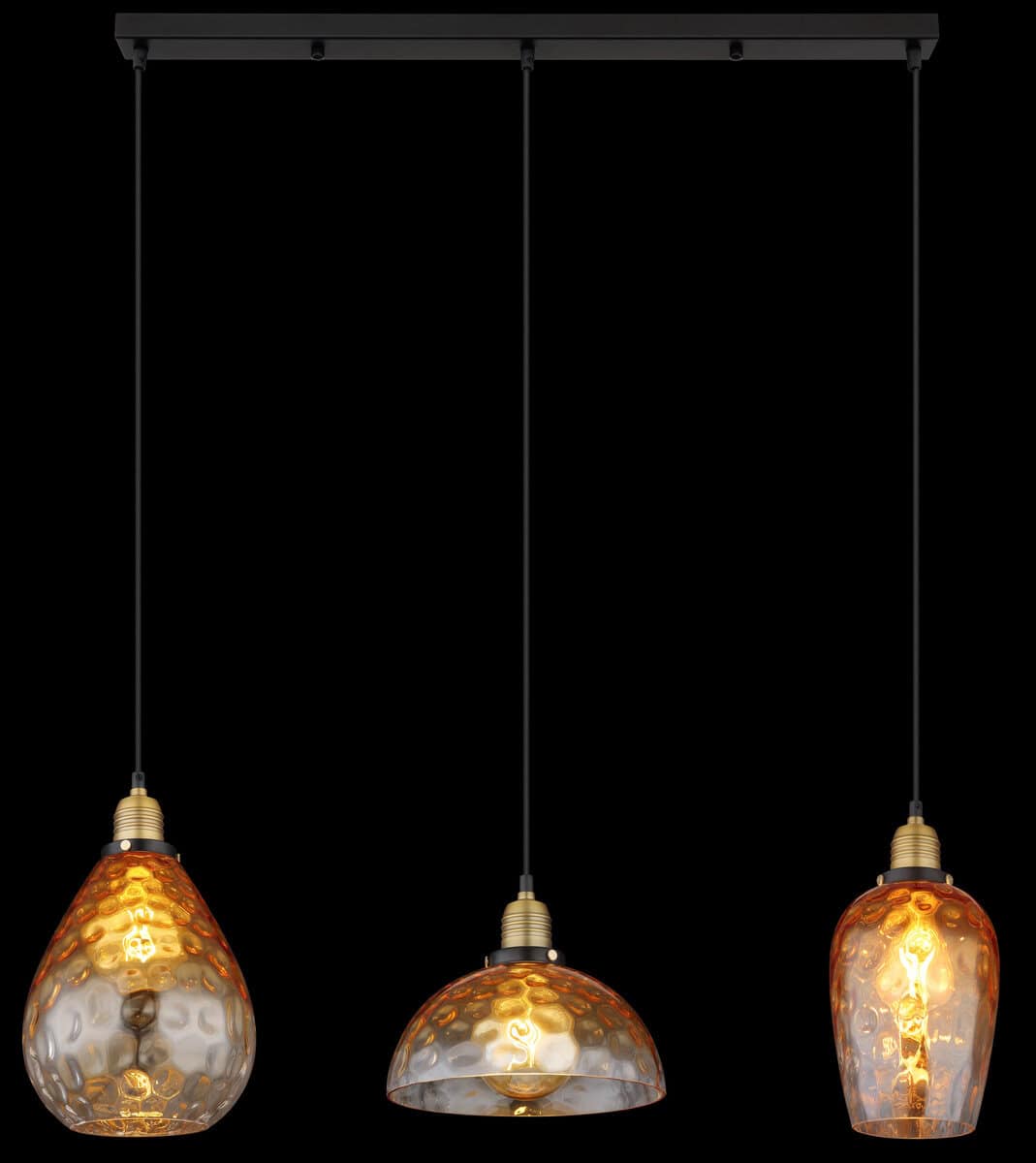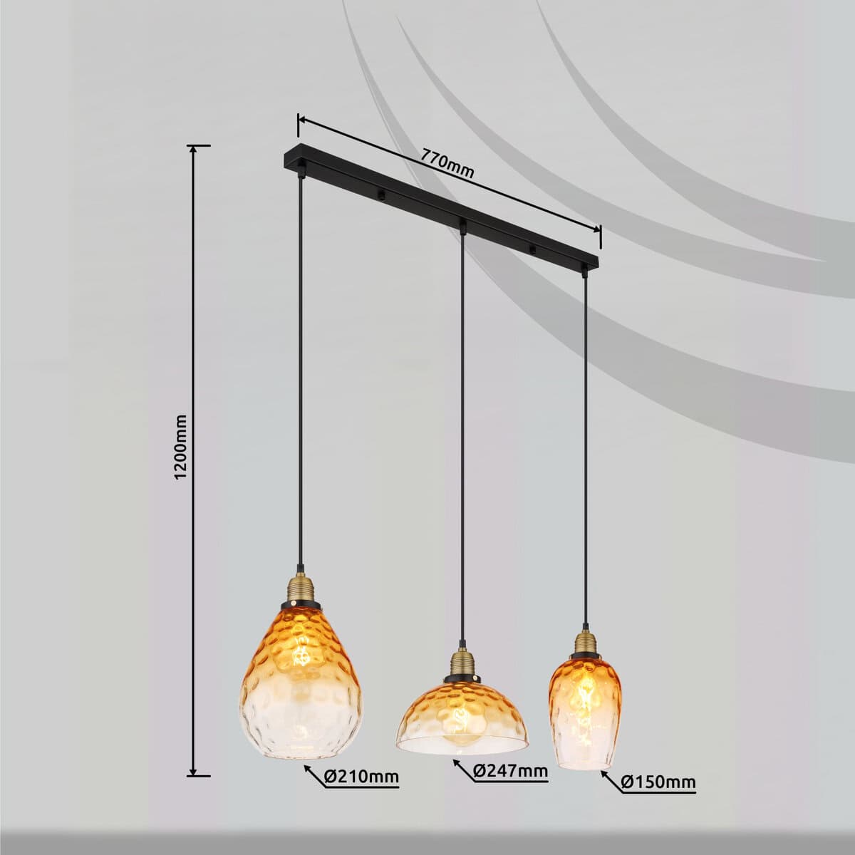 Otkrijte impresivnu viseću lampu sa 3XE27 grla. Kombinacijom crnog mat metala sa prozirnim jantarnim staklom, ova lampa će vašem prostoru dodati očaravajuću atmosferu. Mat naglasak metala u boji mesinga naglašava elegantan dizajn. Sa dimenzijama 910x250x1200mm, ova viseća lampa privlači poglede u svakoj prostoriji. Različiti prečnici stakla od 15 cm, 21 cm i 25 cm stvaraju dinamičan izgled. E27 okviri vam omogućavaju da sami odredite boju svjetla i svjetlinu do maksimalne snage od 60 vati. Stvorite toplu i ugodnu atmosferu.