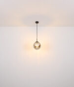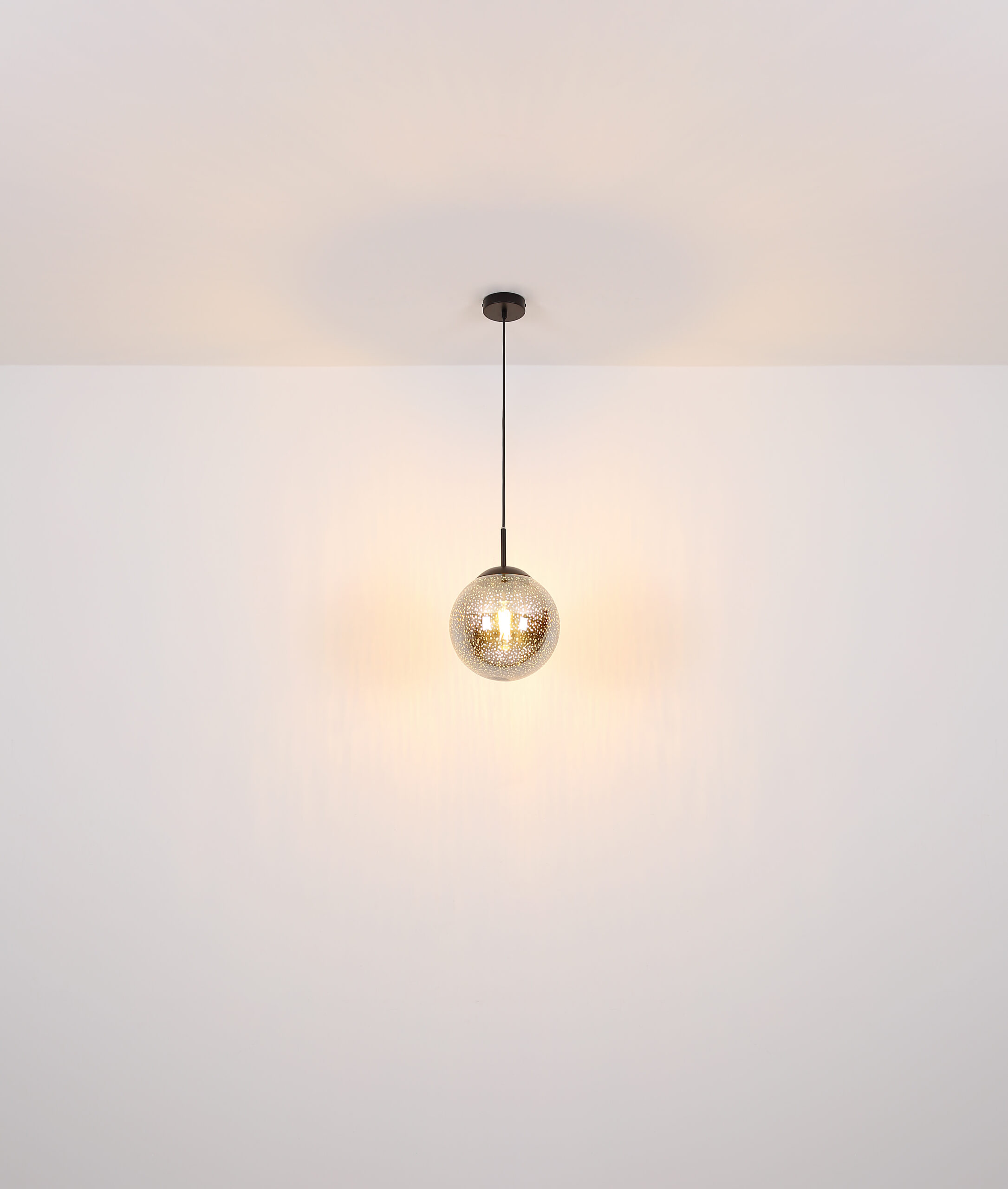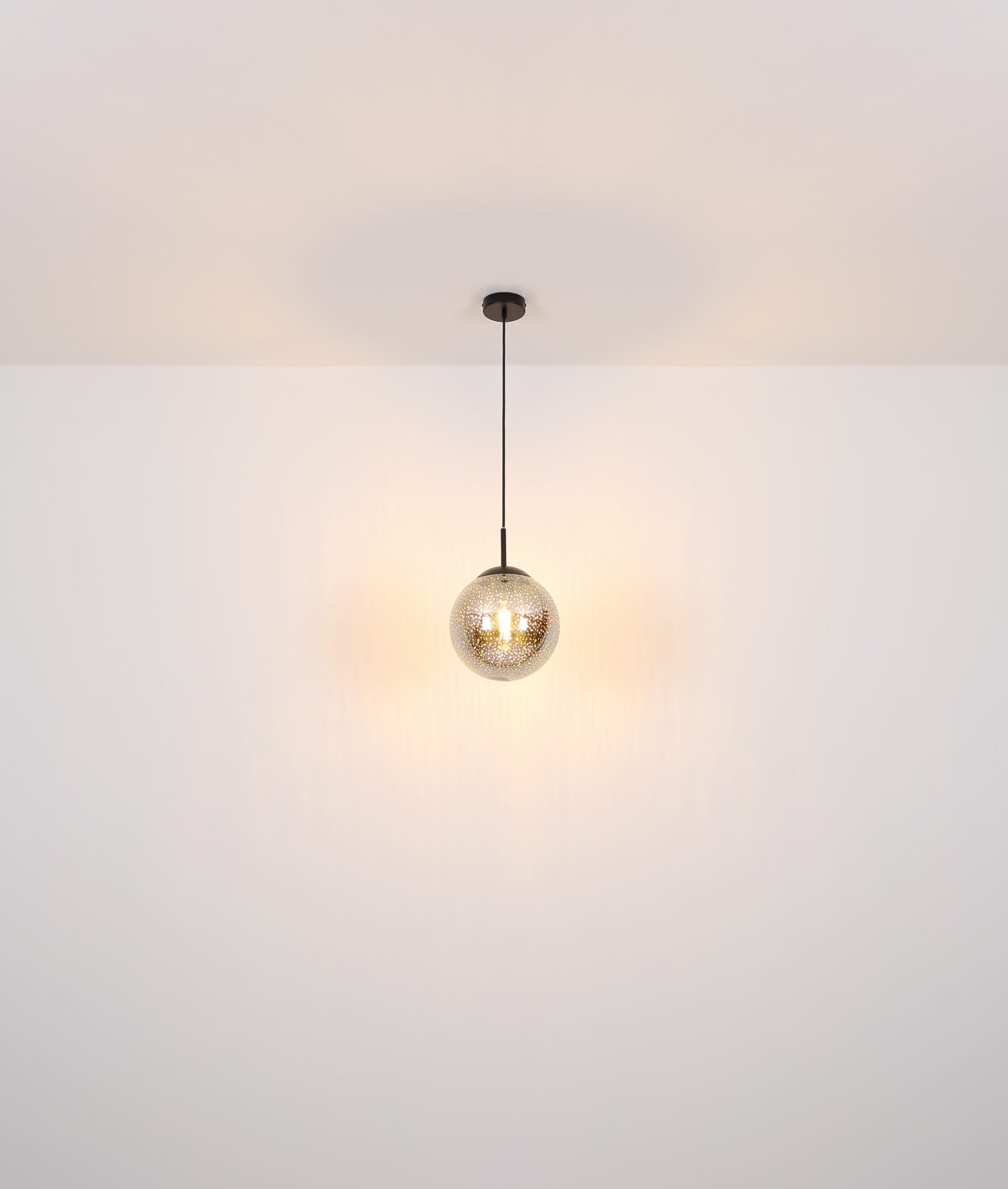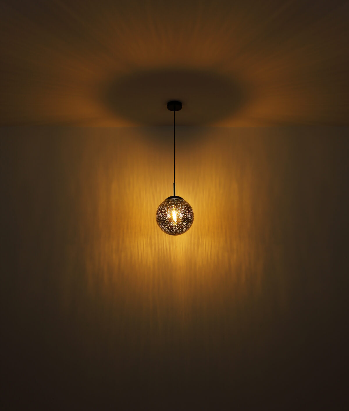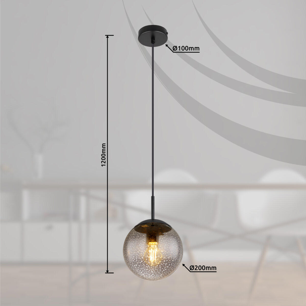 Ova prekrasna viseća lampa impresionira odličnim dizajnom. Od okruglog plafonskog priključka vodi crni kabel dužine 1,2 m do E27 utičnice, koja je opremljena staklenim abažurom u obliku zvijezde (Ø 20 cm). E27 utičnica vam omogućava da sami odredite boju svjetla i svjetlinu do maksimalne snage od 9 vati. Zbog dugovečnosti i uštede energije preporučujemo LED sijalice.