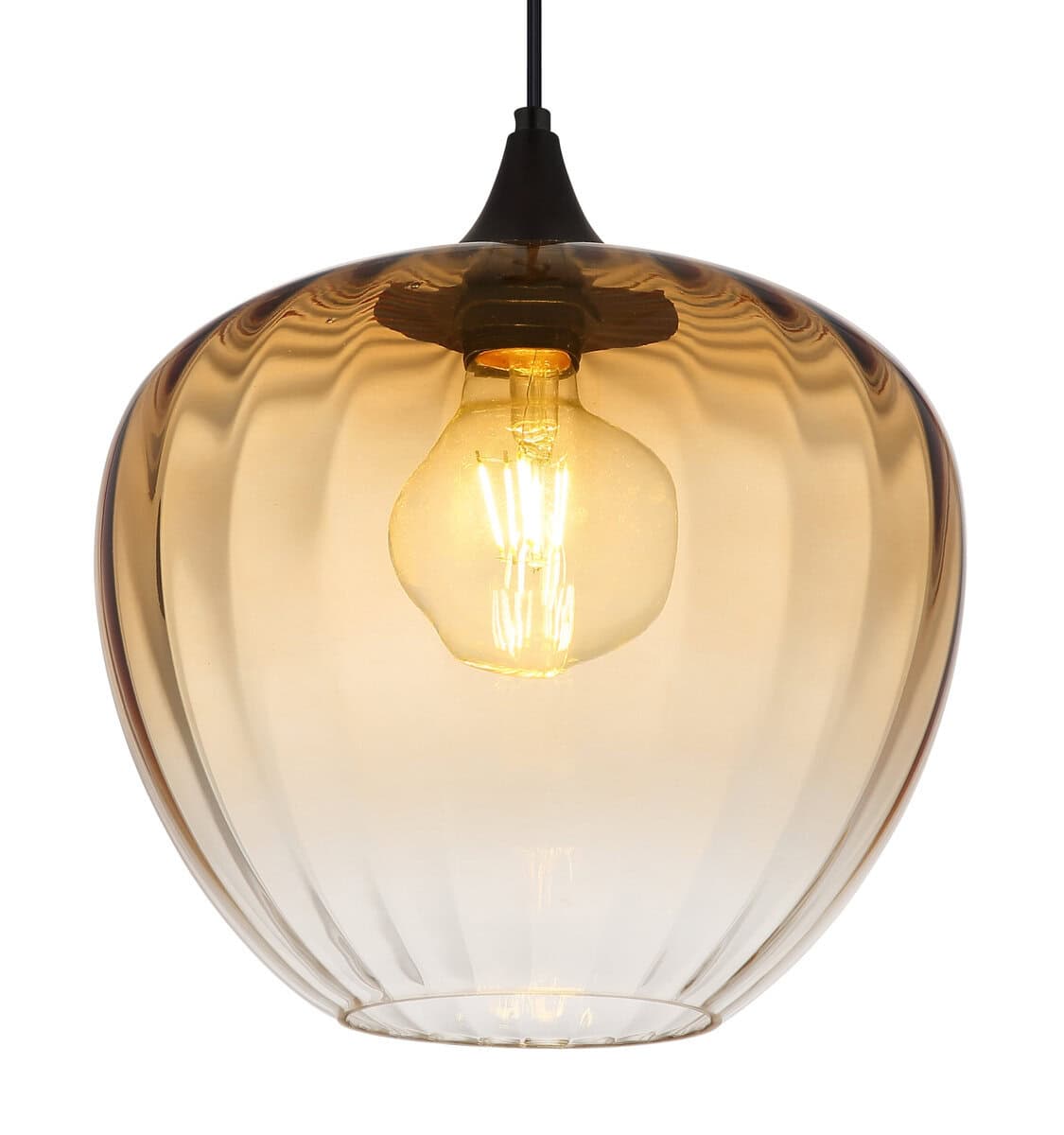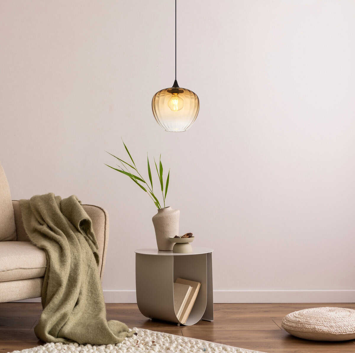 Viseća lampa SANDER kombinuje moderan dizajn sa modernim osvetljenjem. Okrugla, lukovičasta sjenilo od jantarnog stakla sa žljebovima i gradijentom boja stvara toplu, privlačnu atmosferu. Mat crno metalno kućište upotpunjuje dizajn i daje lampi eleganciju. Idealno za trpezariju ili dnevni boravak, grlo E27 omogućava fleksibilan izbor sijalice.