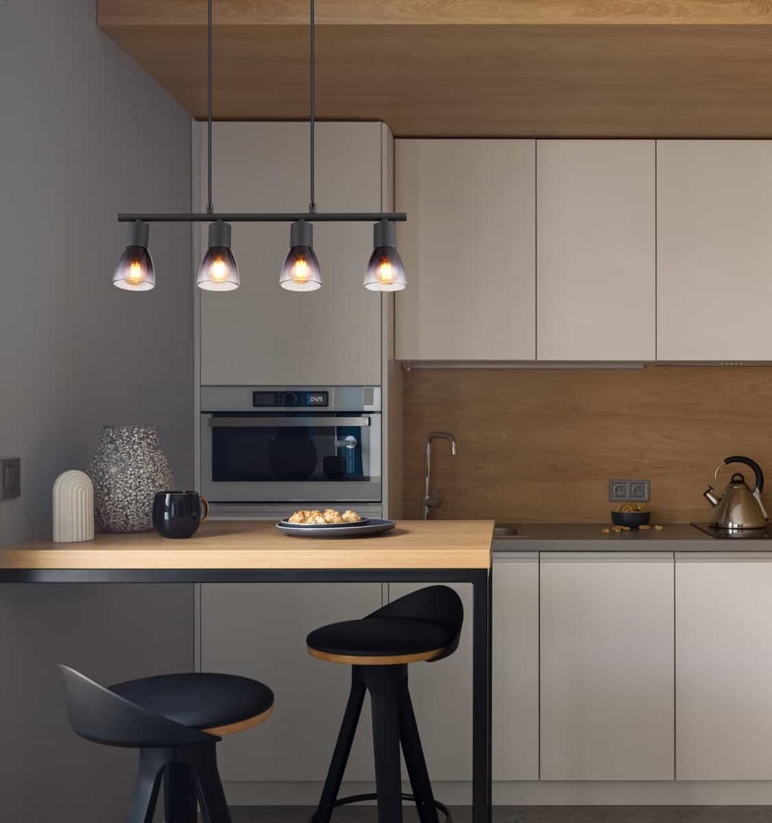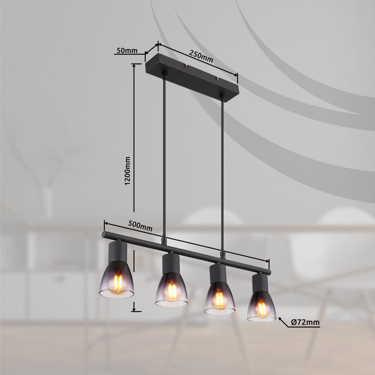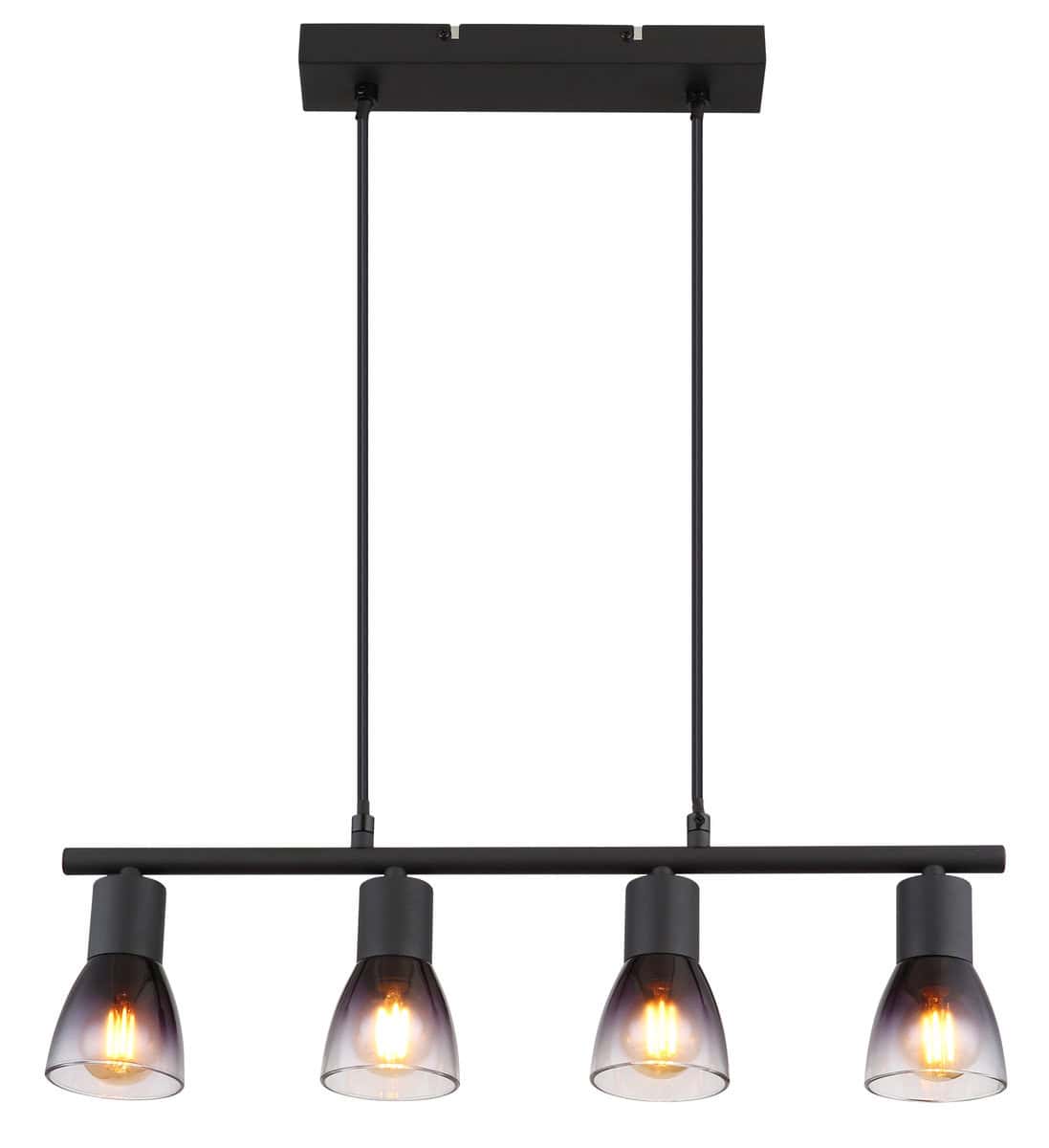 Izdužena viseća lampa sa ravnom šipkom je moderan i moderan rasvjetni element za vaš dom. Tijelo izrađeno od crnog mat lakiranog metala daje privjesnoj lampi plemenit izgled, dok prozirno staklo boje dima daje ugodno svjetlo. Sa četiri E14 reflektora i ukupnom snagom od 25W, ova viseća lampa nudi dovoljno svjetla za vašu sobu. Jasna gradijentna struktura stakla daje lampi poseban štih i čini je privlačnom za oči u svakoj prostoriji. Sa dužinom od 520 mm i širinom od 72 mm, visilica se skladno uklapa u različite stilove opremanja i postavlja stilske akcente. Unesite eleganciju i svjetlost u svoj dom sa ovom modernom visećom lampom.