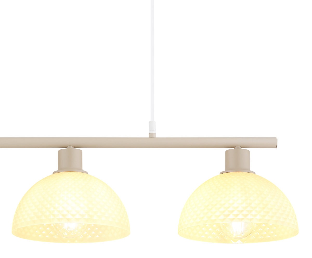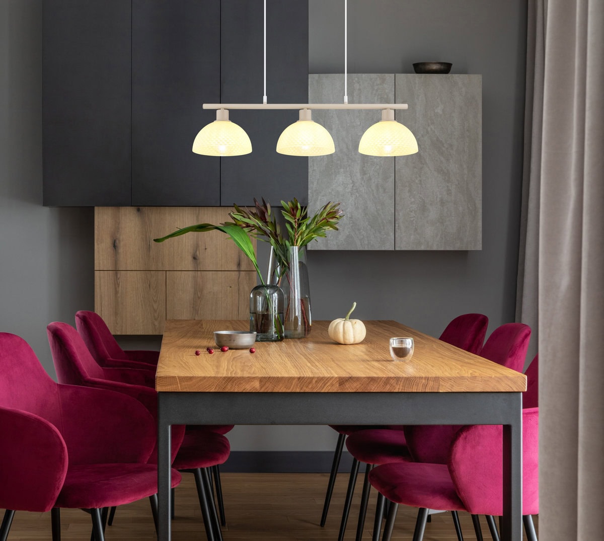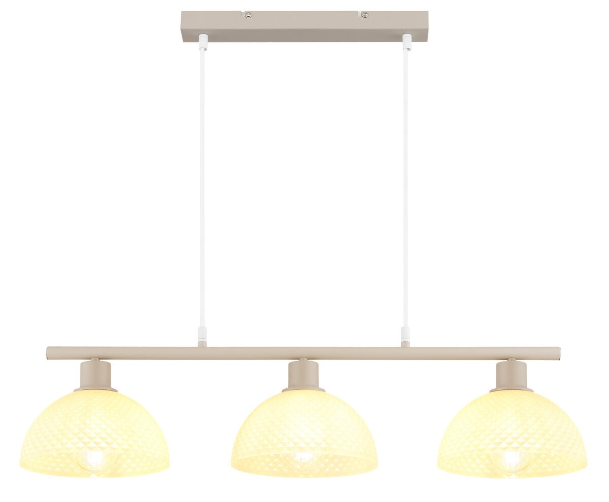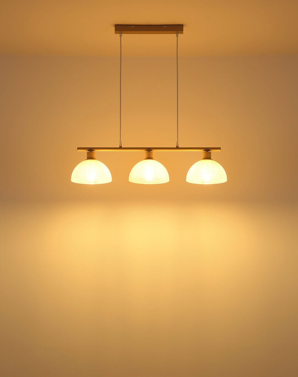 Viseća lampa SELMA kombinuje moderan, linearni dizajn sa dekorativnom elegancijom, dodajući stilske akcente iznad trpezarijskih stolova, radnih prostora ili dnevnih zona. Izdužena greda izrađena od mat metala boje pijeska odiše visokokvalitetnom izradom i čini elegantnu osnovu za uređaj. Tri ili više polusfernih nijansi u staklu boje šampanjca s ukrasnim uzorcima ravnomjerno raspoređuju svjetlost, stvarajući ugodnu atmosferu bez odsjaja. Mjerenje D: 770 mm, Š: 200 mm, SELMA viseća svjetiljka nudi upečatljivu prisutnost bez preopterećenja prostorije, idealna za srednje do velike stolove ili prostore. Svjetlo koristi sijalice E27 (nisu uključene), što omogućava individualni odabir izvora svjetlosti. Zahvaljujući kombinaciji vrhunskog metala, elegantnog stakla i dekorativnog dizajna, visilica SELMA je savršen izbor za svakoga tko traži elegantno, funkcionalno osvjetljenje koje služi i kao dekorativni dodatak.