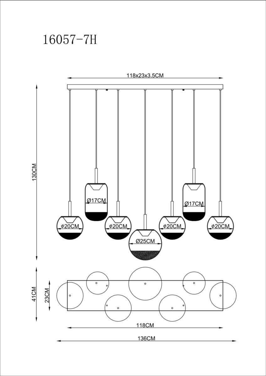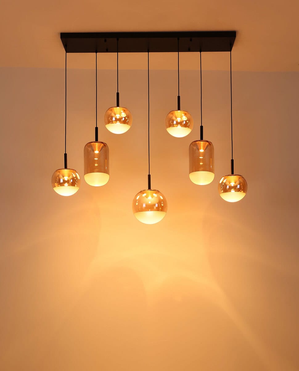 Viseća lampa SEVERIN impresionira svojim kreativnim dizajnom i sedam različitih čaša koje stvaraju posebnu svjetlosnu atmosferu. Pravougaono kućište izrađeno od mat crnog metala čini moderan kontrast nijansama od aluminijuma u mesinganoj boji i satenskim sočivima boje ćilibara. Ova kombinacija osigurava ujednačeno i toplo osvjetljenje koje se savršeno uklapa u različite koncepte prostorija. Sa dužinom od 1360 mm i širinom od 410 mm, visilica je idealna za velike trpezarijske stolove ili kao atmosfersko akcentno osvetljenje u dnevnim sobama. Integrisana LED tehnologija isporučuje lumenski izlaz od 2250 lumena pri temperaturi boje od 3000K (topla bela). Ova viseća lampa kombinuje plemenite materijale i inovativan dizajn kako bi stvorila funkcionalno osvetljenje i ugodnu atmosferu. Savršeno privlači poglede za moderne sobe koje zrači elegancijom i stilom.