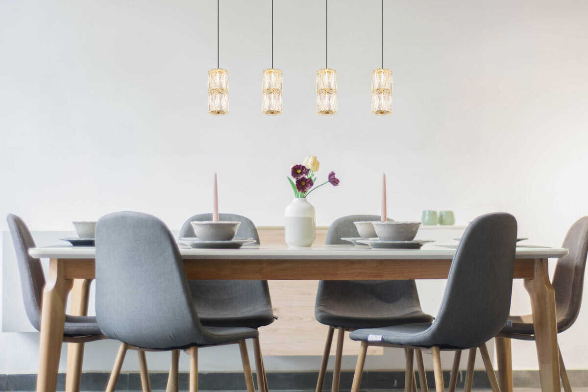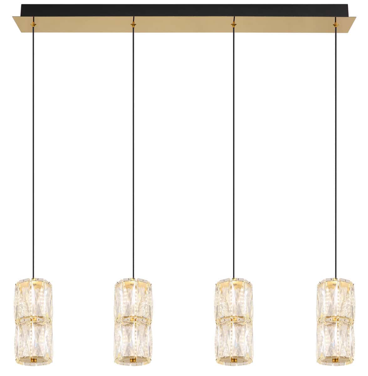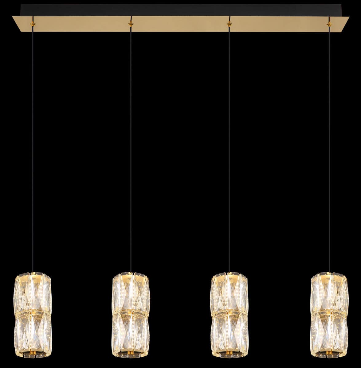 Viseća lampa STEFANIE sa četiri cilindrična sjenila od prozirnih staklenih kristala unosi svjetlost i eleganciju u svaku prostoriju. Starinski zlatni ton i mat crno metalno kućište pružaju moderan izgled. Sa dužinom od 845 mm i jačinom lumena od 2000, idealan je za velike trpezarije ili dnevne sobe. Temperatura tople bijele boje od 3000 K stvara ugodnu atmosferu i poziva vas da ostanete. Ova viseća lampa kombinuje estetiku i funkcionalnost i postavlja stilske akcente u vaš enterijer.