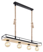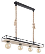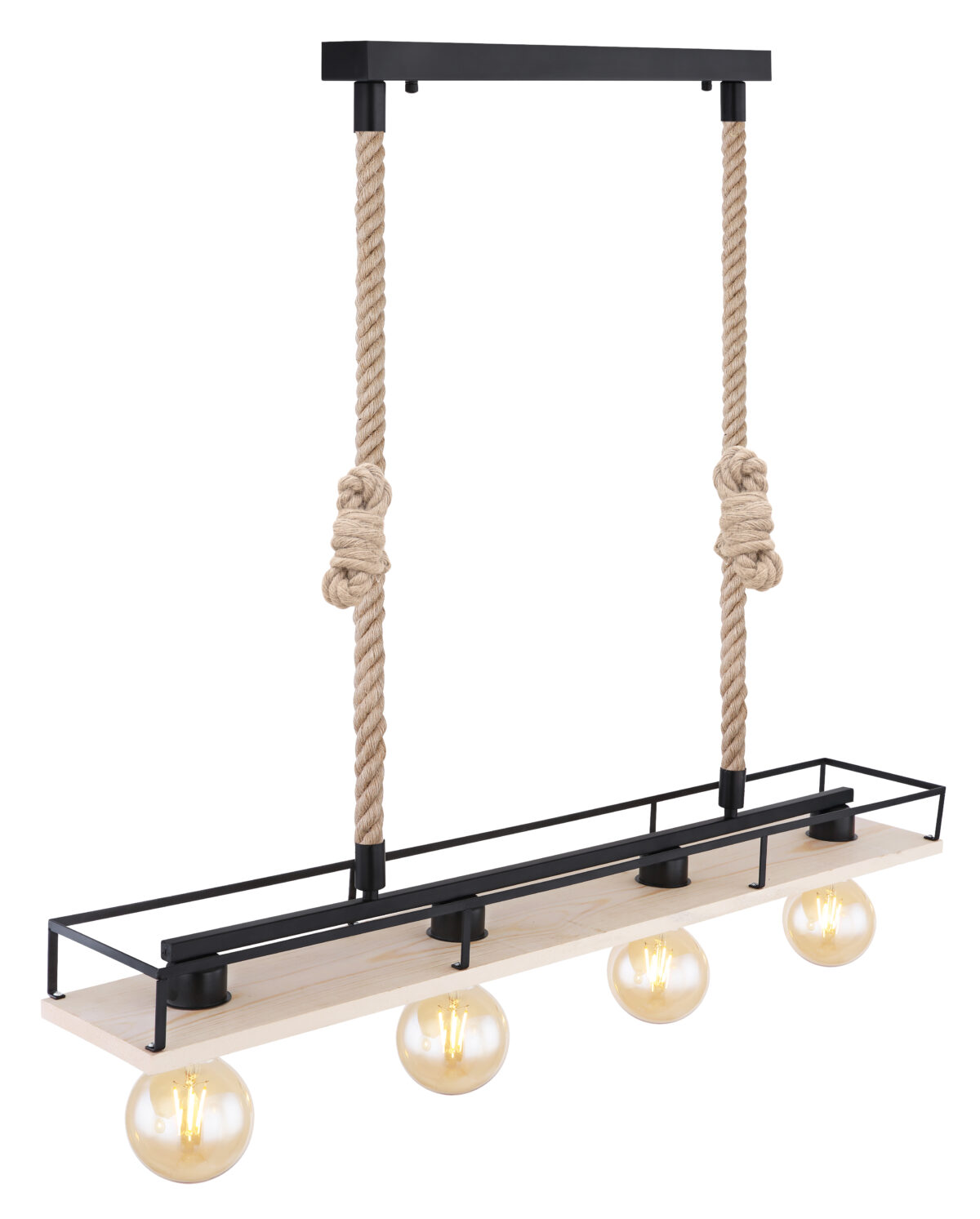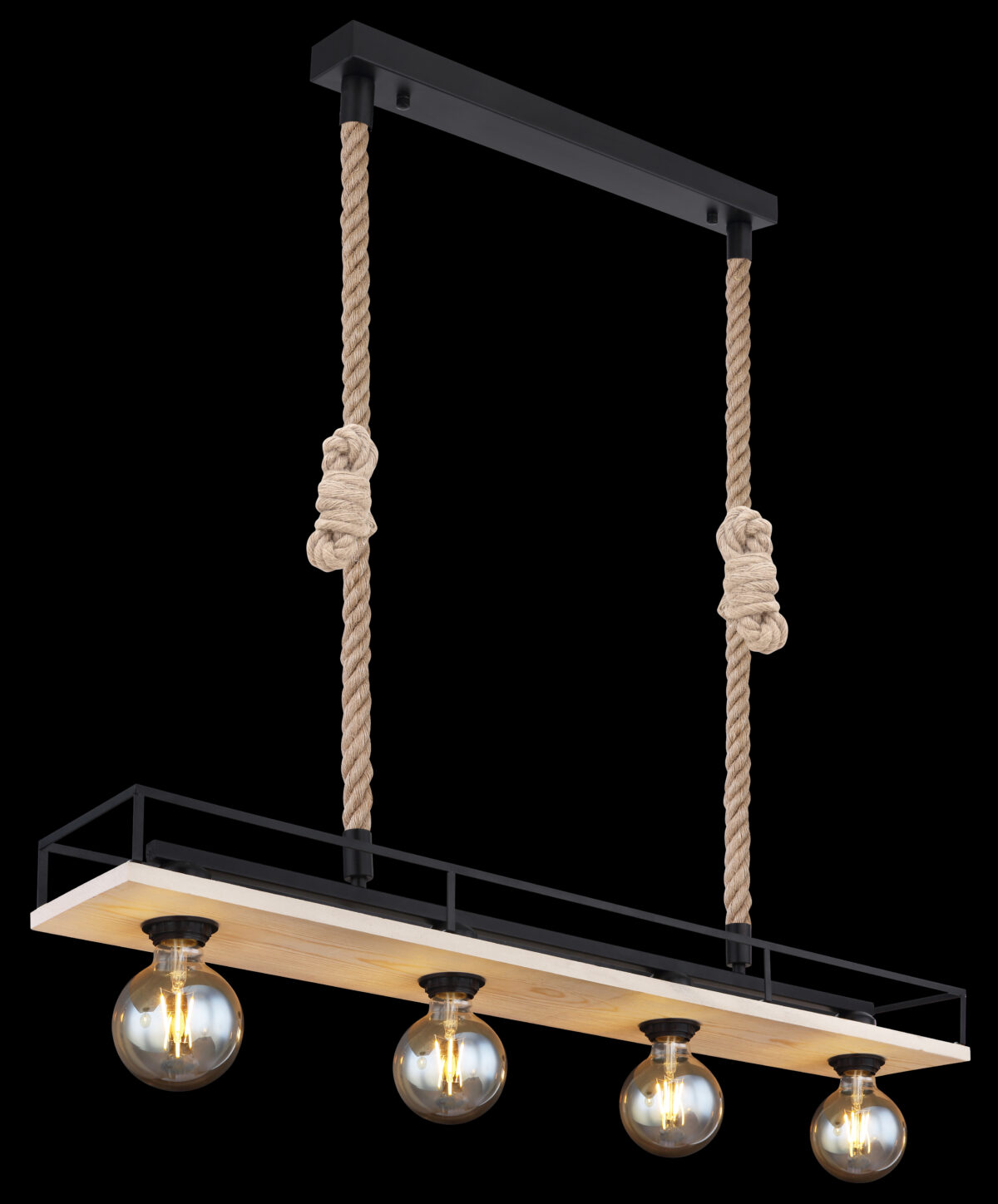 Ova rustikalna viseća lampa je odlična za vaš enterijer. Viseća lampa dužine 95 cm sastoji se od drvene ploče koja visi sa plafona na crnom metalnom okviru na dva kabla uokvirena konopljinim užetom. Četiri E27 utičnice u drvenom panelu mogu biti opremljene odgovarajućim lampama po Vašem izboru, što Vam daje mogućnost da individualno odredite boju svjetla i svjetlinu. Osim toga, visina viseće lampe može se podesiti do 120 cm tokom ugradnje. Uz više članaka iz iste serije možete upotpuniti cjelokupnu sliku u svoja četiri zida.