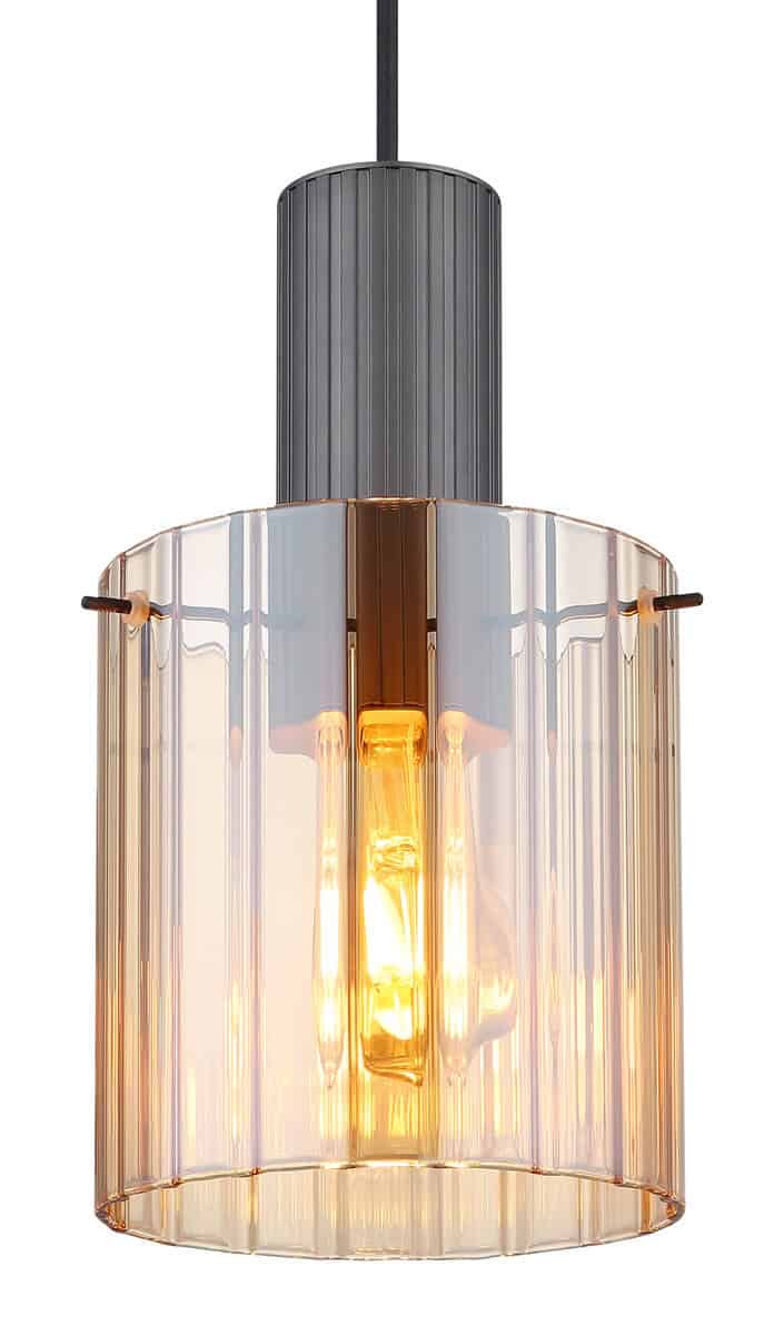 Tamno siva metalna viseća lampa je prekrasan dodatak vašem domu. Opremljen okruglim cilindričnim staklom u toplom ćilibaru i elegantnim žljebovima, stvara ugodno i atmosfersko svjetlo. Stakleno sjenilo prečnika 180 mm nudi prostor za E27 sijalicu snage do 40W. Tijelo visilice izrađeno je od robusnog metala tamno sive boje, koji pruža moderan i plemenit izgled. Ova viseća lampa je savršen izbor da svom domu date toplu i prijatnu atmosferu.