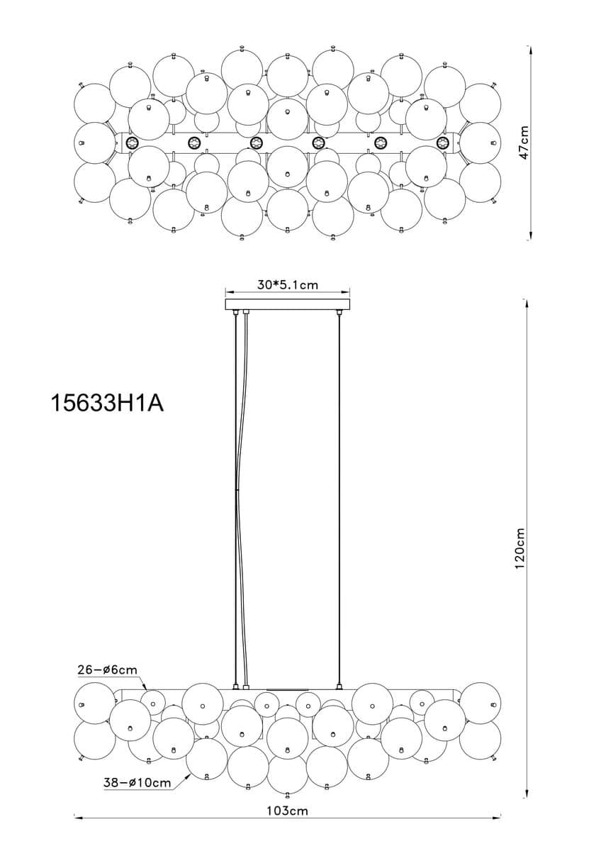 UDO visilica nudi jedinstvenu kombinaciju dizajna i svjetla. Izdužena šina s ravnim gredama opremljena je šipkama s obje strane, koje su opremljene kuglicama različitih veličina. Ova jedinstvena konstrukcija stvara jedinstven izgled koji osvjetljava prostoriju. Viseća lampa je definisana kućištem od crnog mat lakiranog metala i metalnim licem od lakiranog metala zlatne boje. Sjenila su napravljena od staklenih kuglica u toploj, jantarnoj završnoj obradi koje stvaraju predivno osvjetljenje. Viseća lampa UDO je idealan izbor za sve koji traže jedinstveno i stilizovano rešenje za svoju rasvetu. Svojim jedinstvenim oblikom i prekrasnim dizajnom učinit će svaku prostoriju u centru pažnje.