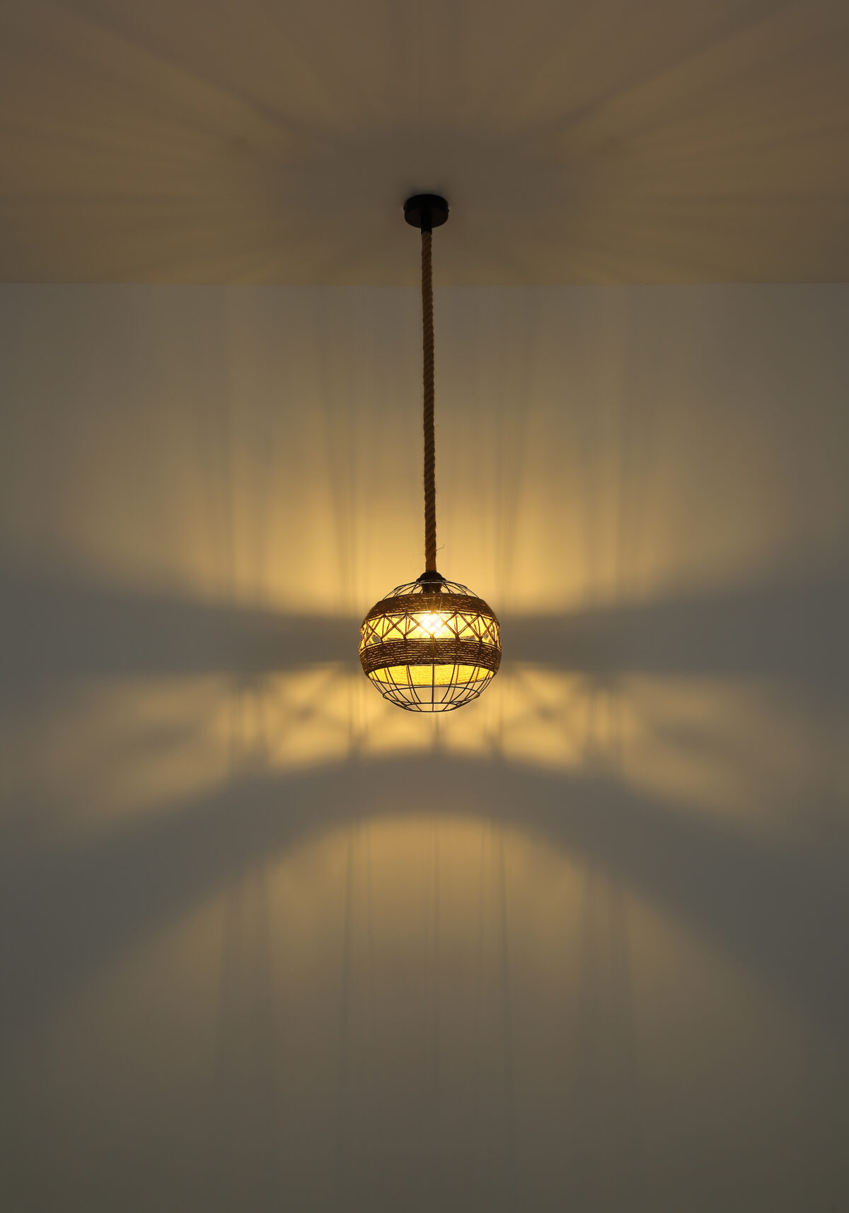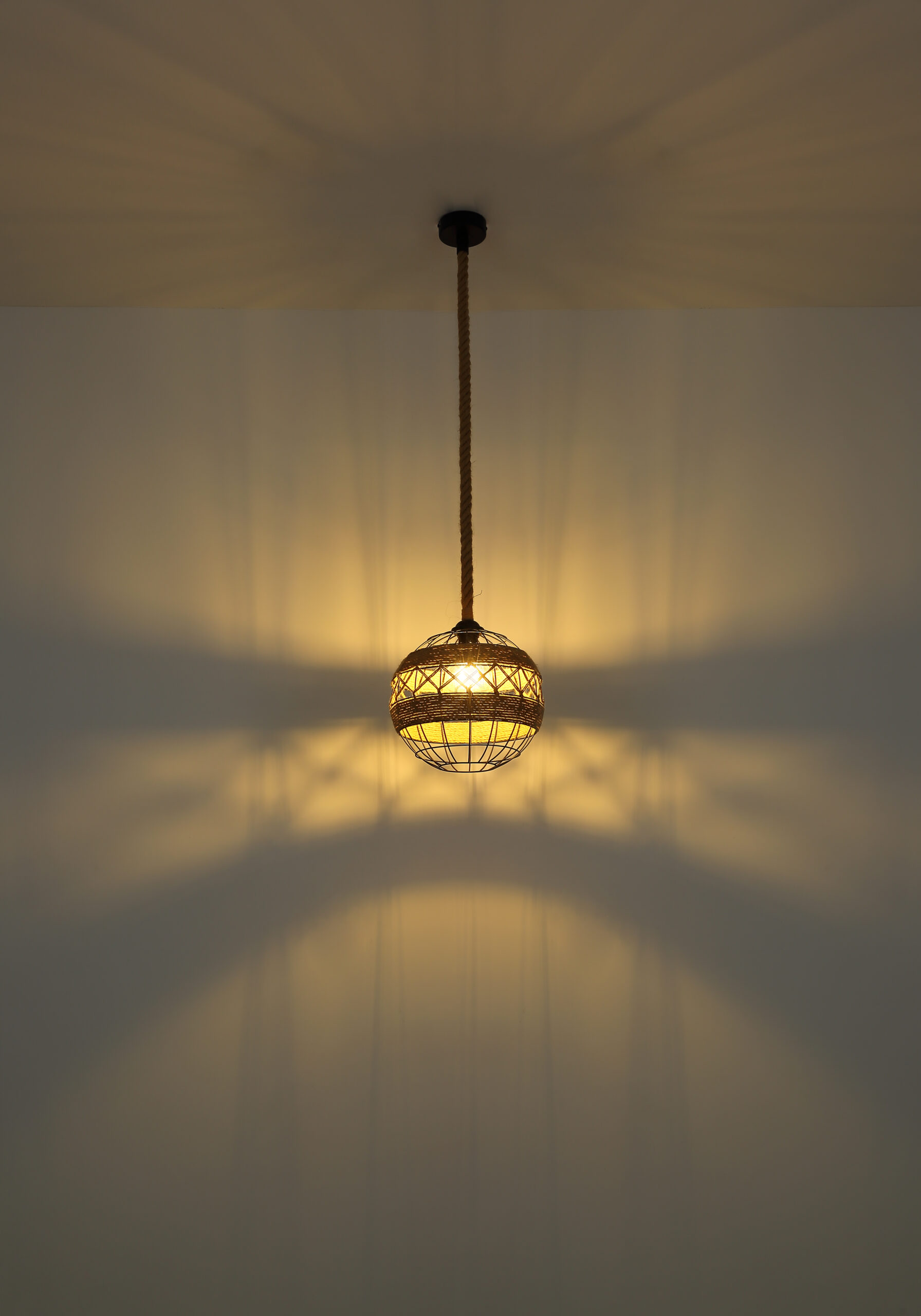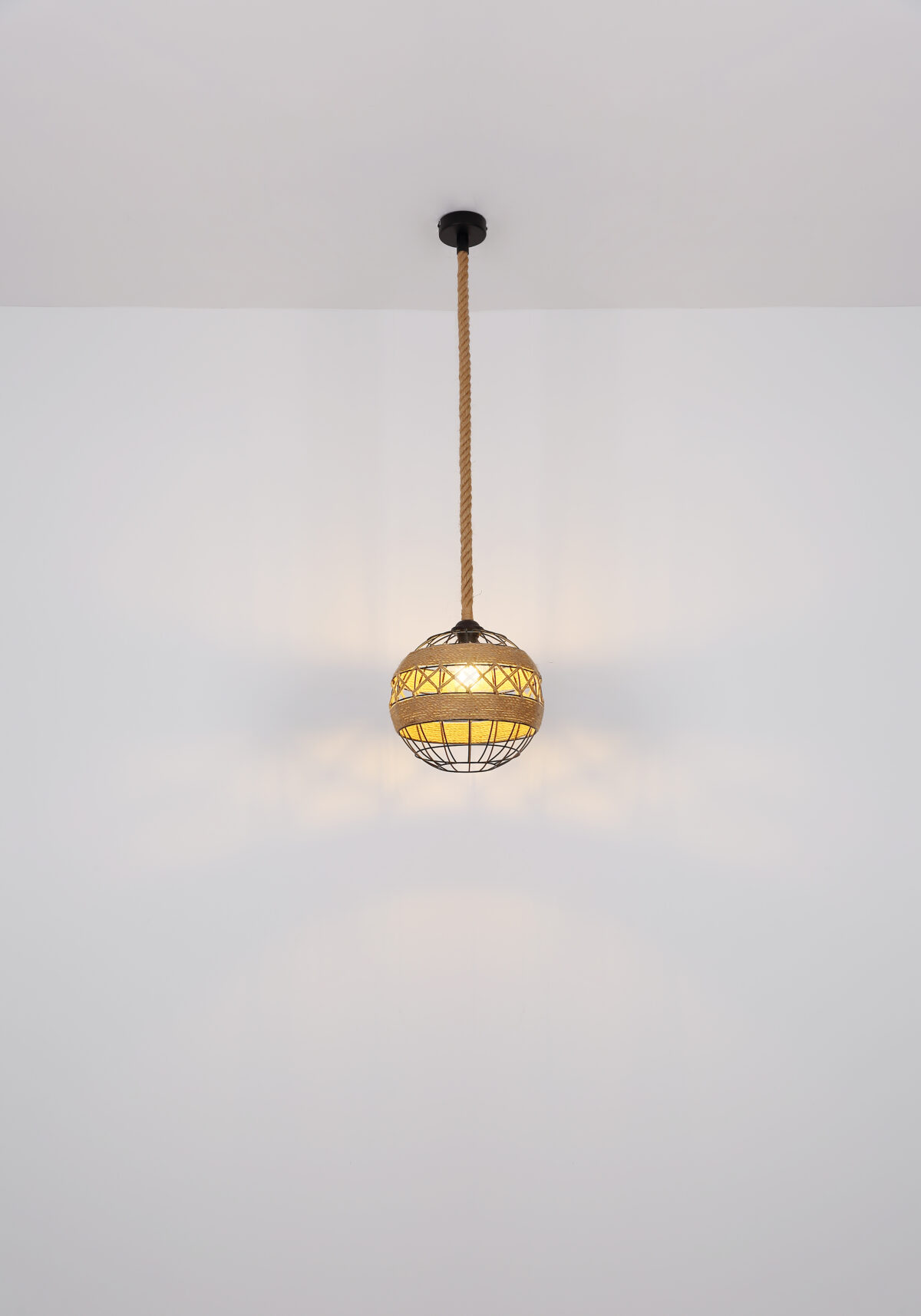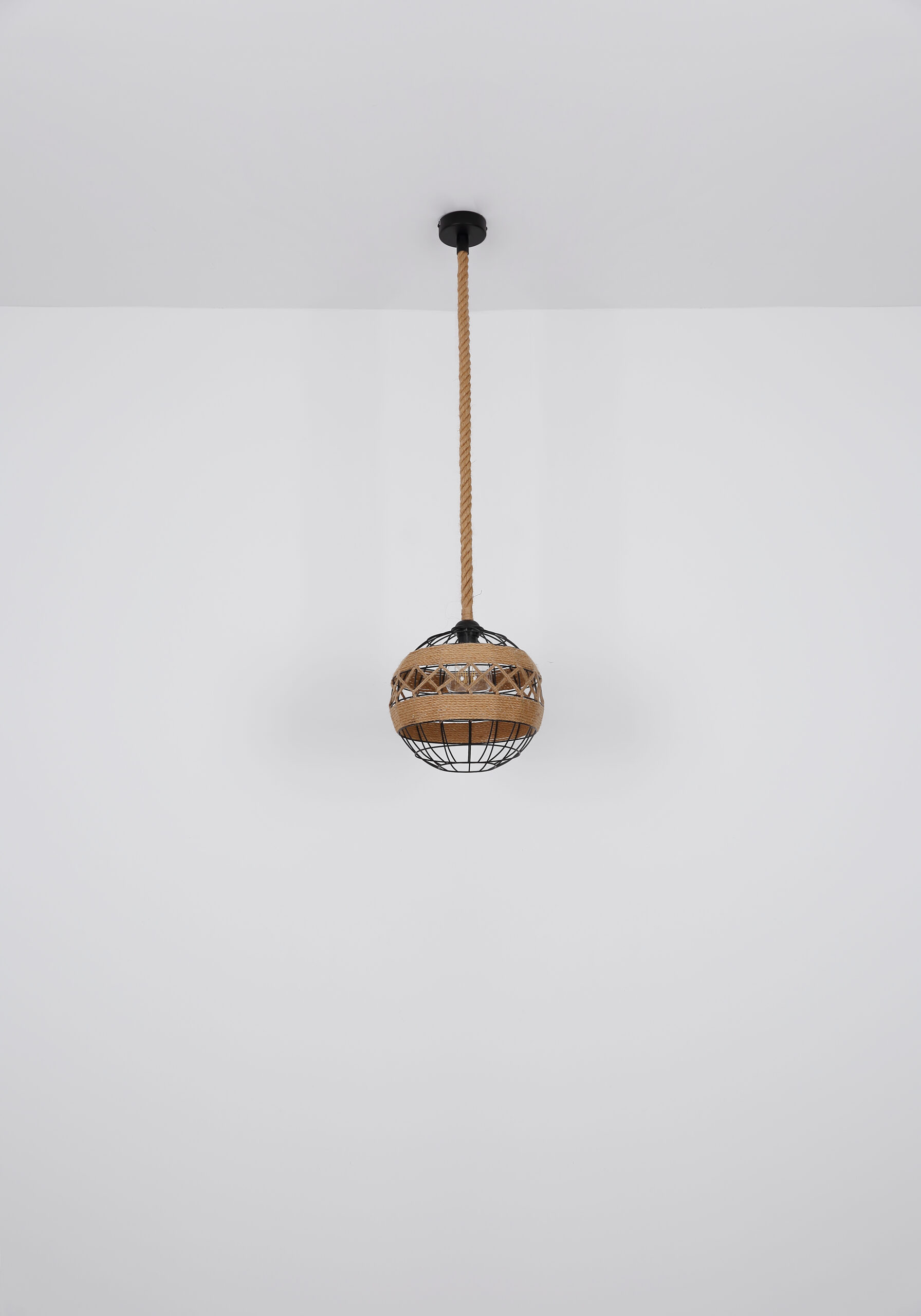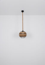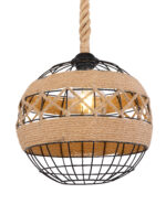 U ovoj privjesnoj lampi nećete pronaći klasičan sjenilo, ali umjesto toga ćete pronaći zanimljivu konstrukciju napravljenu od smeđeg konoplje od konoplje koje se vijuga oko središta svjetiljke i tako stvara poseban izgled.