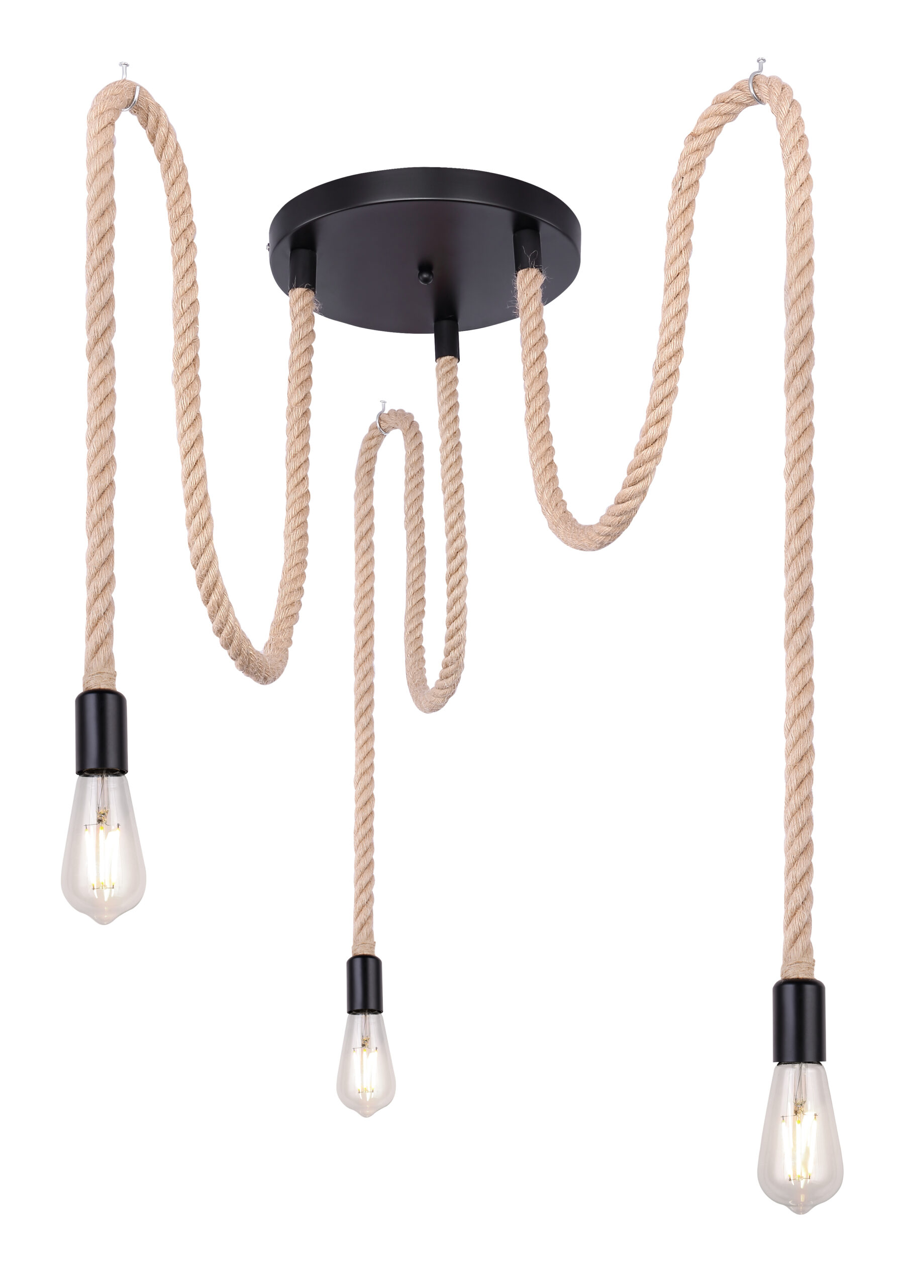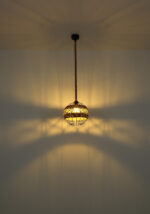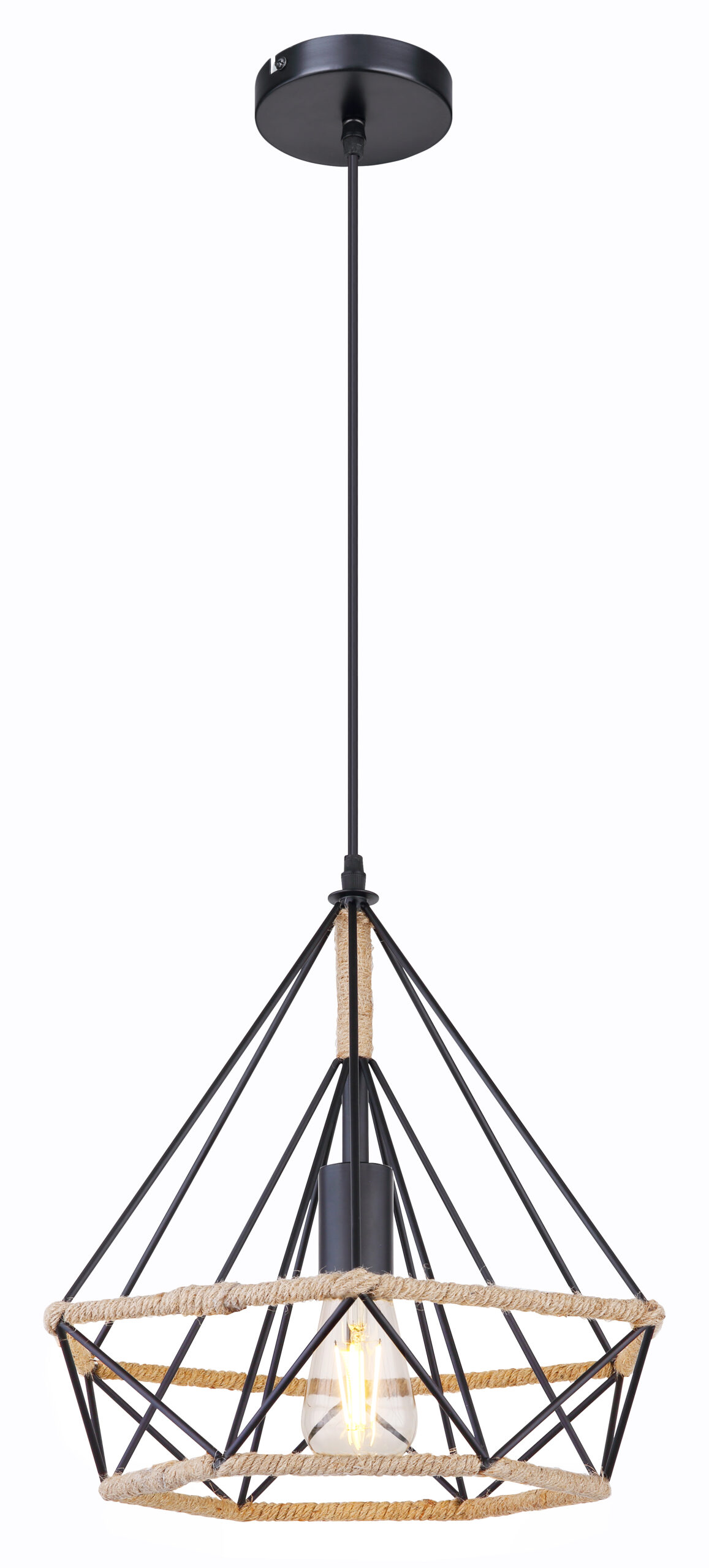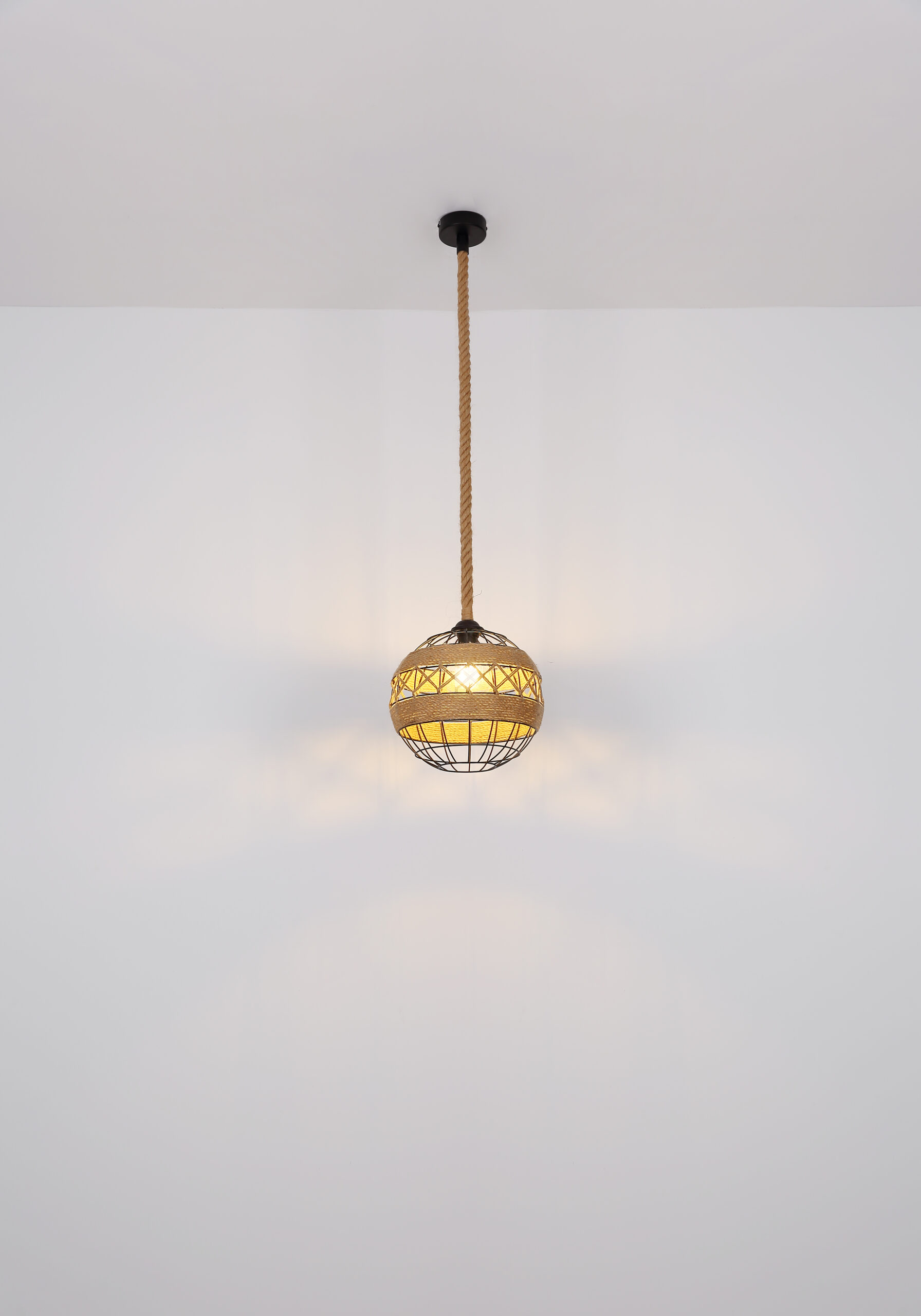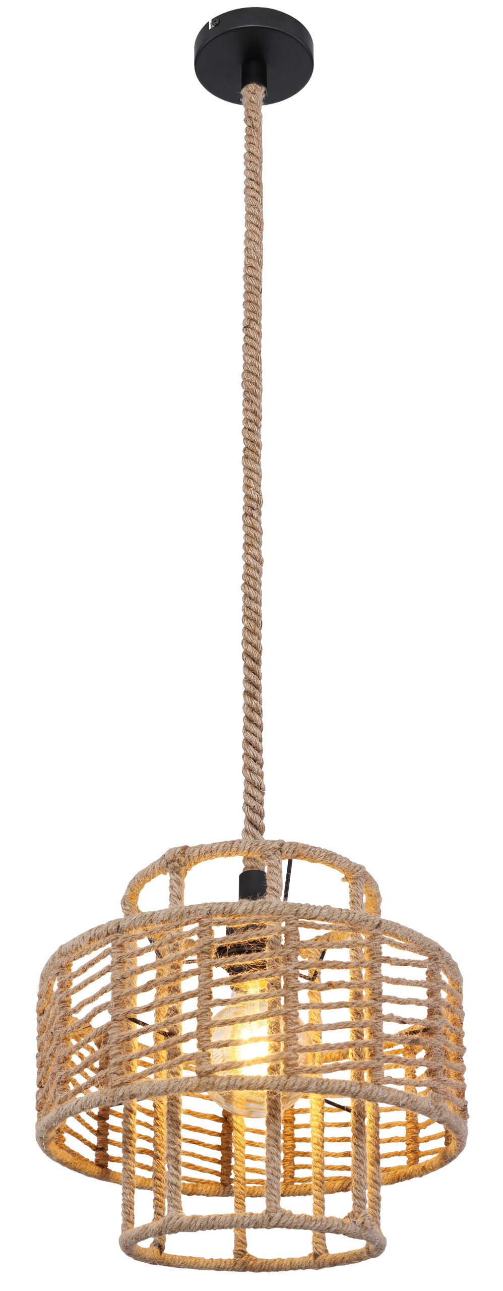 U ovoj privjesnoj lampi nećete pronaći klasičan sjenilo, ali umjesto toga ćete pronaći zanimljivu konstrukciju napravljenu od smeđeg konoplje od konoplje koje se vijuga oko središta svjetiljke i tako stvara poseban izgled.
