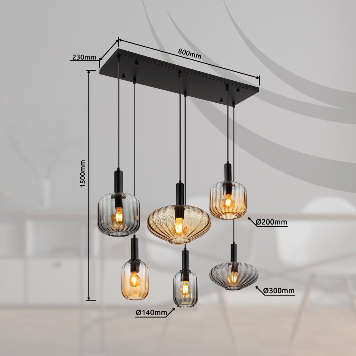 Pravougaona visilica sa kućištem od mat crnog metala i šest visećih čaša u različitim oblicima i bojama savršen je izbor za moderno i stilizovano osvetljenje u većim prostorijama. Sa dužinom od 1000 mm i širinom od 470 mm, ova viseća lampa nudi dovoljno prostora za šest E27 utičnica, svaka od 60 W snage, kako bi se stvorila velika i ugodna rasvjeta. Tijelo izrađeno od mat crnog metala daje svjetiljci plemenit izgled i savršeno se uklapa sa staklima različitih oblika i boja – tri u jantarnoj i tri u dimnoj boji. Odlična za upotrebu iznad izduženog trpezarijskog stola, u velikoj dnevnoj sobi ili u elegantnom ulazu, ova viseća lampa svojim modernim dizajnom dodaje dašak elegancije. Unesite atraktivnu rasvjetu u svoj dom uz ovu pravougaonu viseću lampu od mat crnog metala i razna stakla u ćilibarskim i dimnim bojama.