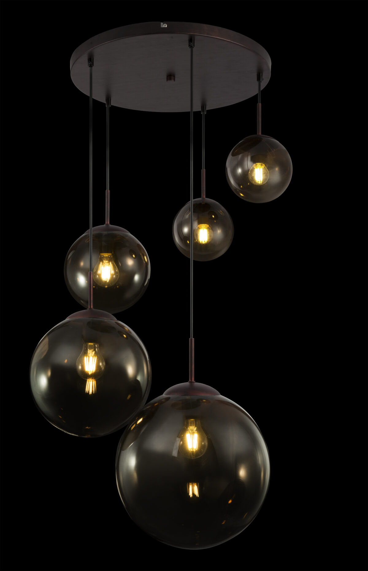 Ova futuristička viseća lampa impresionira fascinantnim rasporedom svojih pet rasvjetnih elemenata u različitim visinama i veličinama. Kombinacija smeđeg metala i jantarnog stakla čini ovu lampu jedinstvenom privlačnom za oči. Svetiljka je opremljena sa pet E27 utičnica (max.60W). Preporučujemo da koristite LED sijalice zbog njihove dugovečnosti i uštede energije. Sa ostalim modelima ove serije možete upotpuniti sliku u svojim sobama.