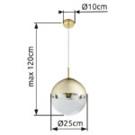 Ova moderna visilica iz serije Varus uvjerava svojim prekrasnim izgledom. Promjer staklenog sjenila je 25cm i viri u prostoriju sa visinom od 120cm. U gornjem dijelu je staklena kugla zlatne boje. Njegov dizajn garantuje da će privući oči u svakom dnevnom boravku ili spavaćoj sobi. Zahvaljujući grlu E27, imate mogućnost da odredite sijalicu do maksimalno 40 vati. U zavisnosti od boje i intenziteta svetlosti koju želite da imate. Preporučujemo LED lampe zbog njihove izdržljivosti i uštede energije. Viseću možete odlično kombinovati sa ostalim artiklima iz ove serije.