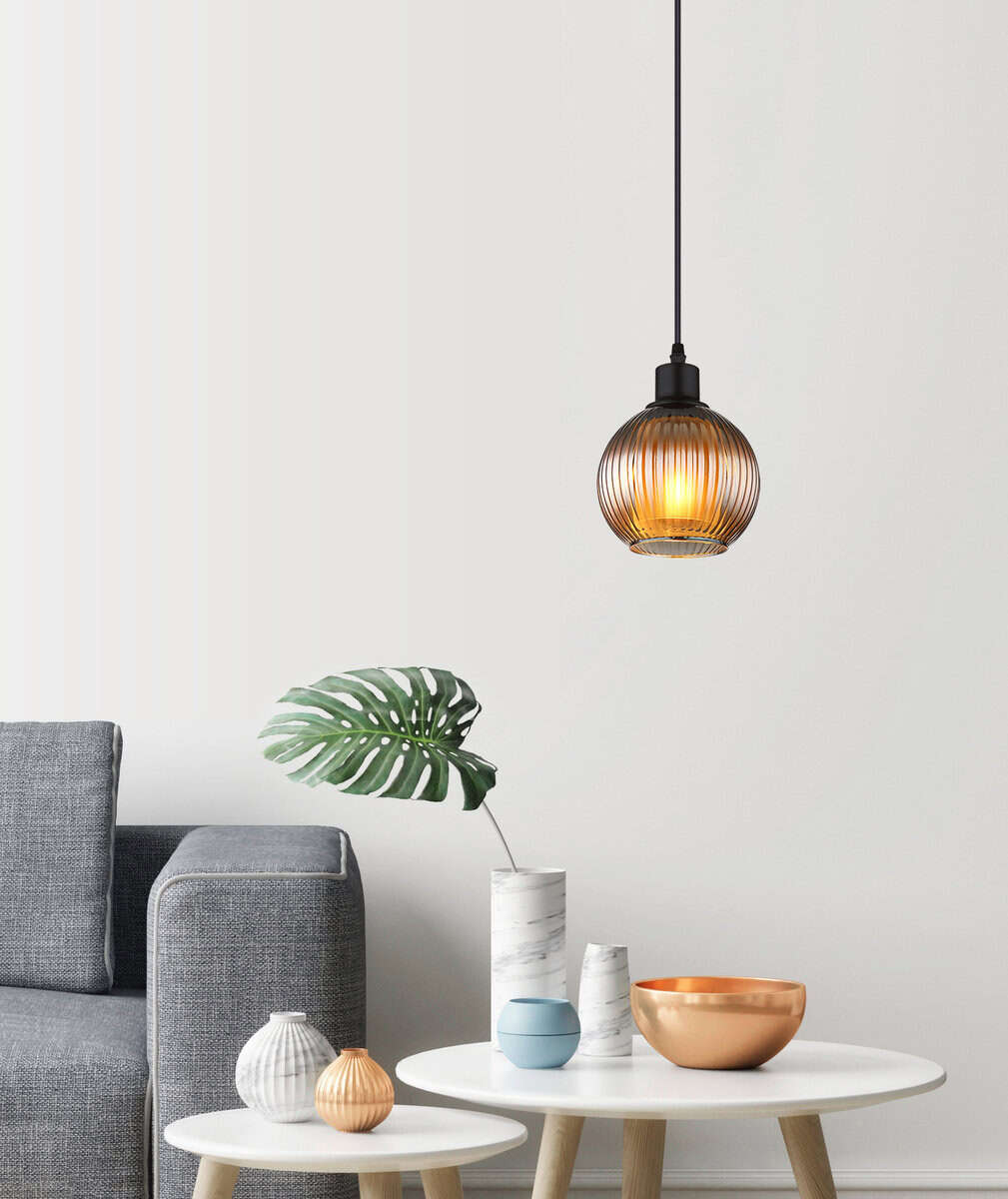 Okrugla visilica sa žljebljenom staklenom kuglom u benzinu je elegantan rasvjetni element za svaku prostoriju. Tijelo od mat crnog metala i staklena kugla od 150 mm daju svjetiljci moderan izgled. Žljebovi u staklenoj kugli stvaraju zanimljive svjetlosne efekte, a benzinska boja daje prostoriji toplu atmosferu. Staklena kugla je bijela sa unutrašnje strane kako bi se osigurala ravnomjerna distribucija svjetlosti. Sa grlom E27 i snagom od 25W, ova viseća lampa nudi dovoljno svjetla za vaše životne prostore. Bilo da se nalazi u dnevnom boravku, blagovaonici ili spavaćoj sobi, ova visilica sigurno će privući oči. Unesite modernu i elegantnu rasvjetu u svoj dom uz ovu okruglu privjesnu lampu od mat crnog metala i staklenu kuglu sa žljebovima u benzinu.
