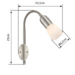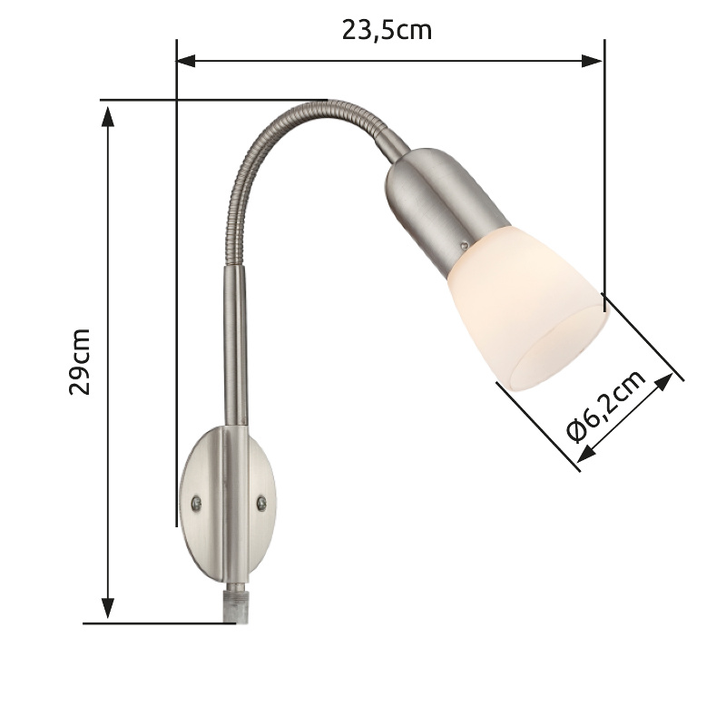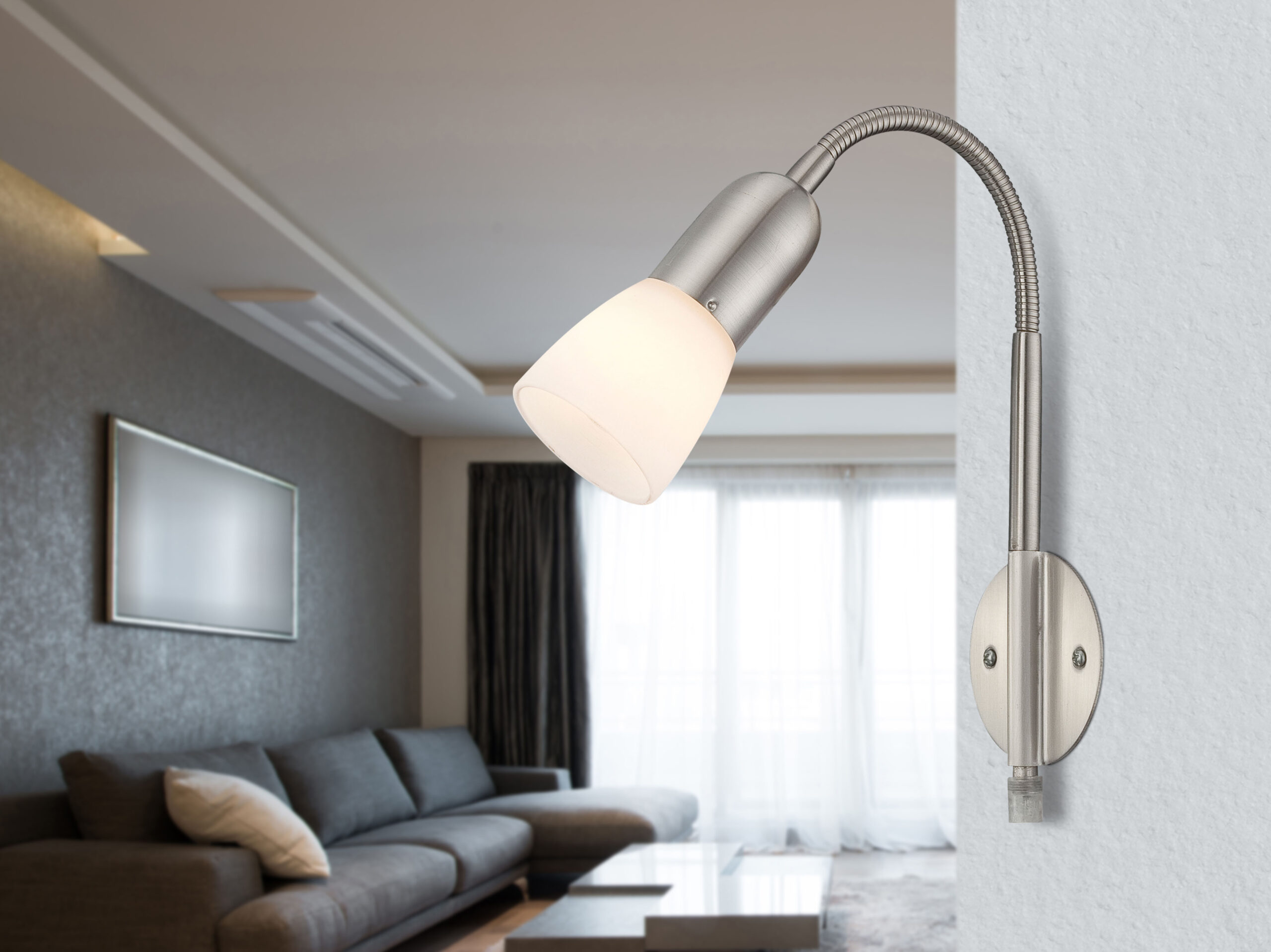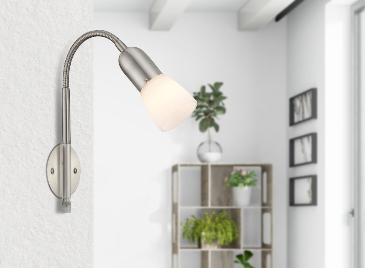 Cathy zidni reflektor, koji je očuvan u tradicionalnom stilu, ističe svojim izgledom i materijalom. Ovaj nikl-mat reflektor pričvršćen na fleksibilnu ruku ima 1,5 metara dug priključni kabel, što čini njegovu oblast primjene vrlo fleksibilnom. Zbog ugrađene E14 utičnice i slobodnog izbora izvora svjetlosti (maks. 40W), intenzitet svjetla i boju svjetla možete odrediti sami. Zbog uštede energije i dugovečnosti preporučujemo LED lampe.