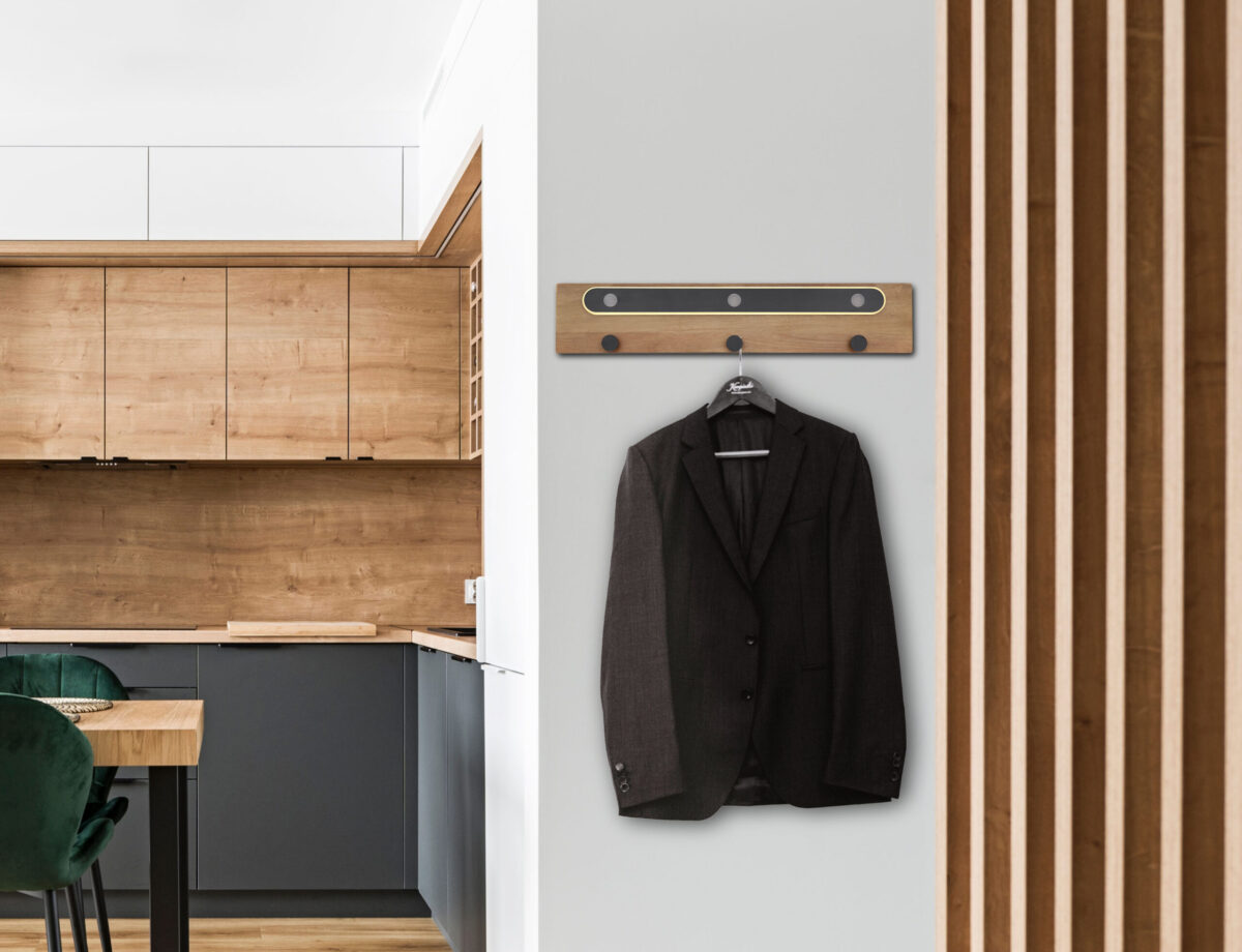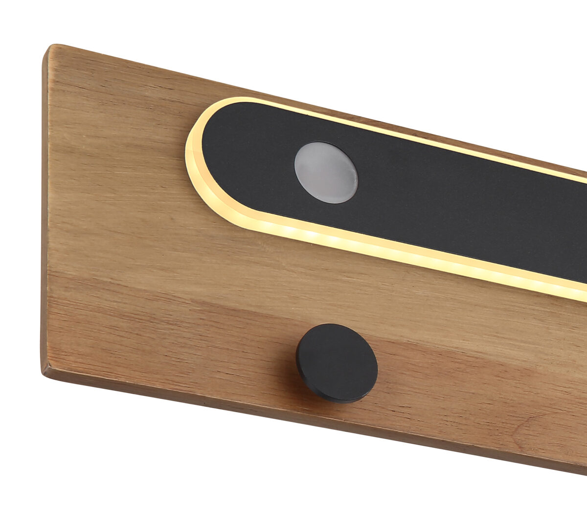 Naša pravokutna zidna polica CHASEY kombinira funkcionalnost sa stilskim dizajnom. Osim što je zgodno mjesto za odlaganje stvari, zidna polica ima i ugrađene kuke za kapute koje pružaju dodatni prostor za odlaganje. Telo CHASEY-a je izrađeno od mat crnog metala, crnog aluminijuma i tamno smeđeg drveta, što daje moderan i plemenit izgled. Sjenilo je izrađeno od opalnog akrilnog stakla i crne plastike, što osigurava ujednačeno osvjetljenje bez odsjaja. Sa širinom od 650 mm i izbočenjem (AL) od 48 mm, zidna polica se skladno uklapa u široku paletu koncepta prostorija. Nudi izlaz od 450 lumena i ima temperaturu boje od 3000K, što proizvodi toplo i ugodno svjetlo. Kuke za kapute CHASEY mogu nositi do 5 kg svaka, što vam omogućava da bezbedno okačite odjeću ili druge predmete. Unesite funkcionalnost i stil u svoj dom pomoću zidne police CHASEY i koristite je kao praktičnu površinu za odlaganje s integriranim osvjetljenjem.